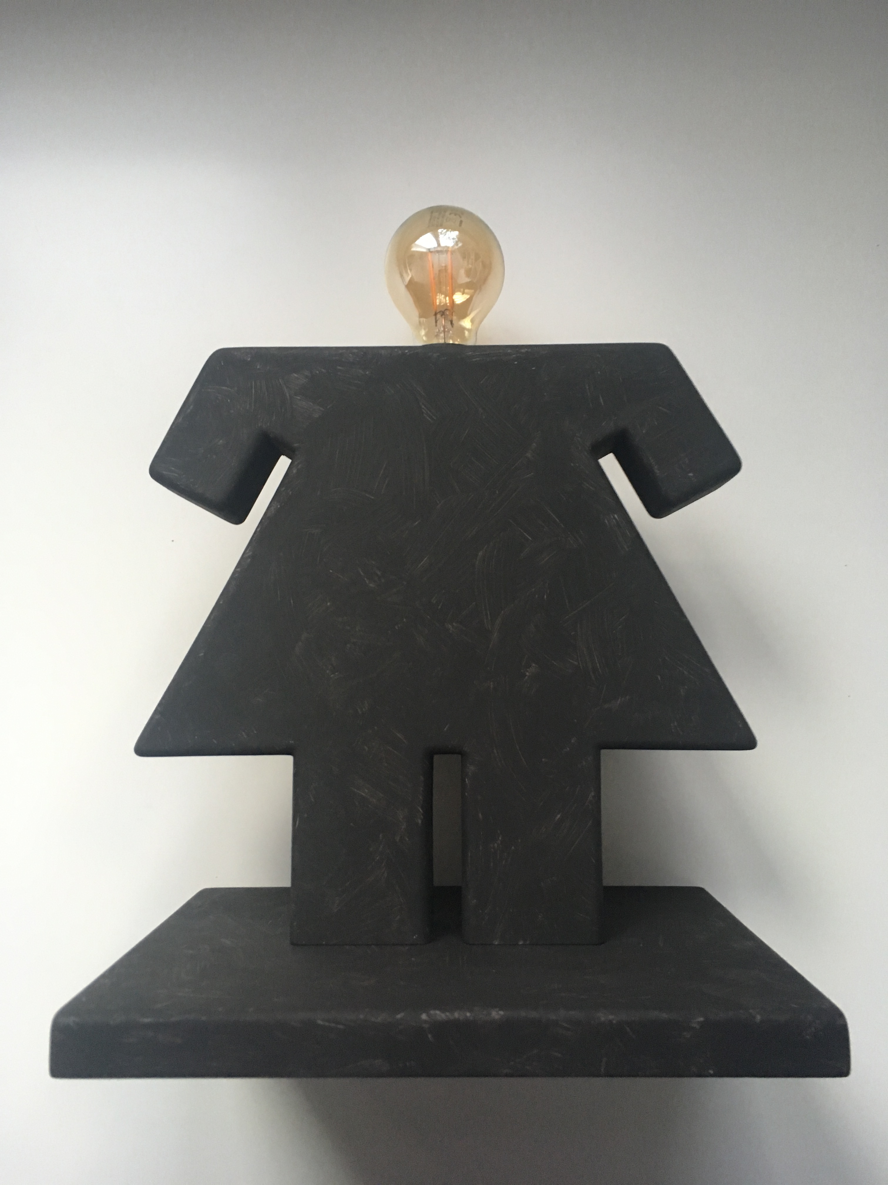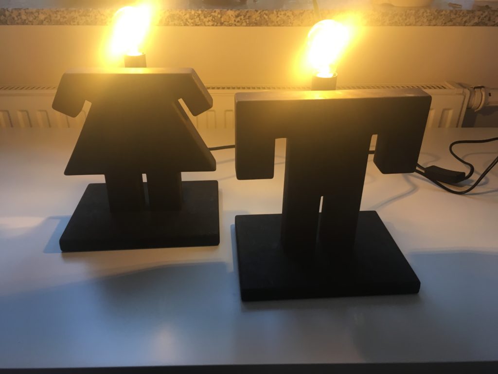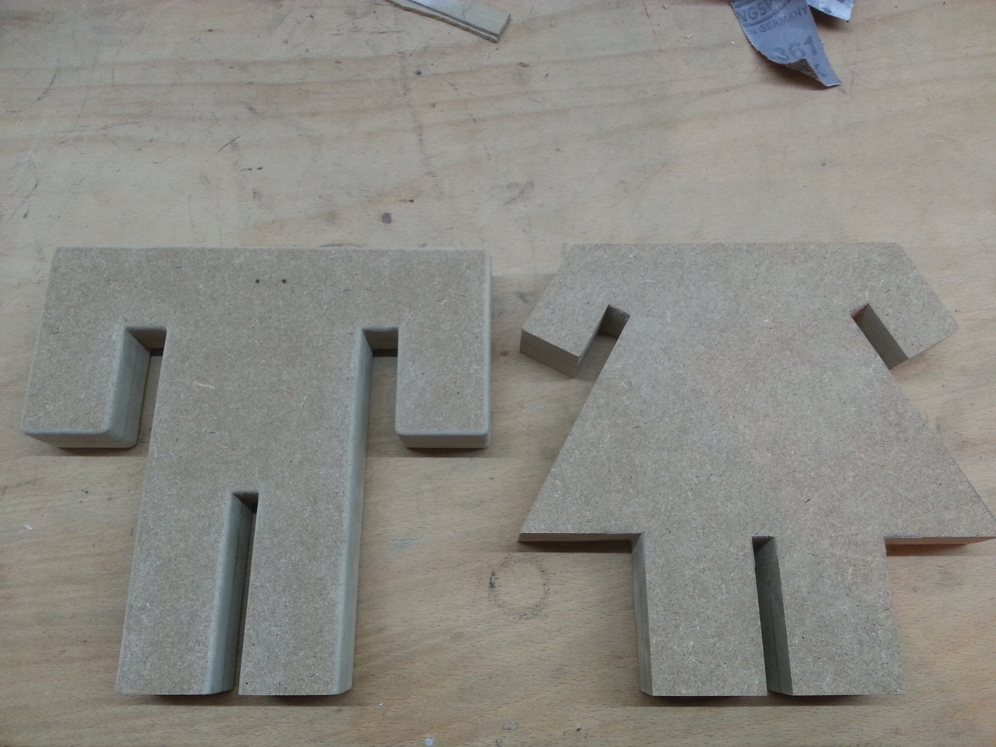 Die Grundstruktur der Figuren wurde aus zwei verleimten MDF-Platten hergestellt. Die Kontur in männlicher und weiblicher Form wurde ausgesägt und anschließend mit einem Radius versehen. Um die MDF-Oberfläche zu glätten wurde Spritzspachtel verwendet und anschließend geschliffen und gestrichen. Die Beleuchtung geschieht über einen Lampensockel (e14) und eine LED-Birne.