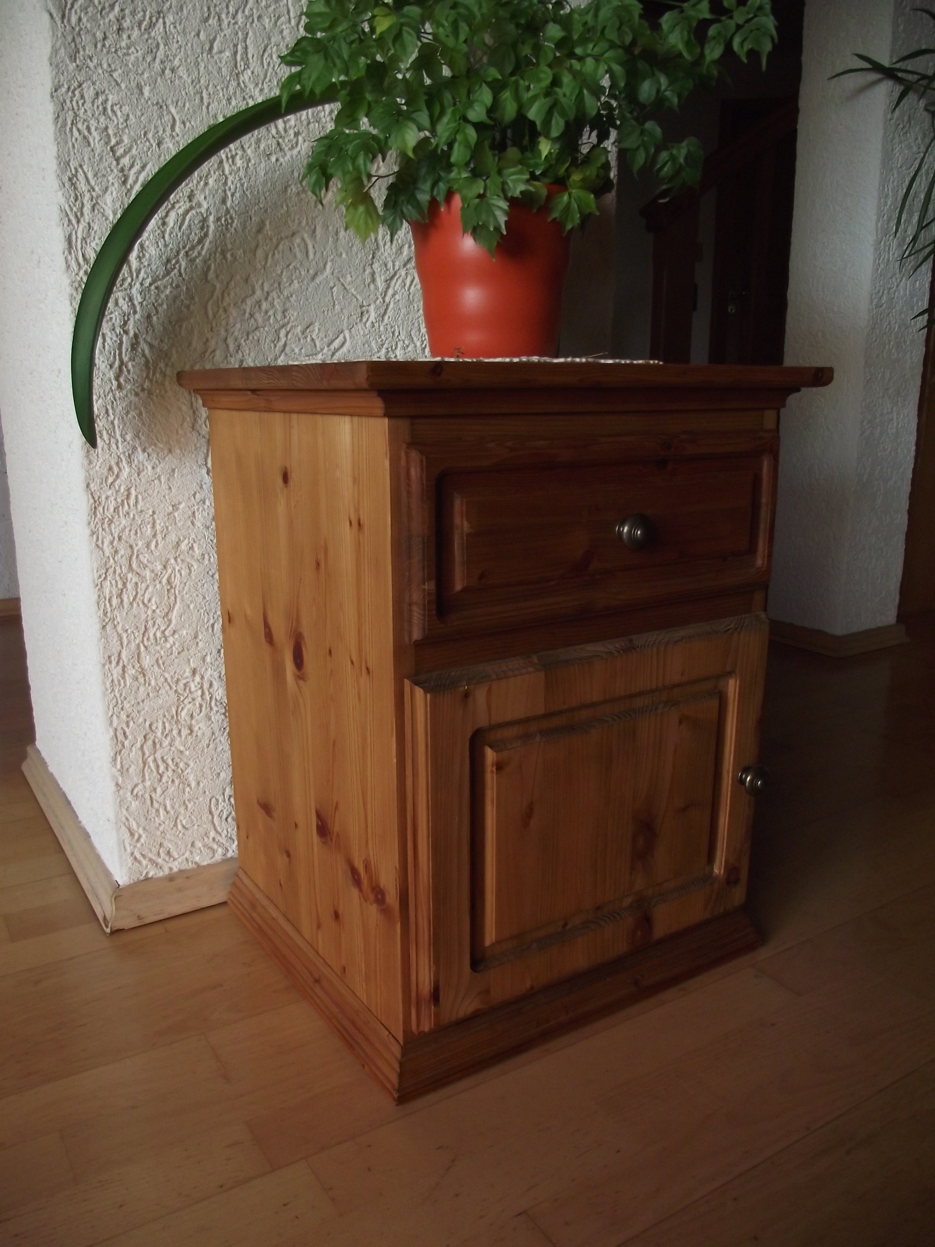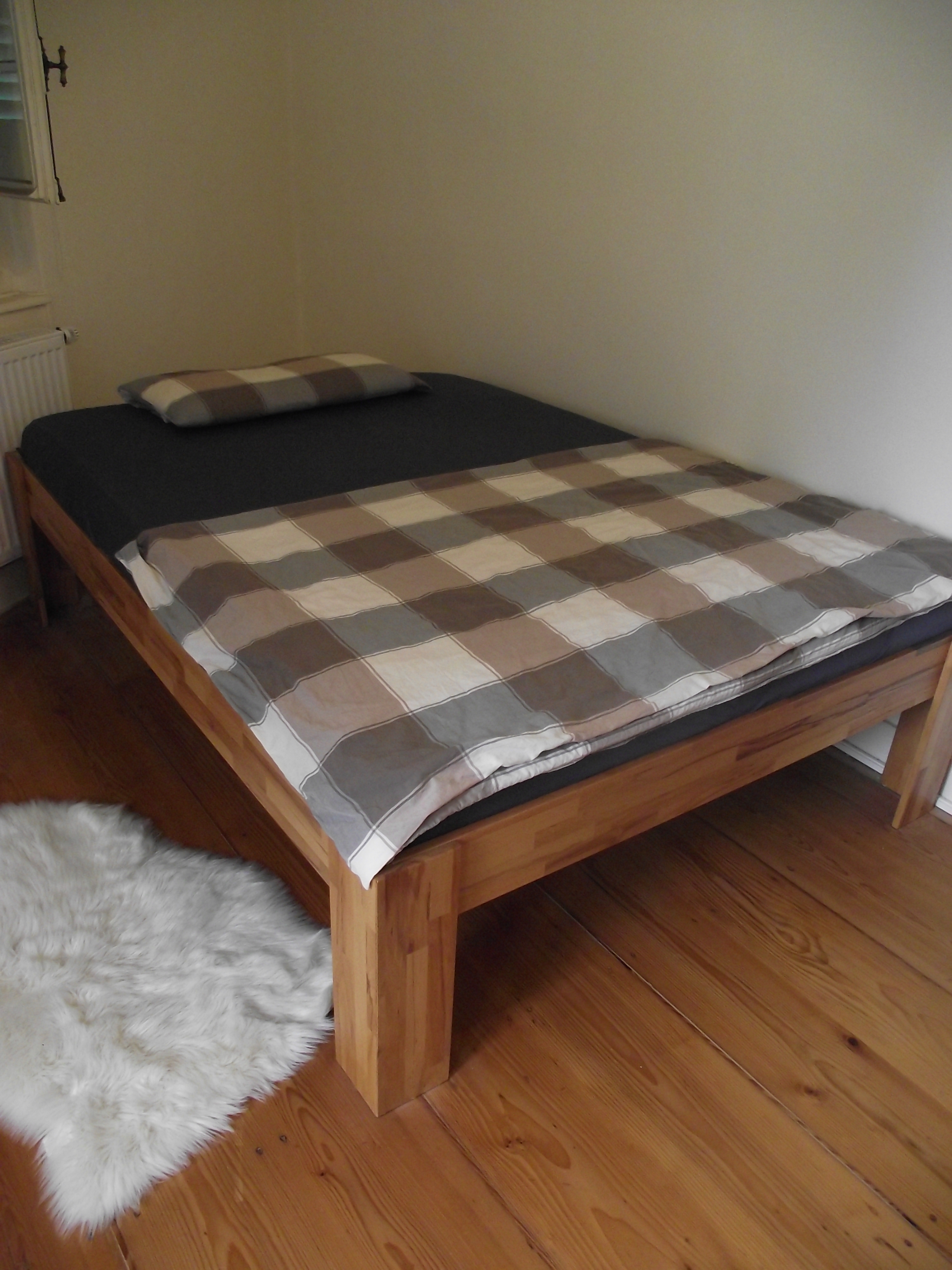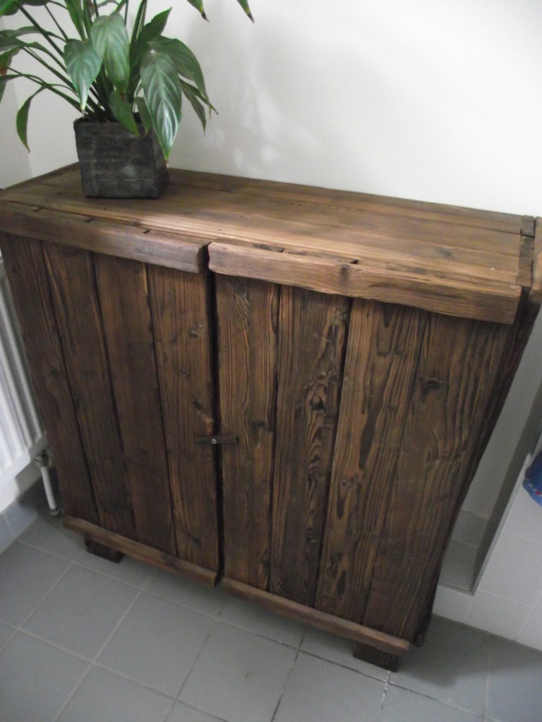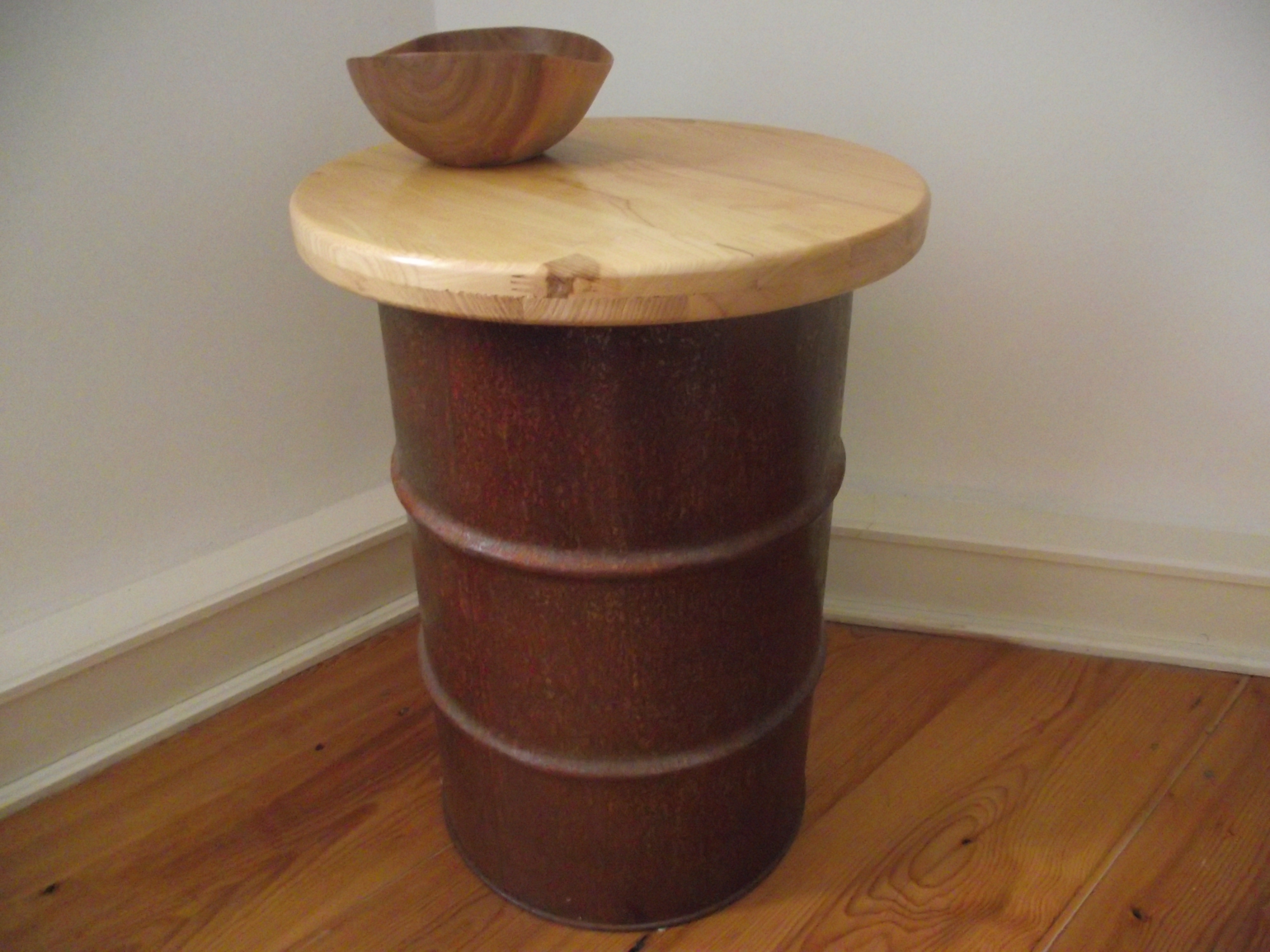 Der untere Teil des Tisches besteht aus einem kleinen Fass welches abgeschliffen und dann rosten gelassen wurde. Anschließend wurde es klarlackiert. Die Platte ist aus Eschen-Leimholz gerfertigt.