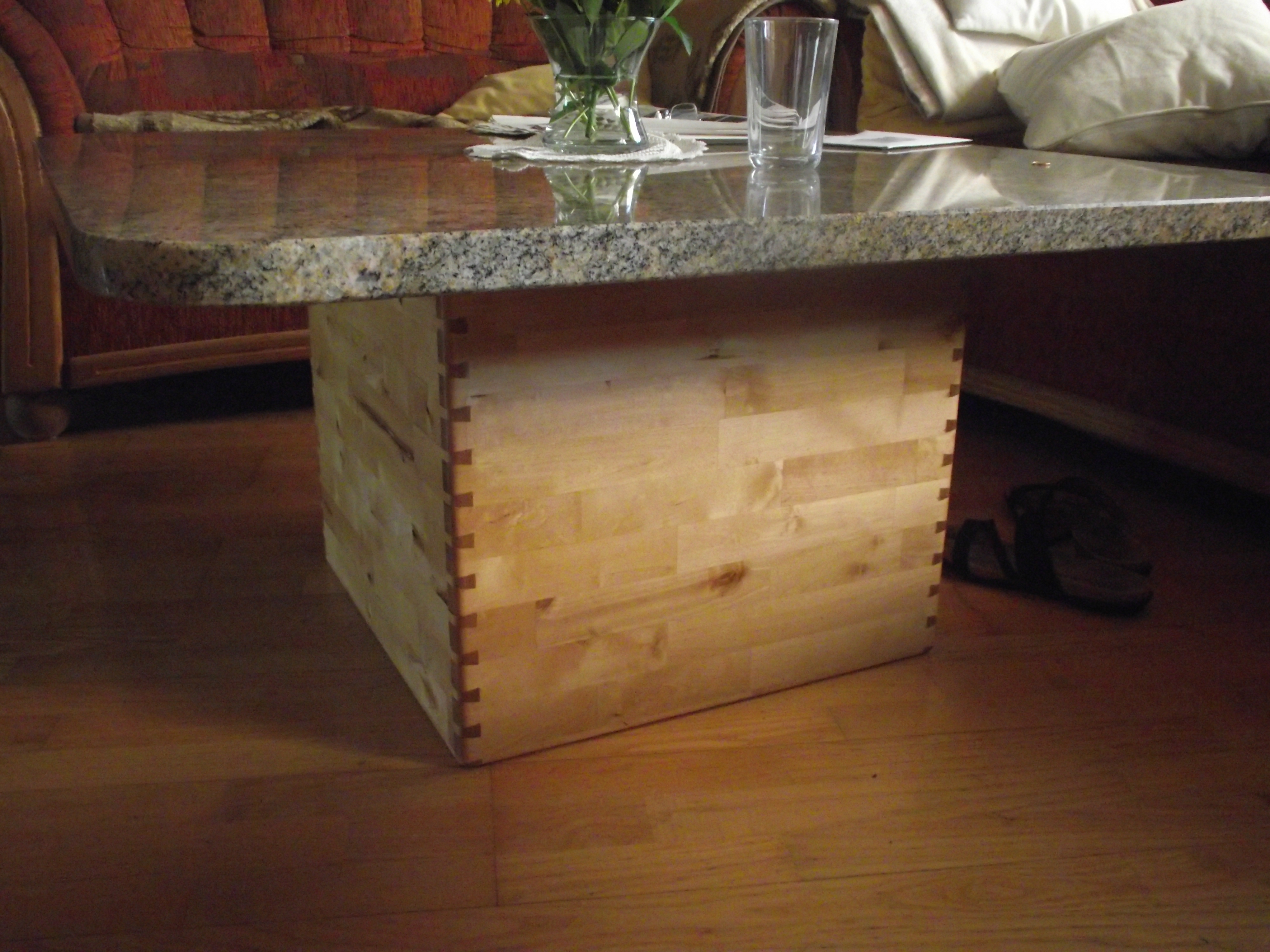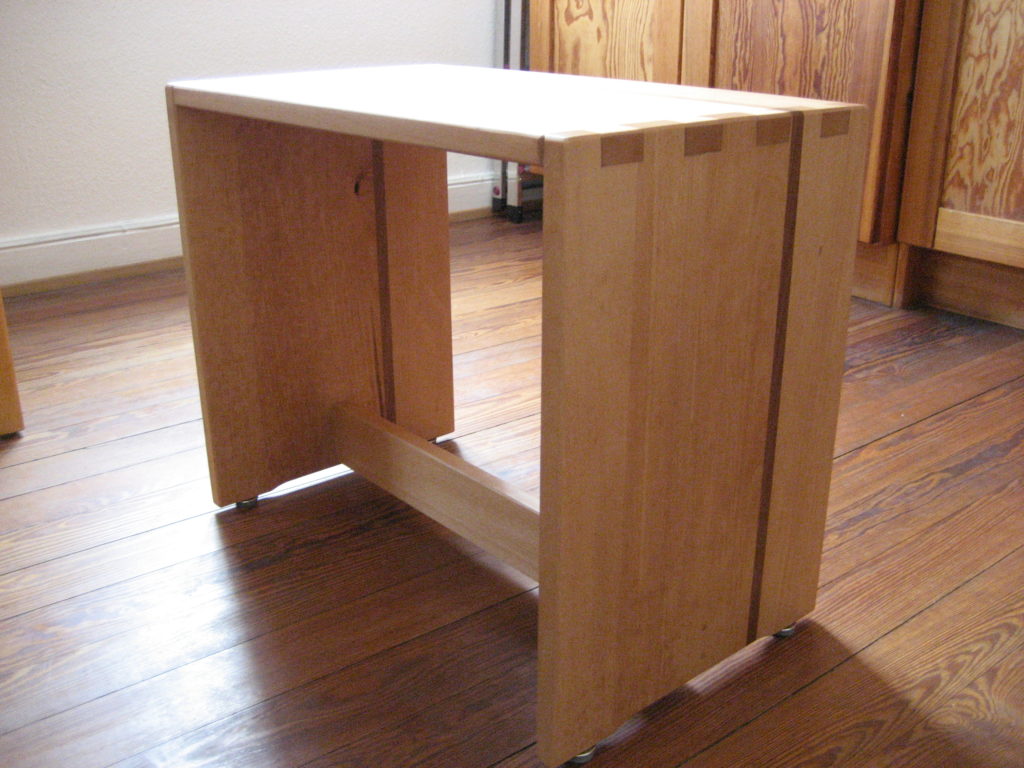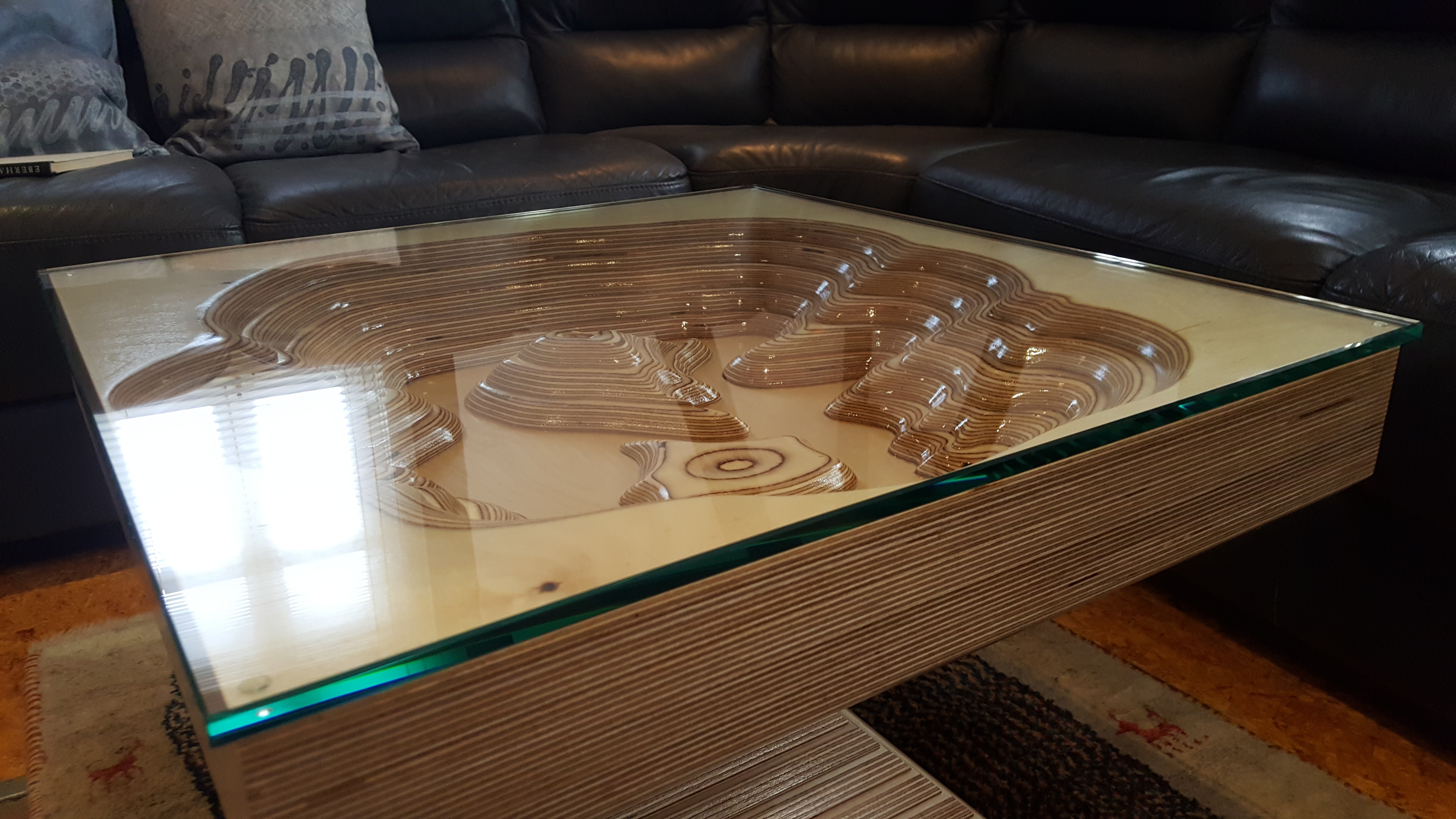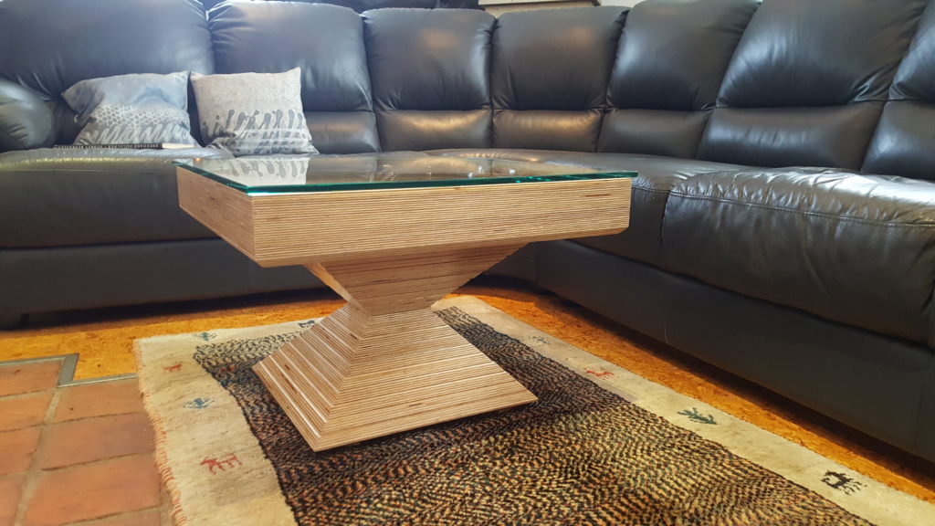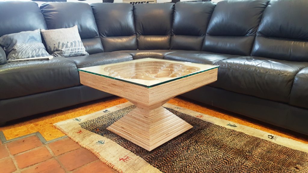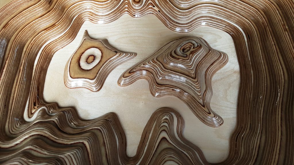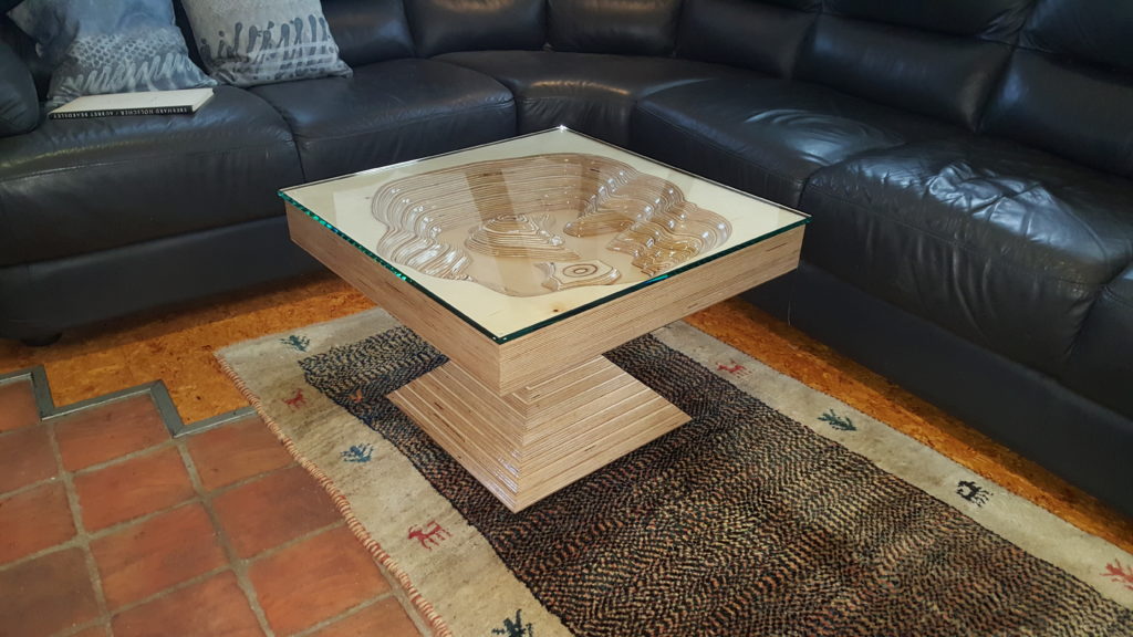 Der Tisch wurde aus Birke – Multiplex angefertigt. Der stufenförmige Fuß im 15 mm Raster besteht aus 20 Platten, Grundmaß ist 400 mm x 400 mm. Durch ein Raster von 30 mm entsteht in der Mitte des Fußes ein Maß von 130 mm x 130 mm, danach gehen die Stufen wieder in umgekehrter Form nach oben. Die Höhe des Fußes beträgt 30 0mm. Die Kanten sind auf 45° gefräst, wodurch eine elegante Linie entsteht. Um Transporte und Umstellungen zu erleichtern, wurden die Platten im Inneren auf ein Maximum ausgeschnitten, dadurch wurde enorm an Gewicht eingespart. In den oberen zwei Platten im Fuß sind passgenaue Ausschnitte eingelassen, die Tischplatte, mit dem entsprechenden Gegenstück auf der Unterseite, lässt sich so ohne Werkzeug perfekt montieren. Die Tischplatte besteht aus einigen Besonderheiten: Durch sechs unterschiedliche übereinander ausgearbeitete Platten entsteht in mühevoller Kleinarbeit eine Landschaft aus Holz, deren Varianten unendlich sind.