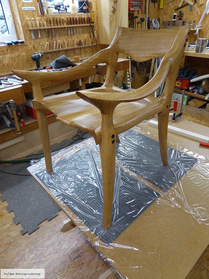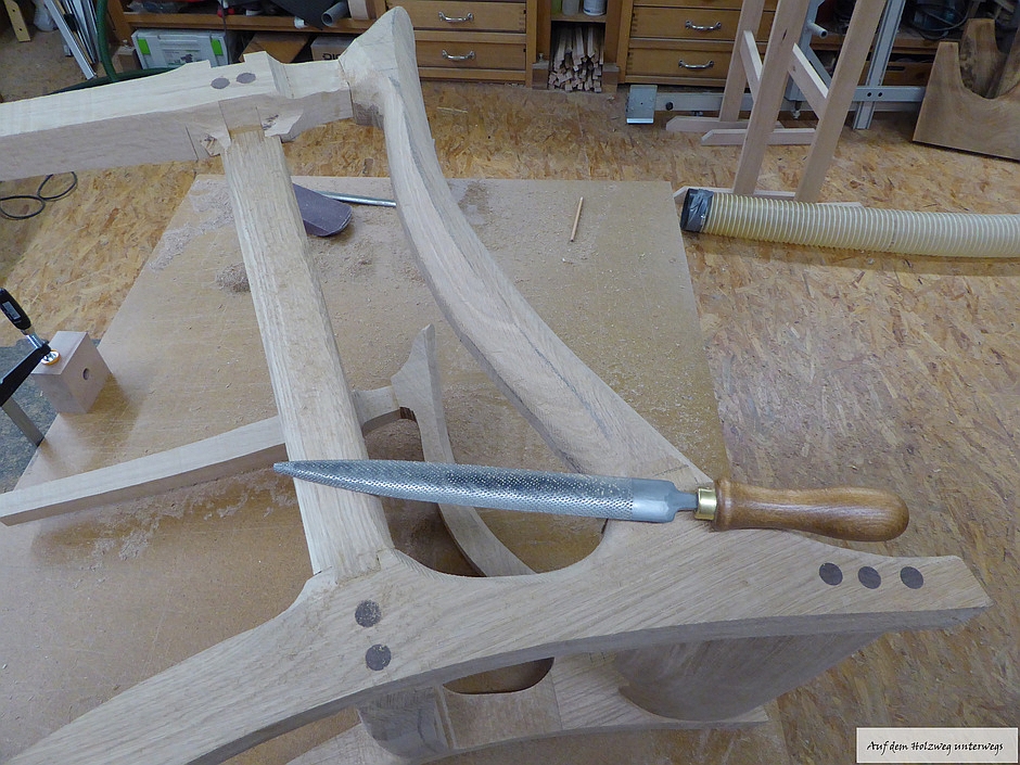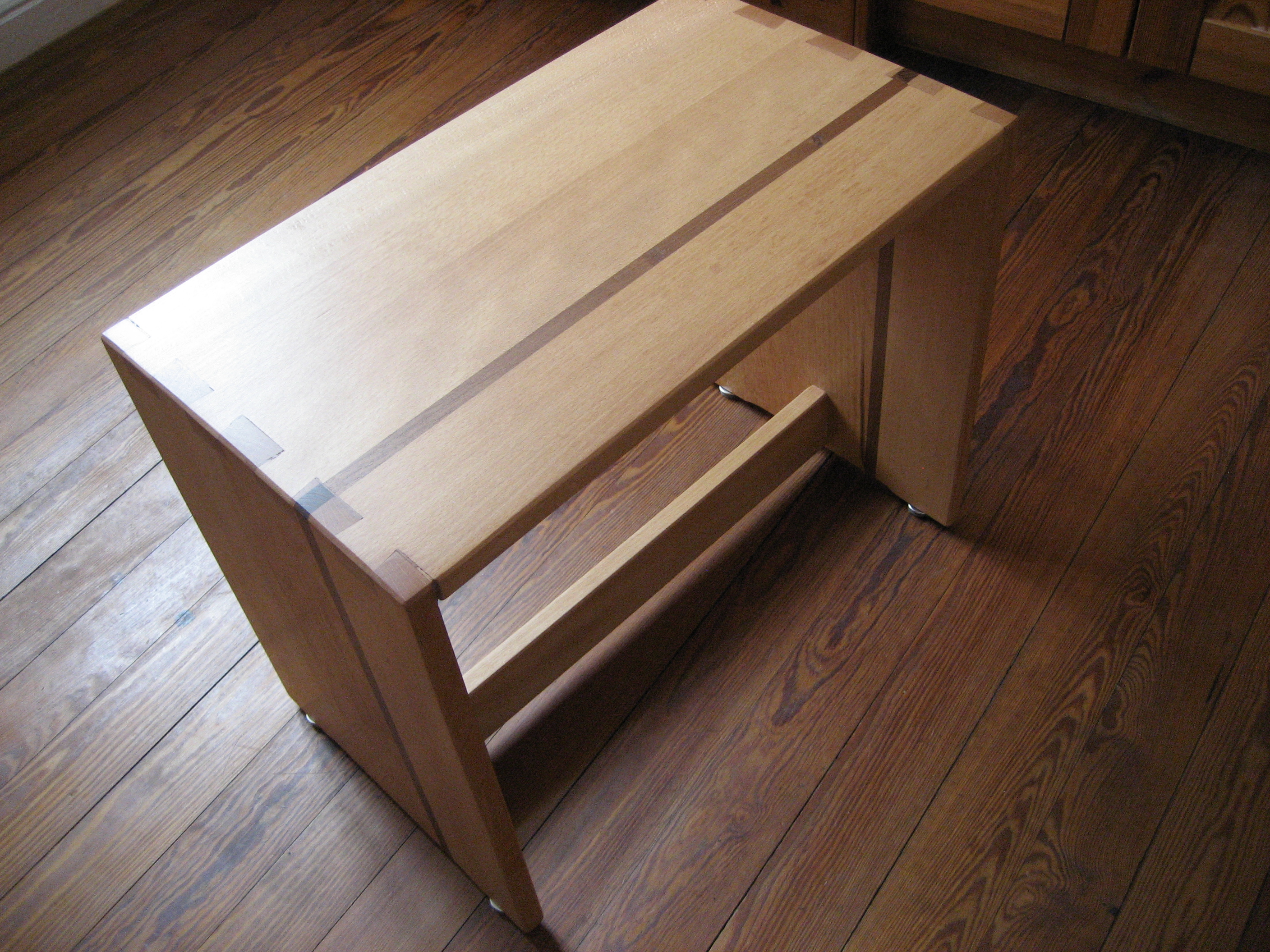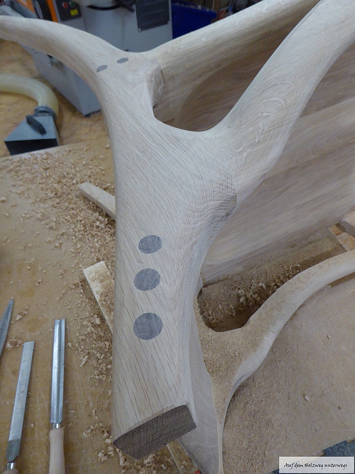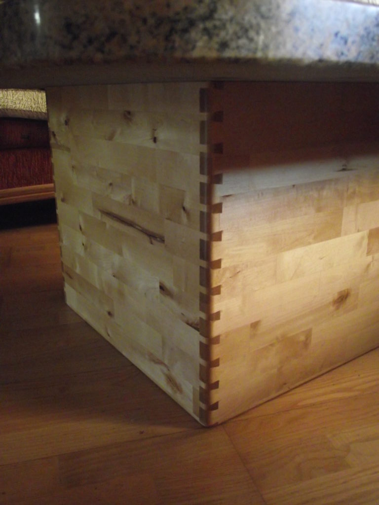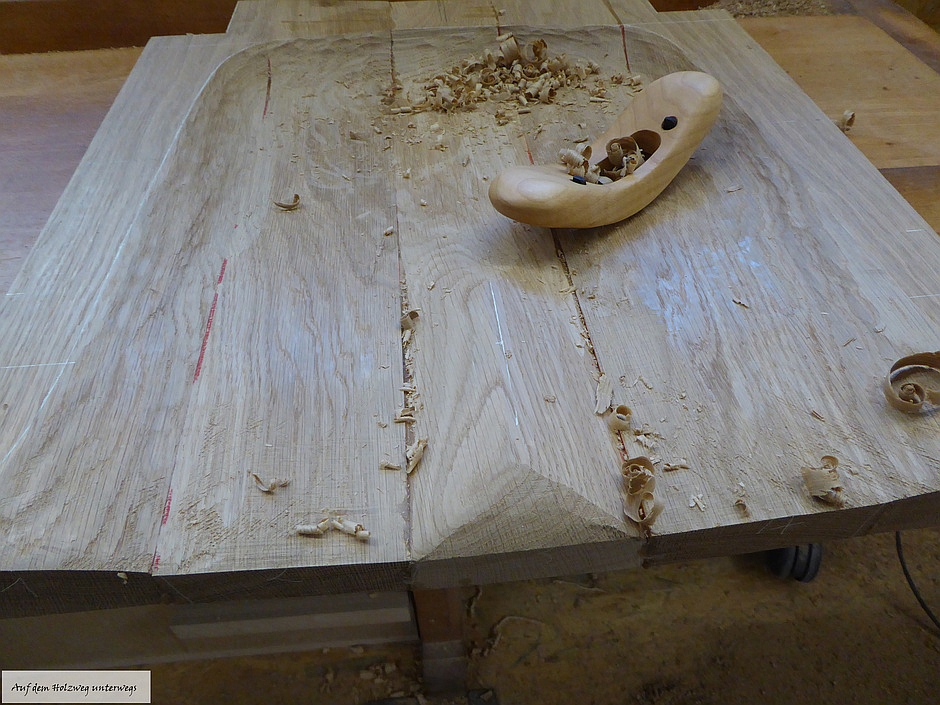 Der Tisch wurde aus Birke – Multiplex angefertigt. Der stufenförmige Fuß im 15 mm Raster besteht aus 20 Platten, Grundmaß ist 400 mm x 400 mm. Durch ein Raster von 30 mm entsteht in der Mitte des Fußes ein Maß von 130 mm x 130 mm, danach gehen die Stufen wieder in umgekehrter Form nach oben. Die Höhe des Fußes beträgt 30 0mm. Die Kanten sind auf 45° gefräst, wodurch eine elegante Linie entsteht. Um Transporte und Umstellungen zu erleichtern, wurden die Platten im Inneren auf ein Maximum ausgeschnitten, dadurch wurde enorm an Gewicht eingespart. In den oberen zwei Platten im Fuß sind passgenaue Ausschnitte eingelassen, die Tischplatte, mit dem entsprechenden Gegenstück auf der Unterseite, lässt sich so ohne Werkzeug perfekt montieren. Die Tischplatte besteht aus einigen Besonderheiten: Durch sechs unterschiedliche übereinander ausgearbeitete Platten entsteht in mühevoller Kleinarbeit eine Landschaft aus Holz, deren Varianten unendlich sind.