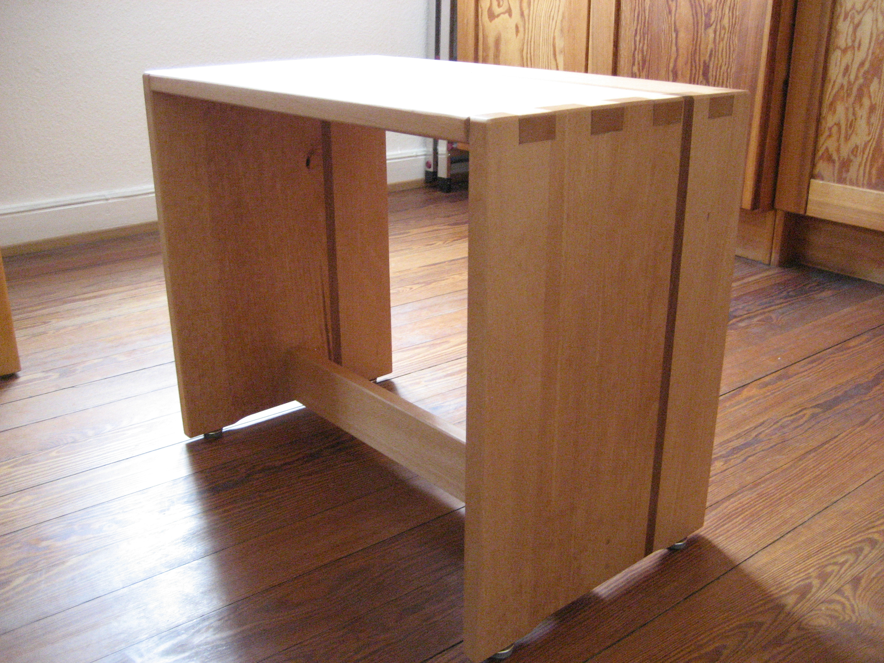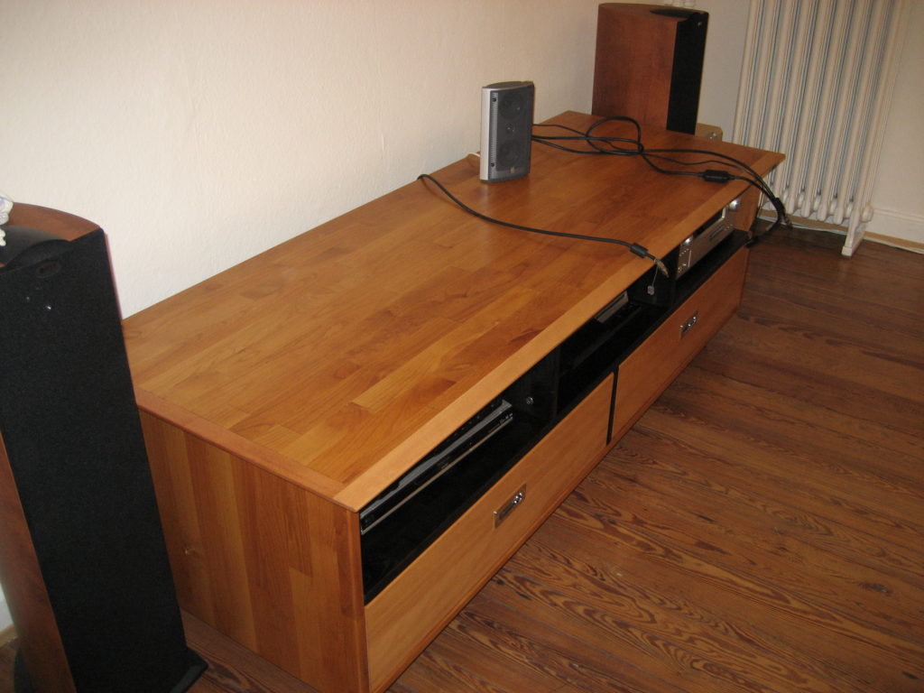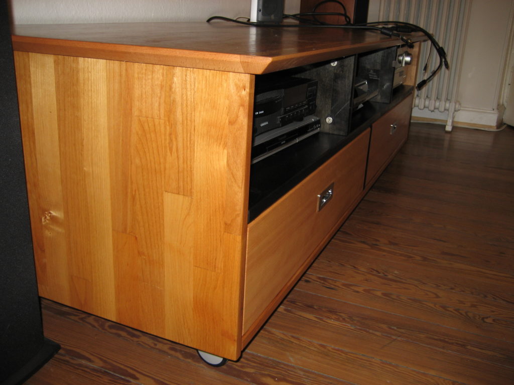 Rollbarer Medienschrank mit 3 Fächern und 2 Schubladen aus Erle-Leimholz mit massiven Buchenanleimern; Maße 2100x500x500 mm; mehrfach geölt und gewachst, mittlerer Boden und senkrechte Fach-teiler schwarz gebeizt; das Möbel ist in 11 hölzerne Teile zerlegbar