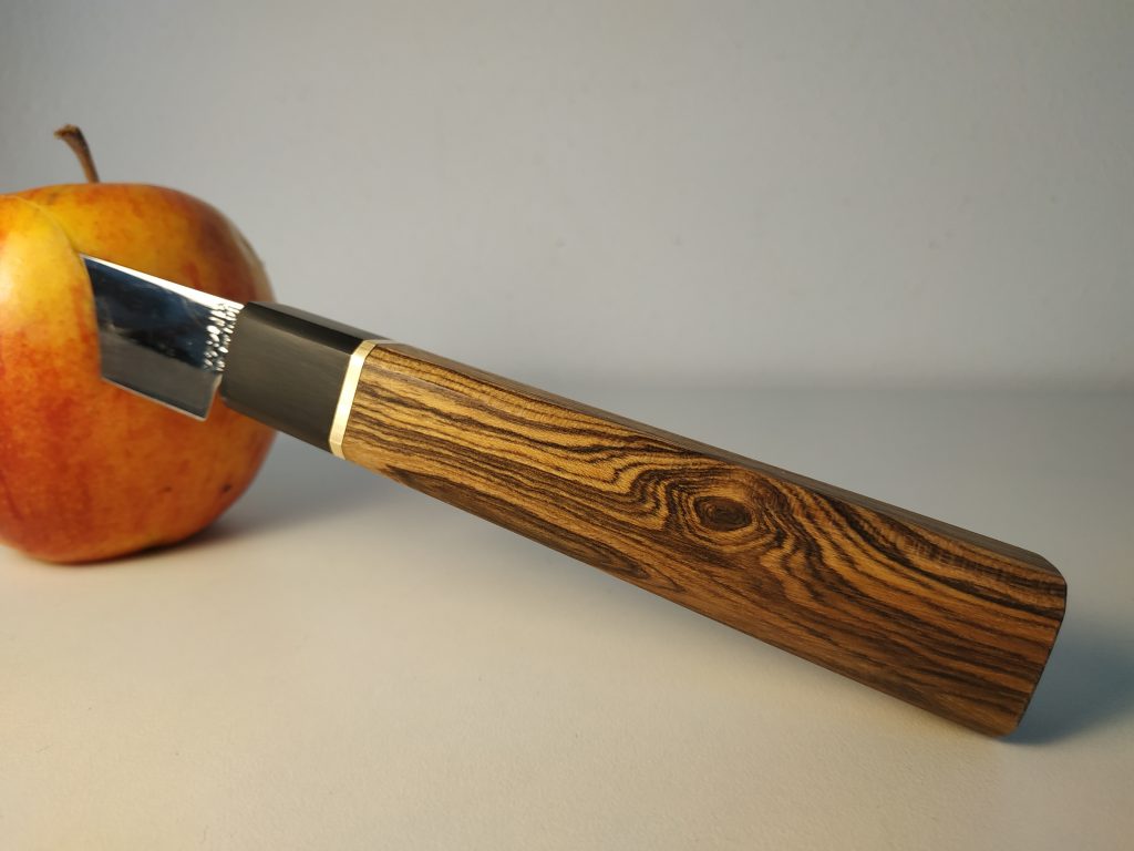 Aus dem Dictum Klingenrohling Petty wurde dieses schöne kleine Messer angefertigt. Der Griff ist aus Bocote, hat einen Spacer aus Messing und eine Zwinge aus Büffelhorn. Er wurde bis Korn 2000 geschliffen und mit Bienenwachs poliert.