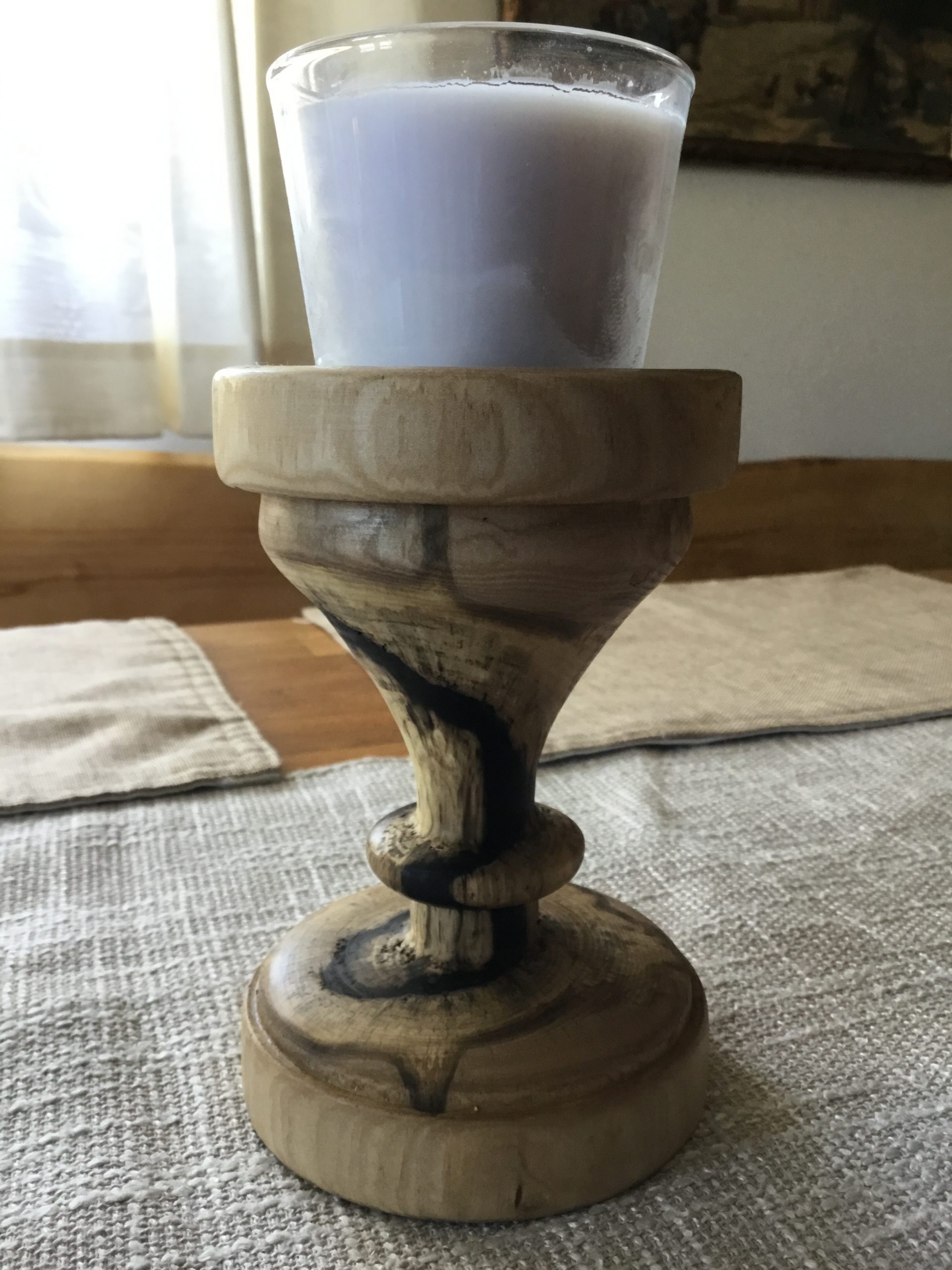 Der Sockel wurde aus Esche (gestockt) gedrechselt. Nach dem Schleifen wurde die Oberfläche mit Danish Öl behandelt.