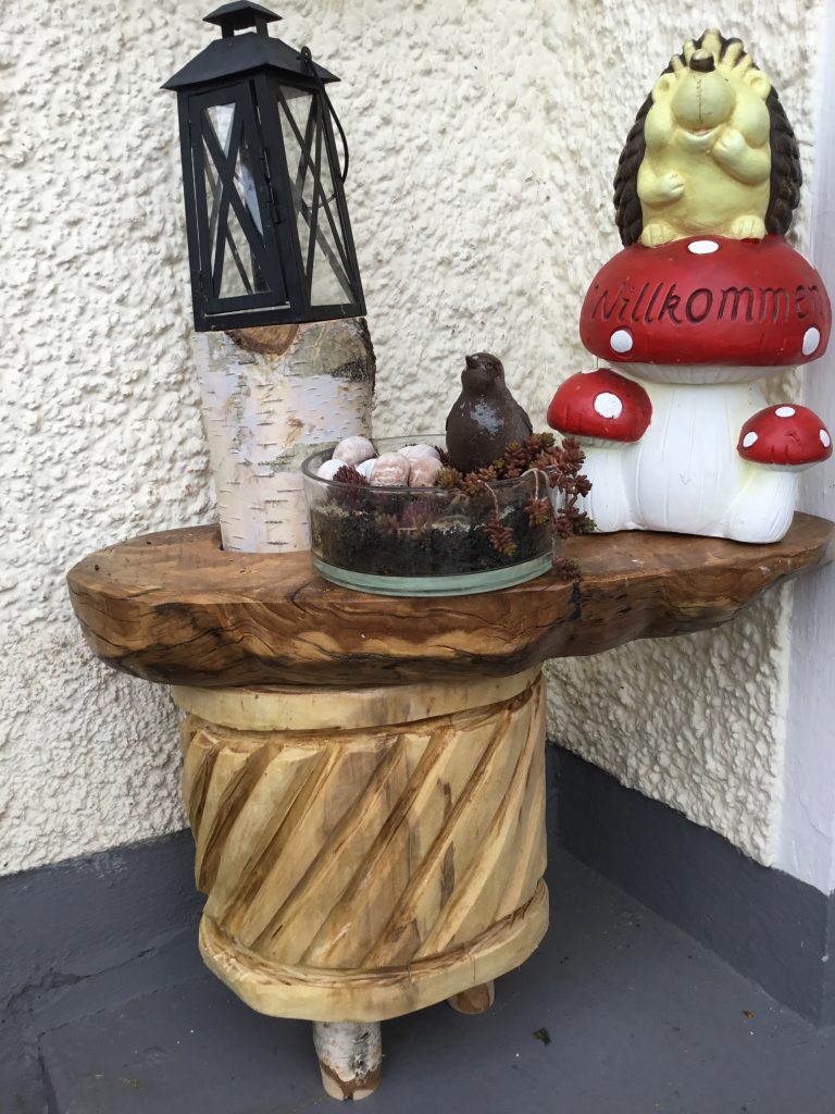 Der Sockel aus Lindenholz wurde mit einer Kettensäge modelliert und anschließend mit Danish Öl behandelt. Die Tischplatte ist Schwemmholz (nach einem Hochwasser an einem Flussufer gefunden), auch mit Danish Öl behandelt.