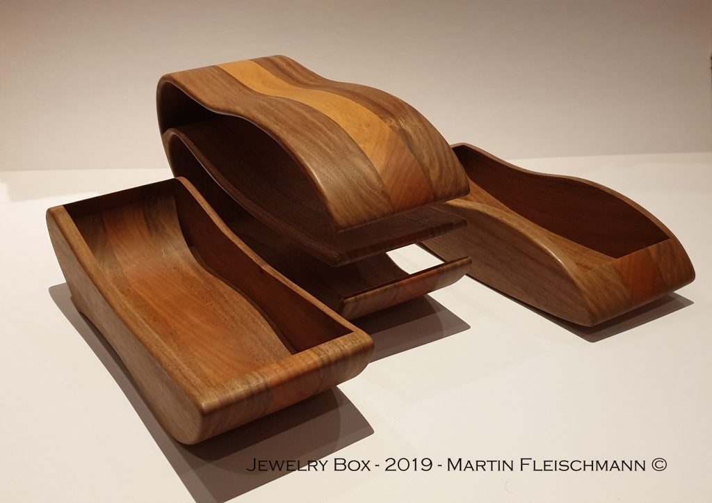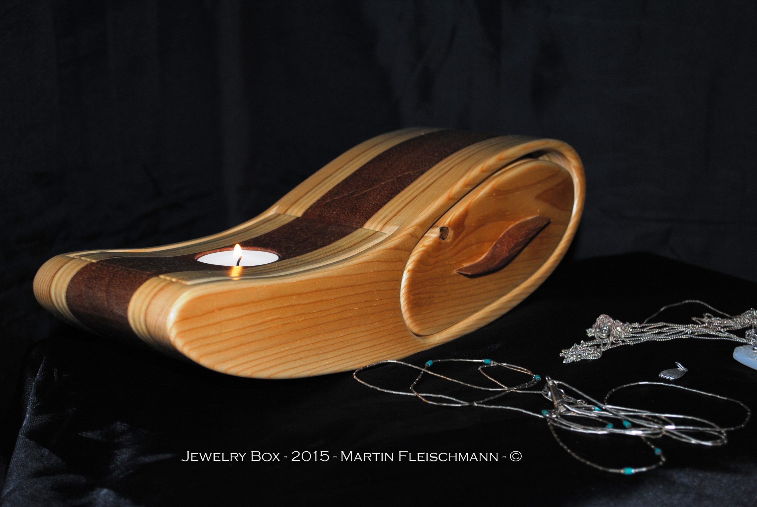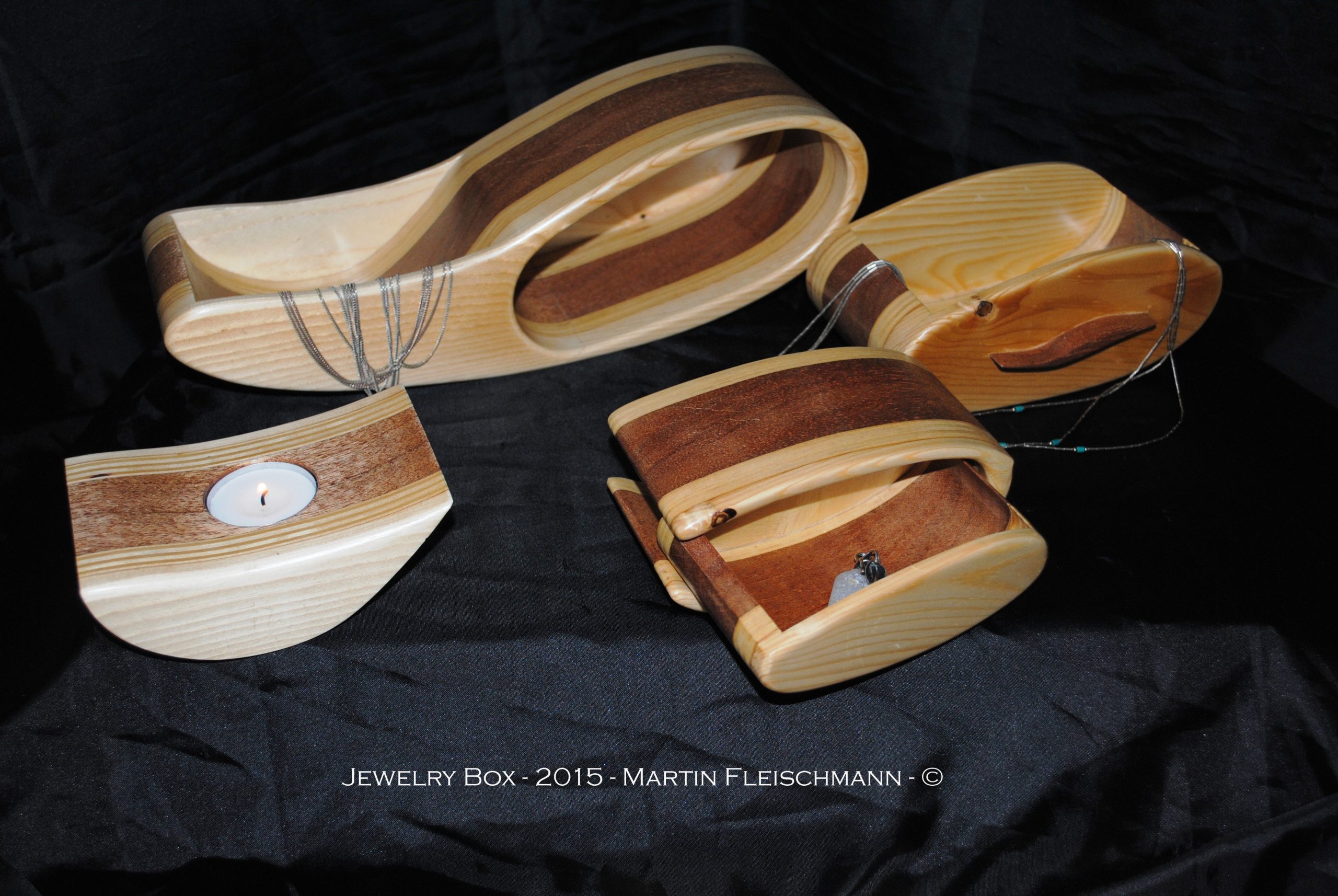 Das Schmuckkästchen ist aus fünf verschiedenen Schichten Holz angefertigt. Lärche, Birke Multiplex, Meranti, Birke Multiple x und Lärche. Zusätzlich ist ein herausnehmbarer Teelichthalter integriert, sowie ein zweites Schmuck – Kästchen in der ersten Schublade. Konstruktionsbedingt lässt sich die erste Schublade nur nach vorne herausnehmen.