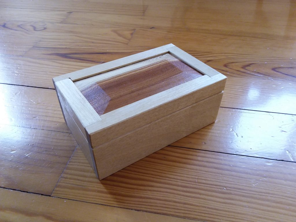 Eine kleine Schautulle aus Holz (14 x 9 x 5 cm). Der Korpus besteht aus Buche, die Eckverbindungen sind gefalzt. Der Boden besteht aus Sperrholz, in den Korpus eingenutet. Die Füllung des Deckels besteht aus einem Stück Pflaume, ebenfalls eingenutet. Die Oberfläche wurde mit Schellack behandelt (keine Politur, sondern mit Pinsel aufgestrichen).