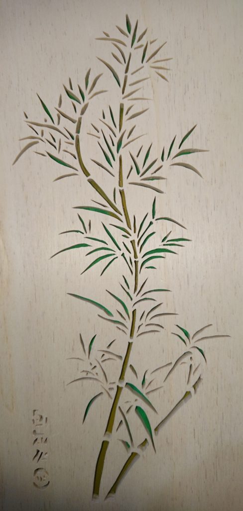 Diesen Bambuszweig soll ein Samurai Krieger gemalt haben, ich habe ihn in 6 mm Pappelsperrholz dekupiert und farblich hinterlegt.