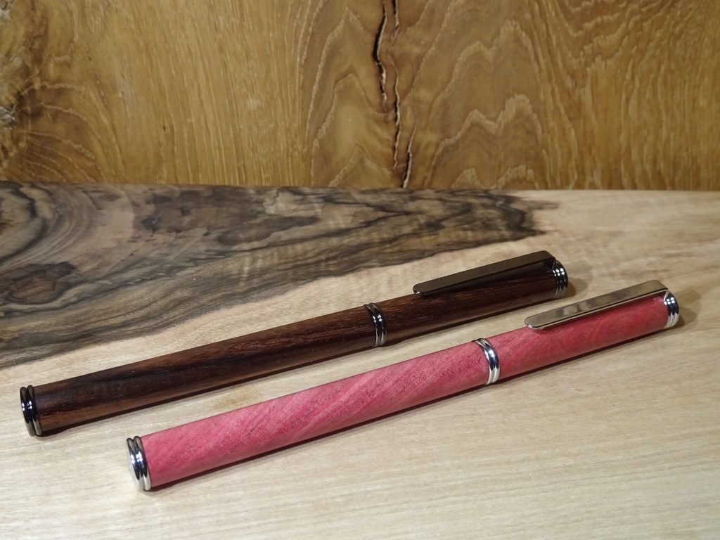 Die Endbehandlung erfolgte mit einem Schellack-Wachs. Der hintere ist aus einem Stück Palisander entstanden, der vordere aus einem Stück Pink Ivory, das ich bei DICTUM gekauft habe.