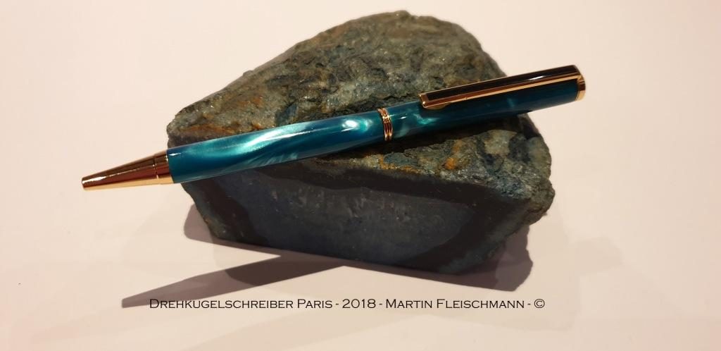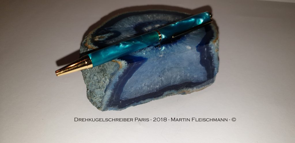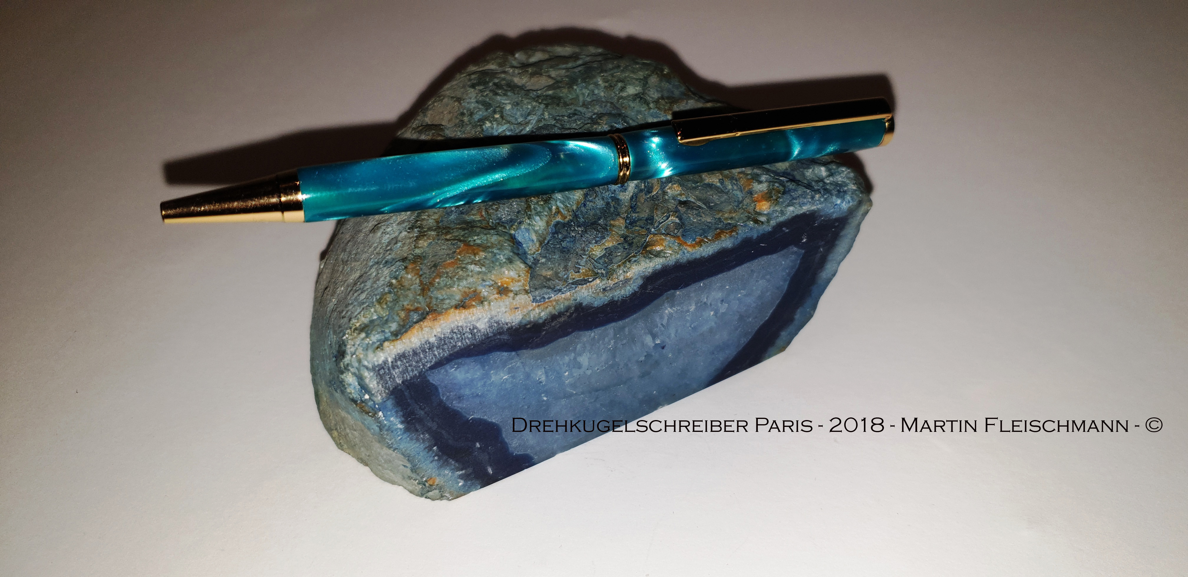 Acryl – Türkis Perlglanz Kugelschreiber Paris (DICTUM 730491) ist aus Acryl (DICTUM 831633) gedrechselt und mit einer 24K-Goldbeschichtung versehen.