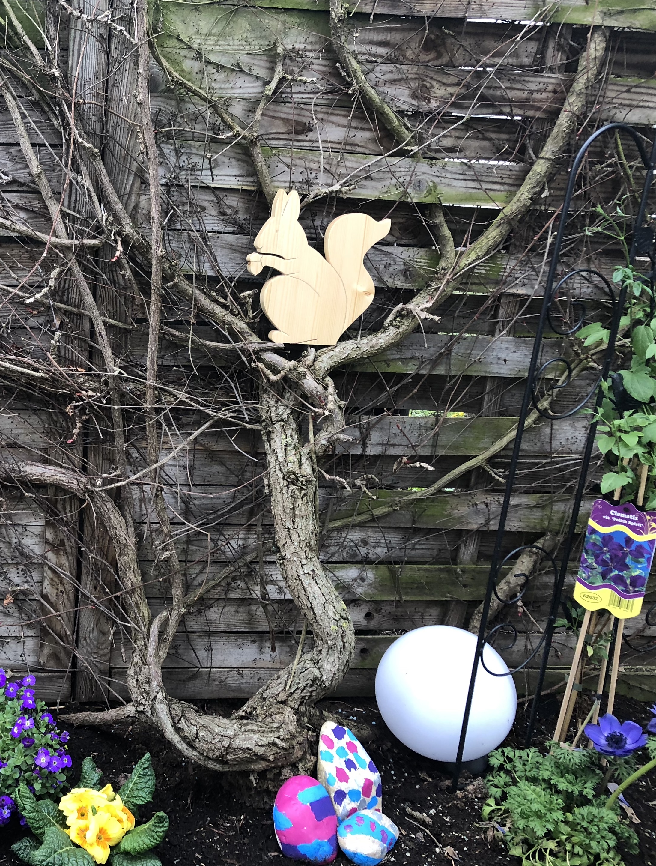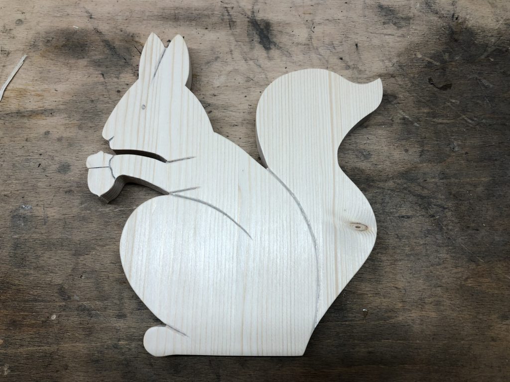 Das Eichhörnchen besteht aus einer Kiefernholz-Platte, die entsprechend der Form außen zugesägt wurde. Zudem wurden Konturen mit einem Stechbeitel eingearbeitet.