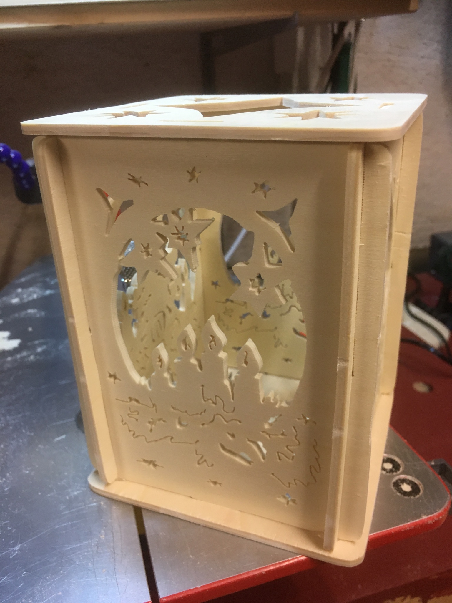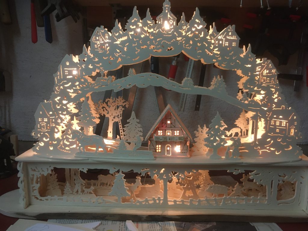 Der Lichterbogen wurde aus 4mm Pappelsperrholz mit einer Hegner-Dekupiersäge ausgeschnitten,anschließend mit der Tischwalzenschleifmaschine von Hegner nachgearbeitet