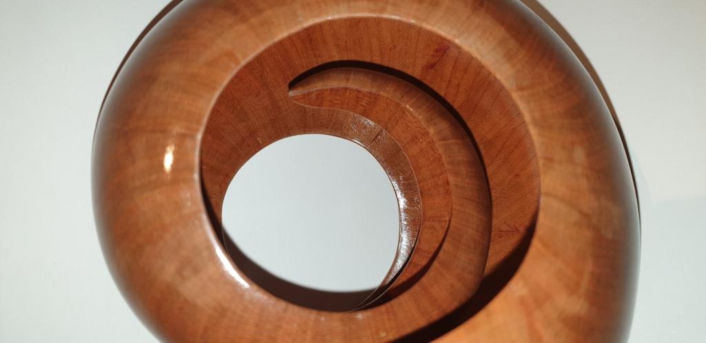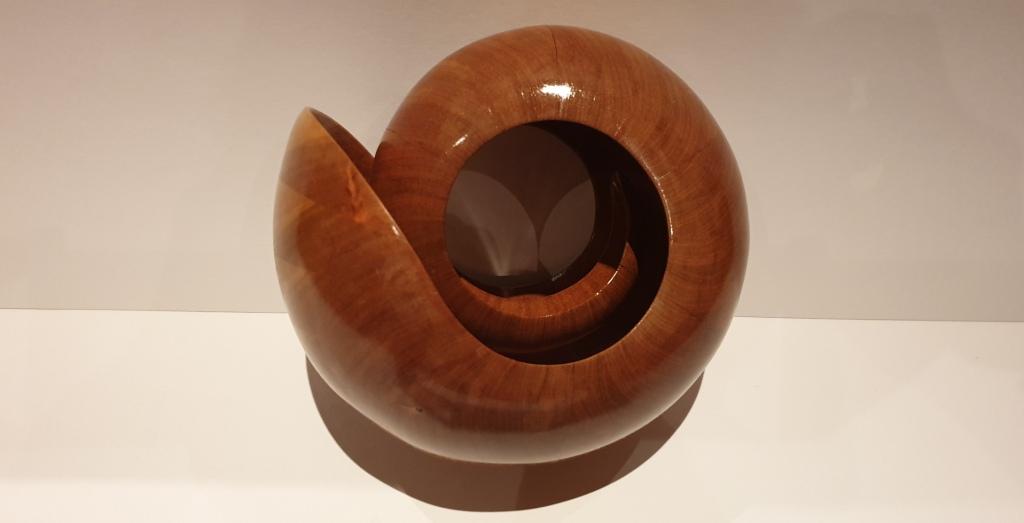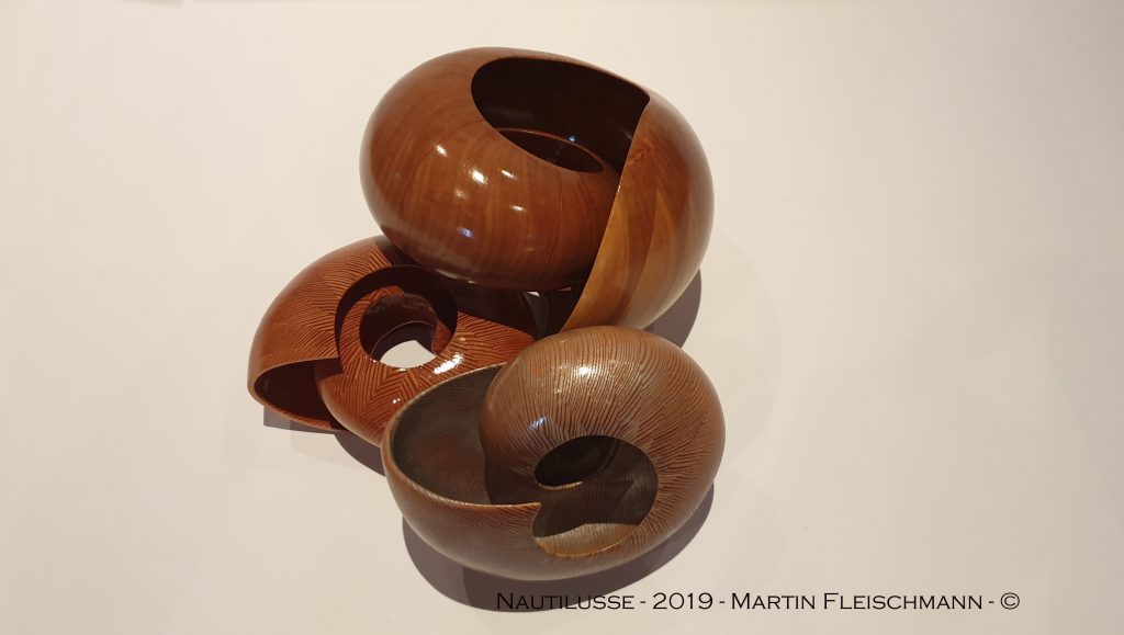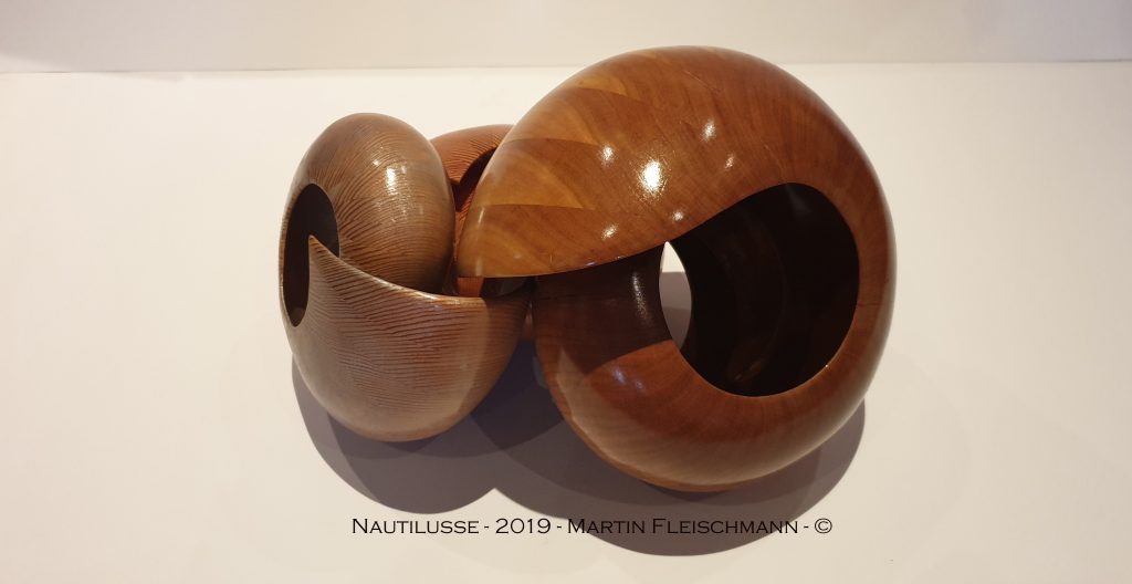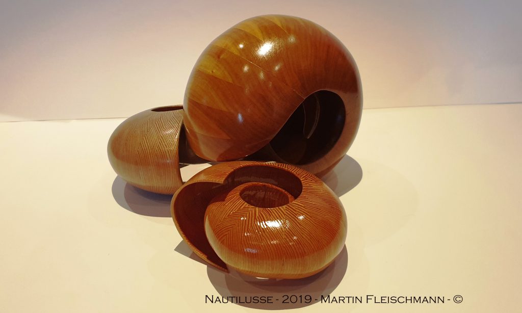 Der Nautilus wurde aus Zwetschge in aufwendiger Arbeit aus 40 Segmenten hergestellt, dadurch entstehen insgesamt 1,5 Umdrehungen bis nach innen. Um die perfekte Form zu bekommen wird jedes Teil mit verschieden festgelegten Winkeln auf der Dekupiersäge ausgeschnitten.