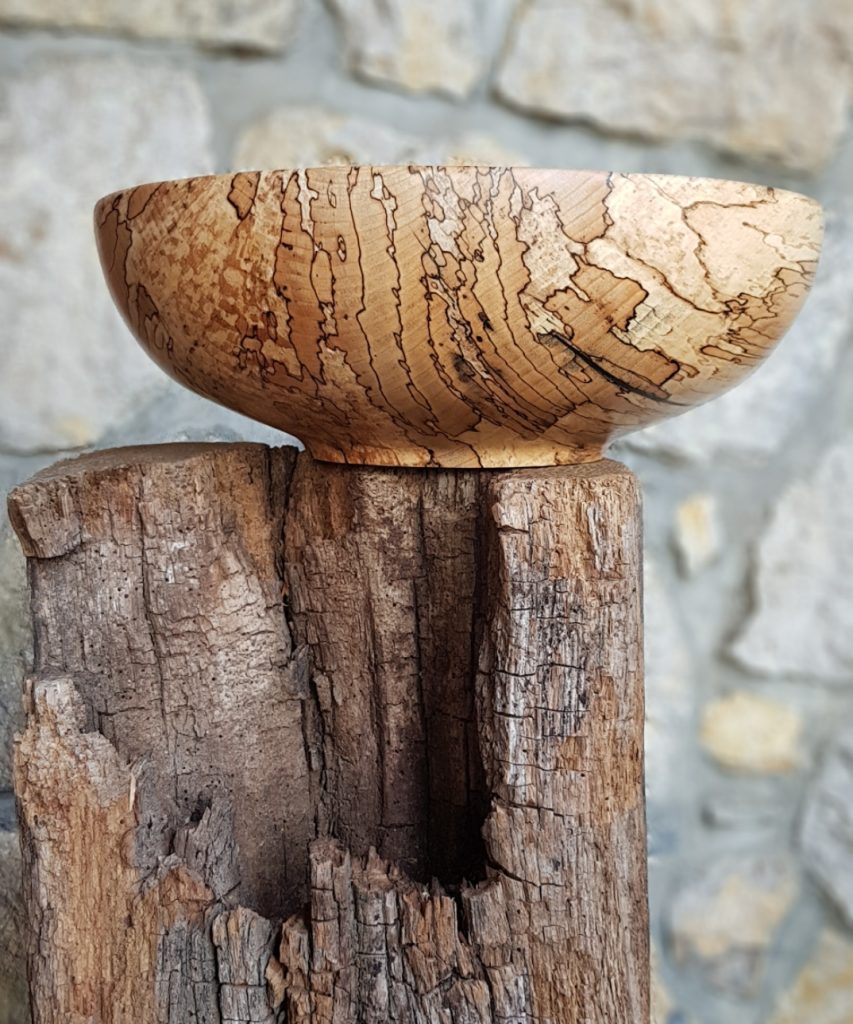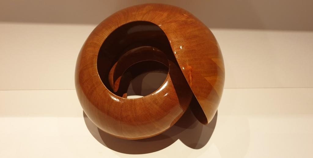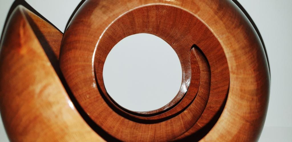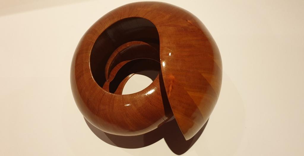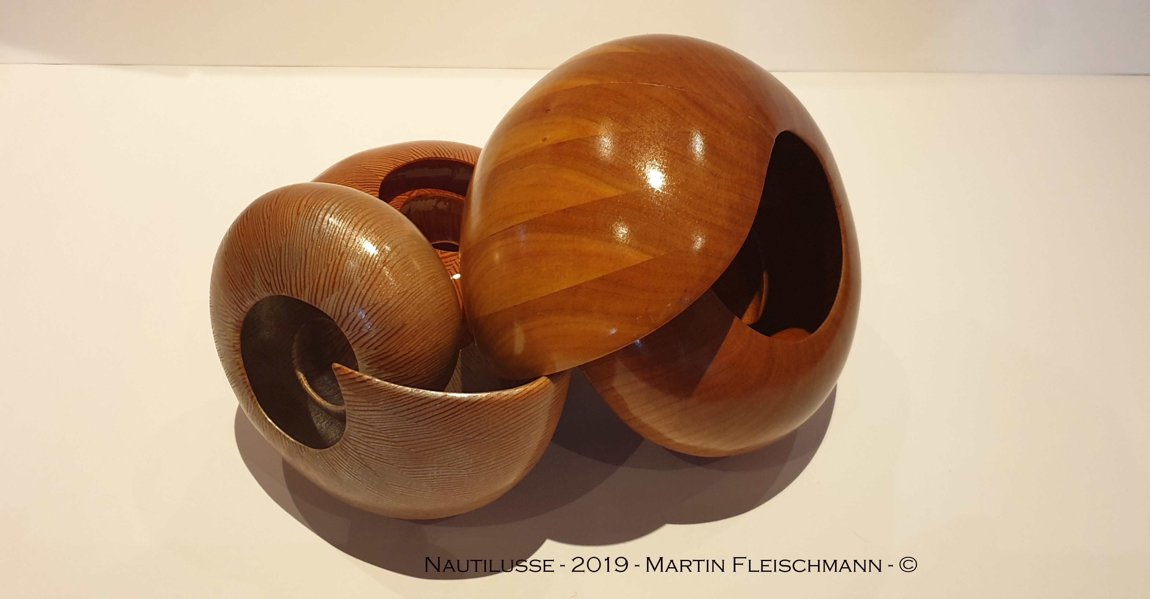 Der Nautilus wurde aus Zwetschge in aufwendiger Arbeit aus 40 Segmenten hergestellt, dadurch entstehen insgesamt 1,5 Umdrehungen bis nach innen. Um die perfekte Form zu bekommen wird jedes Teil mit verschieden festgelegten Winkeln auf der Dekupiersäge ausgeschnitten.