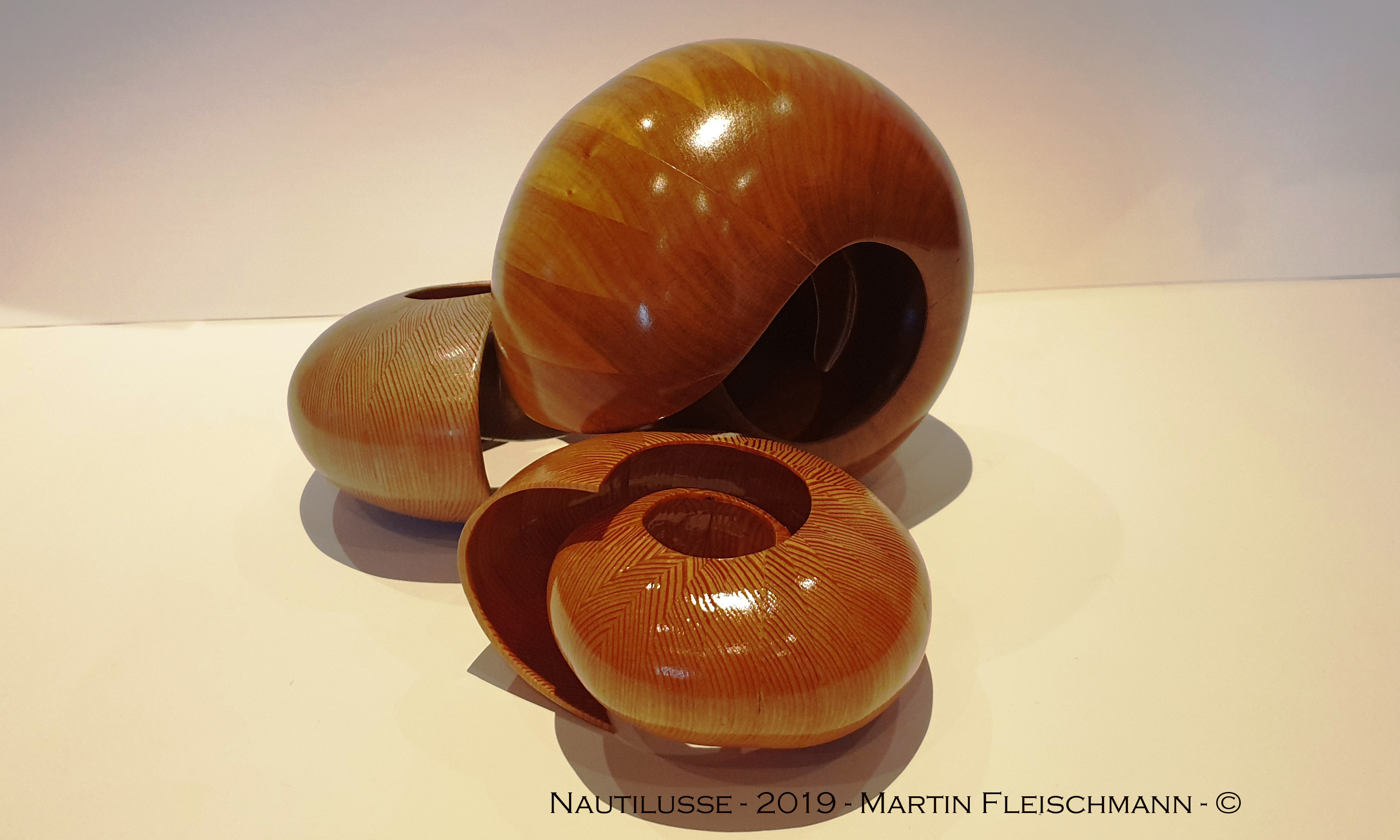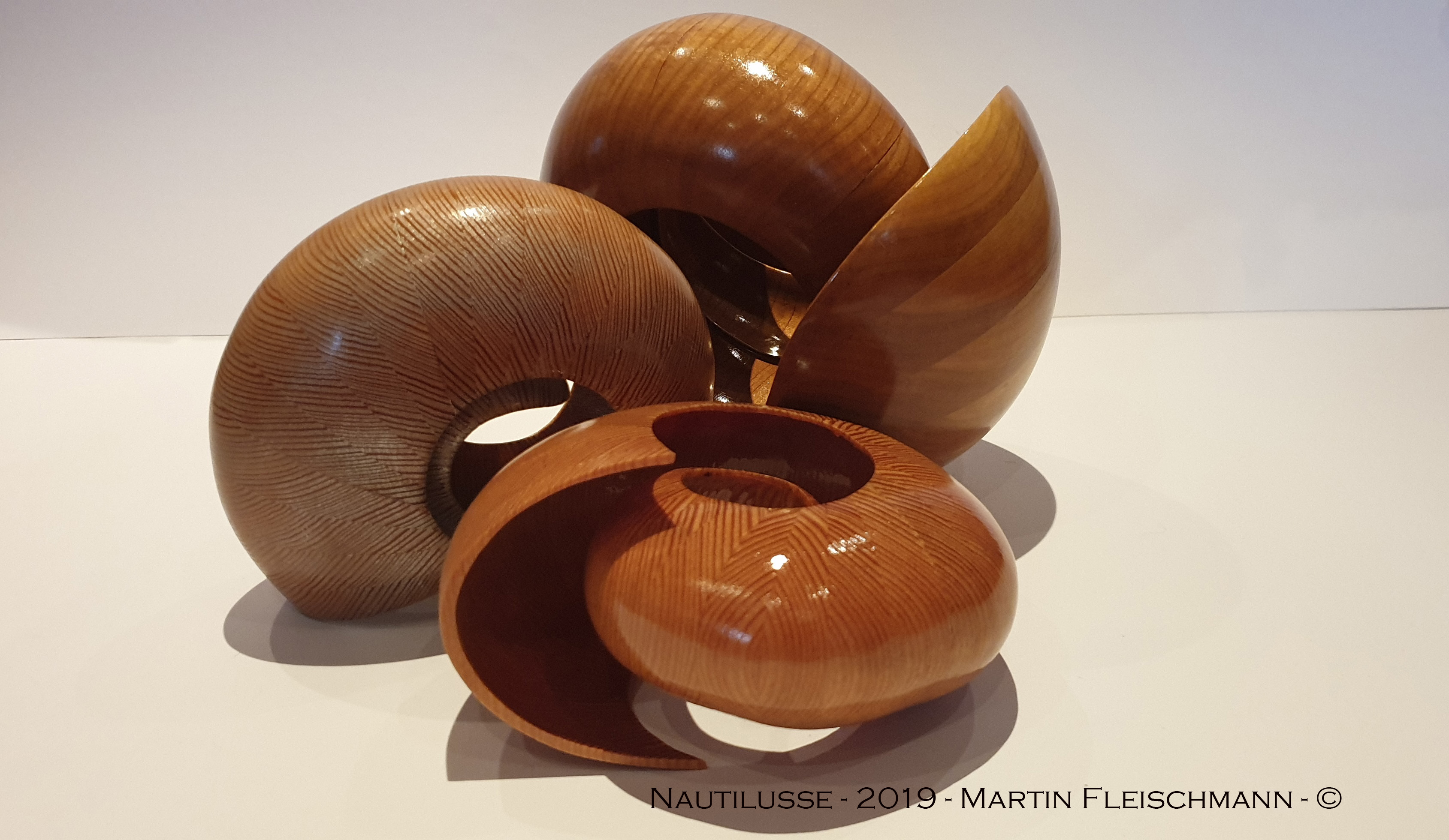 Danach werden die einzelnen Segmente verleimt und geschliffen. Der Durchmesser des Nautilus beträgt 165 mm, die vordere Öffnung hat einen Durchmesser von 120 mm und geht nach innen bis 15 mm. Die Wandstärke habe ich mit 2 – 3 mm sehr dünn gehalten, der äußere Rand beträgt 1 mm, um dem Original möglichst nahe zu kommen.