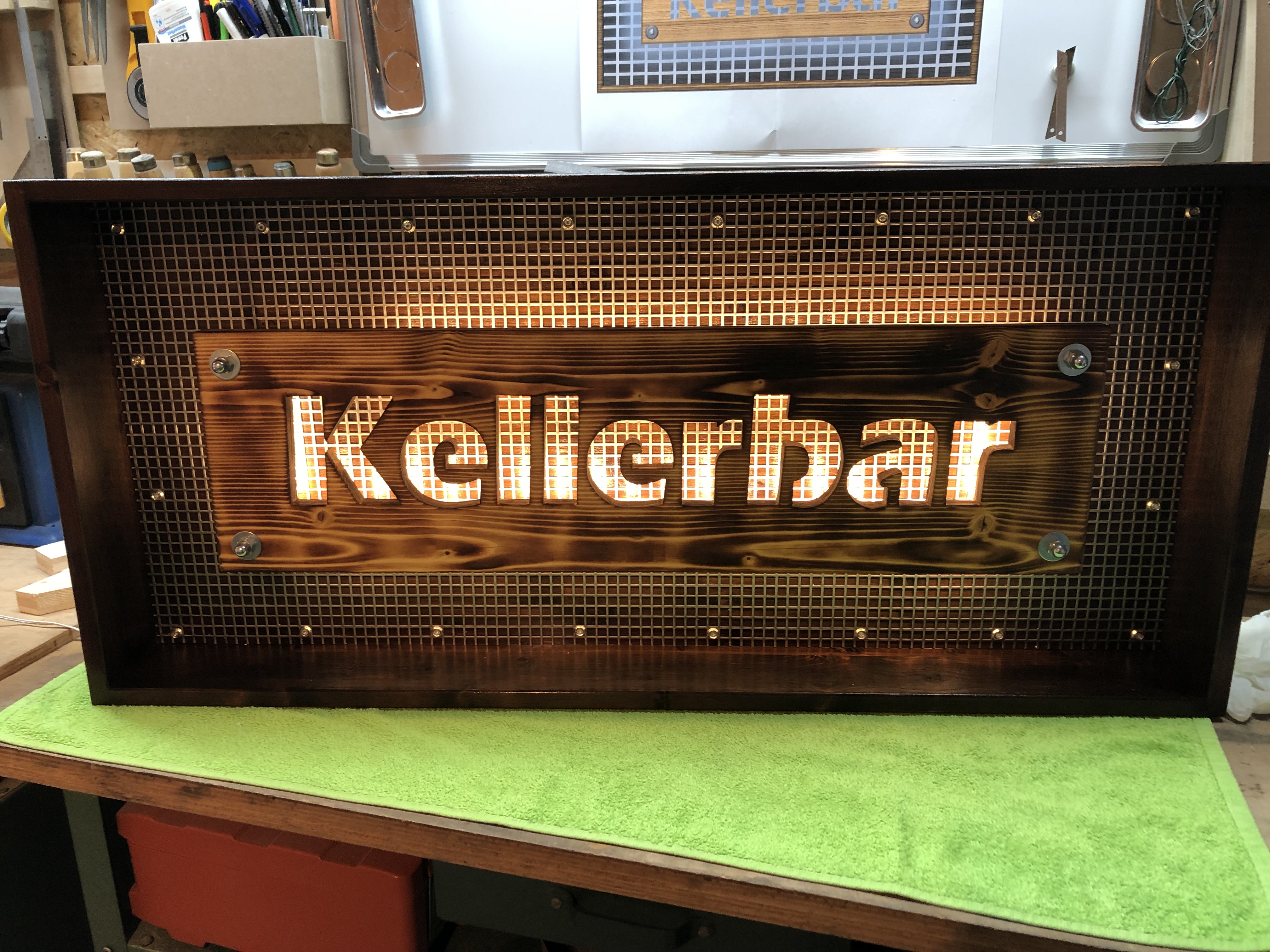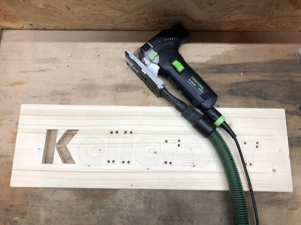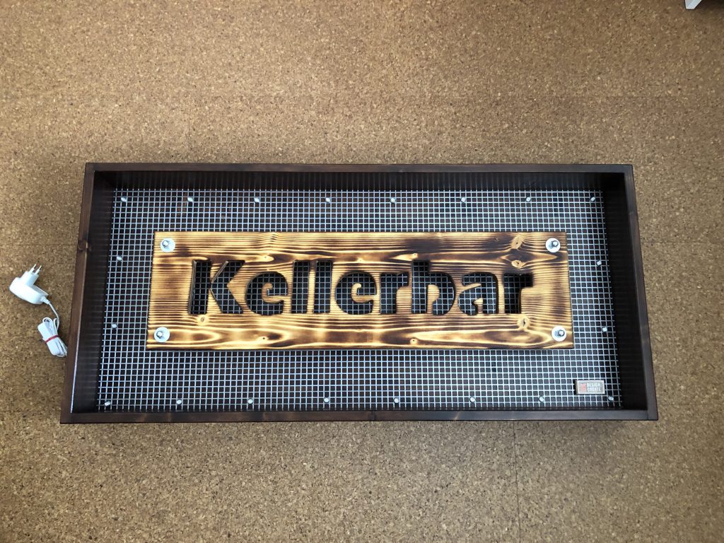 Der Schriftzug wurde aus einer 3-Schicht-Platte ausgesägt, anschließend abgeflammt und mehrfach mit Leinölfirnis behandelt.