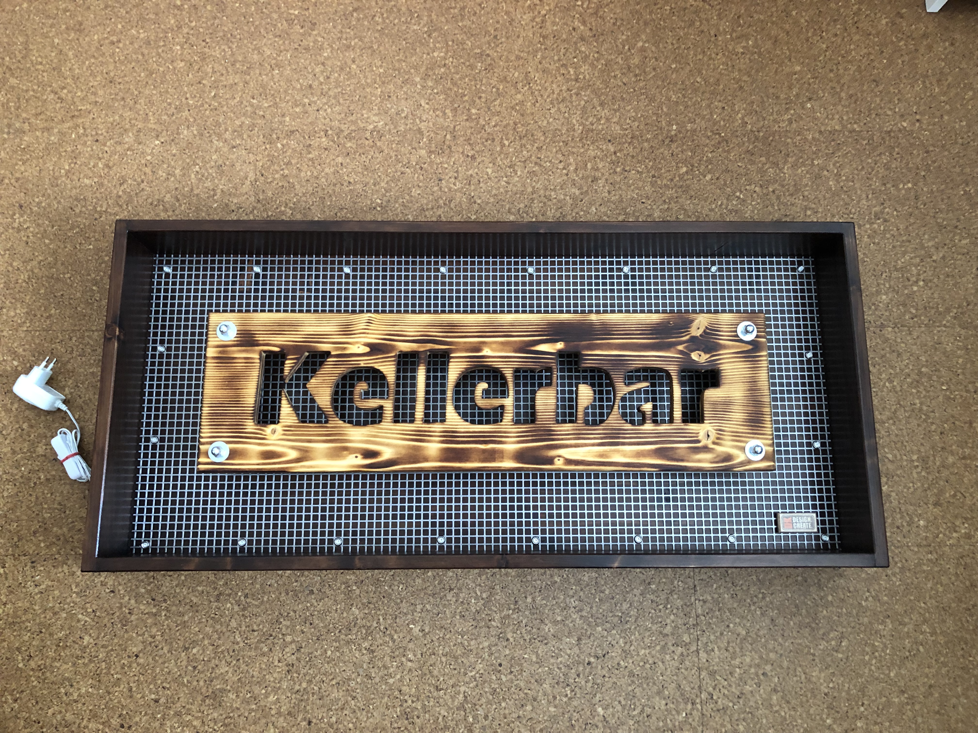 Der umgebende Rahmen des Schildes besteht aus gebeiztem Kiefernholz. Im Hintergrund befindet sich ein klarlackiertes Stahlblech.