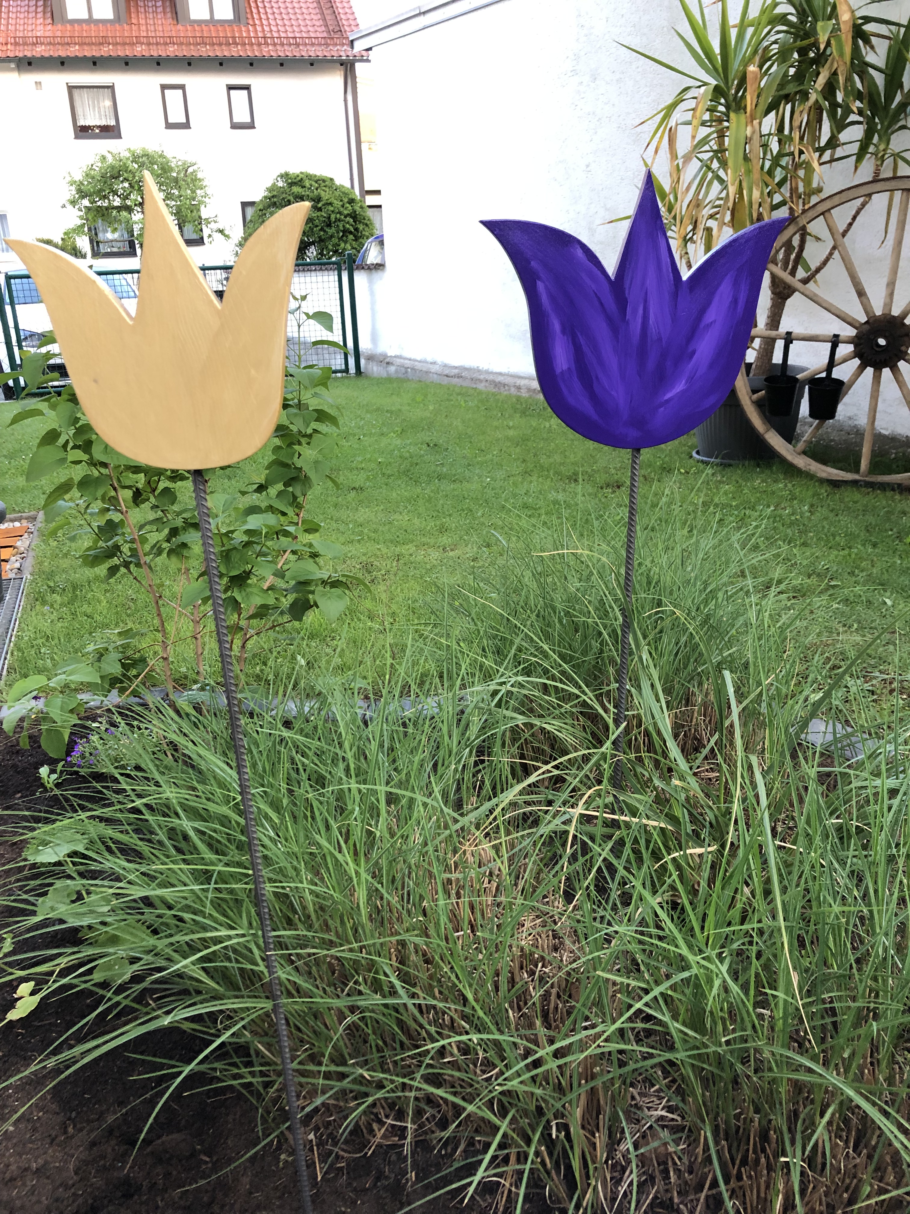 Die Tulpenblüten wurden aus Kiefernholz ausgesägt und mit Farbschattierungen bemalt. Als Ständer dient ein Stück 8mm Baustahl. Die Sägearbeiten erfolgten mit einer Festool TRION PS 300 EQ-Plus.