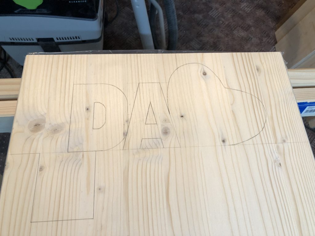 Das Schild besteht aus einer Kiefernholz-Platte, die entsprechend dem Schriftzug außen zugesägt wurde.