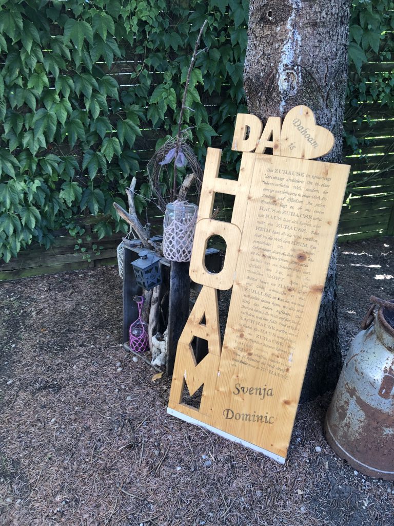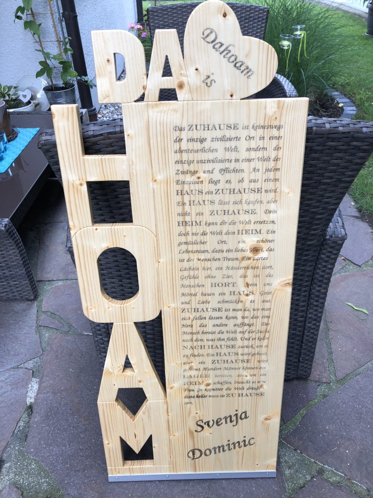Auf der Oberfläche wurde per Transferdruck ein Text aufgebracht. Abschließend wurde das Schild 3 mal mit farbloser Holzlasur eingelassen.
