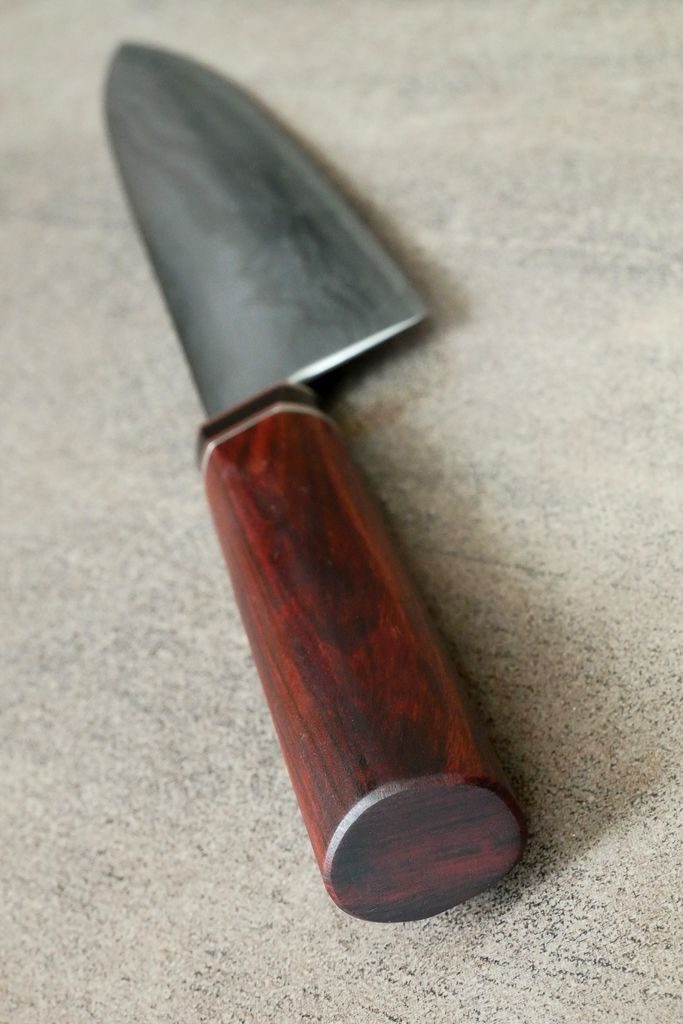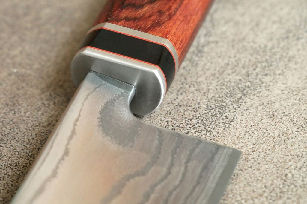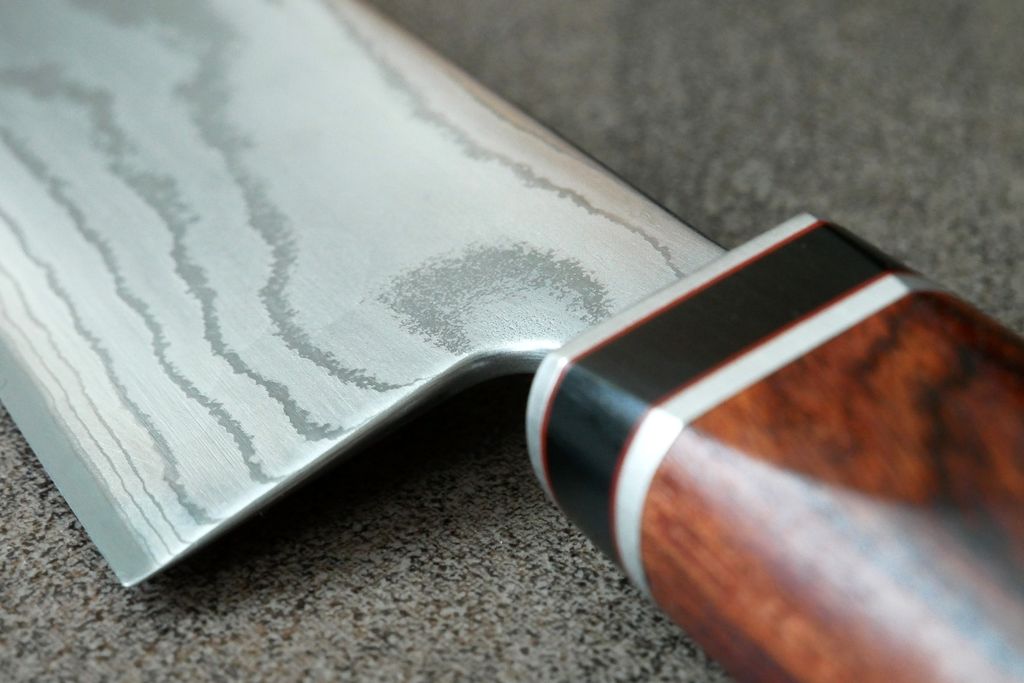 Als Grundlage für dieses Messer diente der 15-lagige Gyuto-Damastrohling (Artikelnr.: 719595) Rücken und Kehl wurden verrundet und seidenmatt poliert.