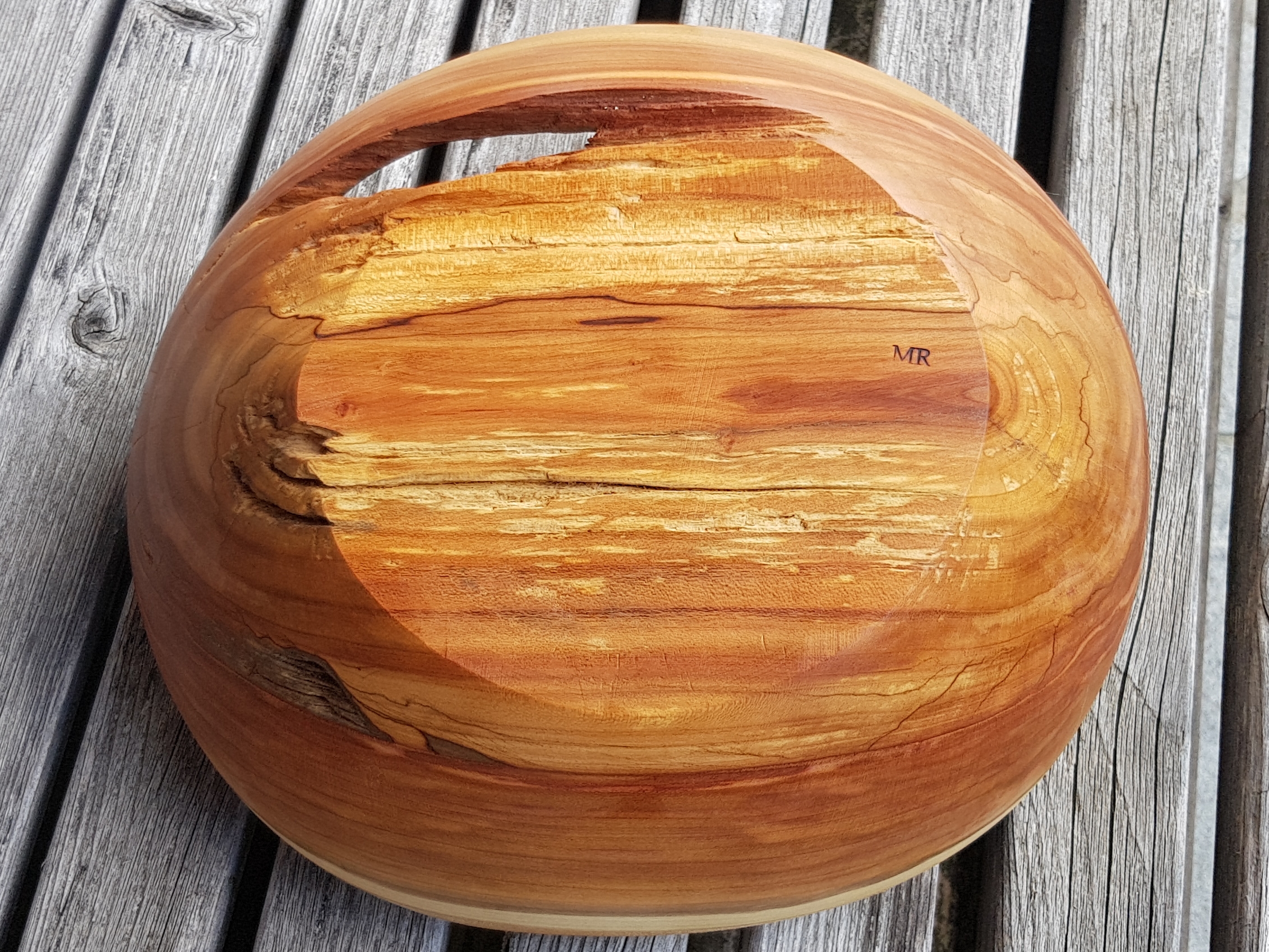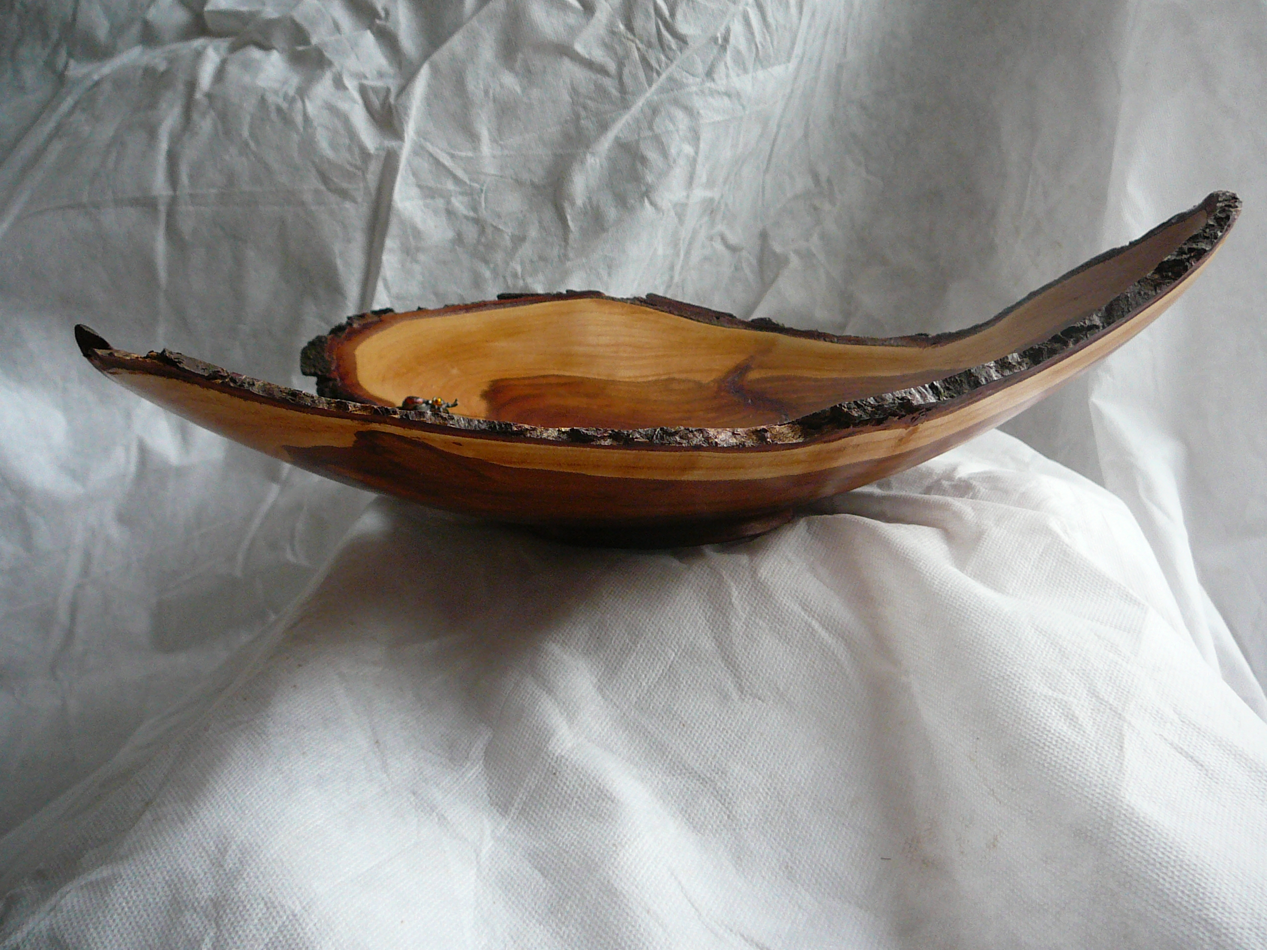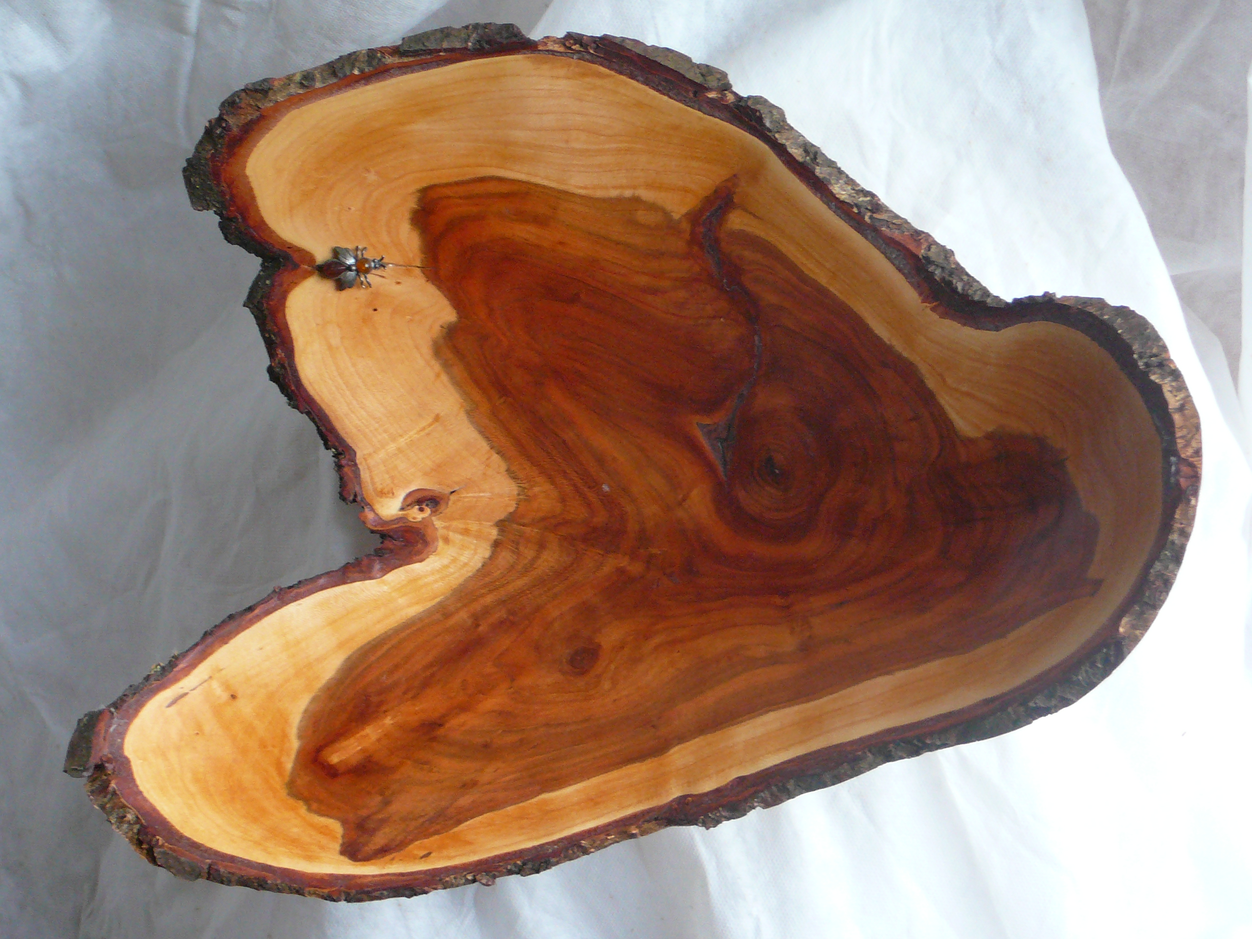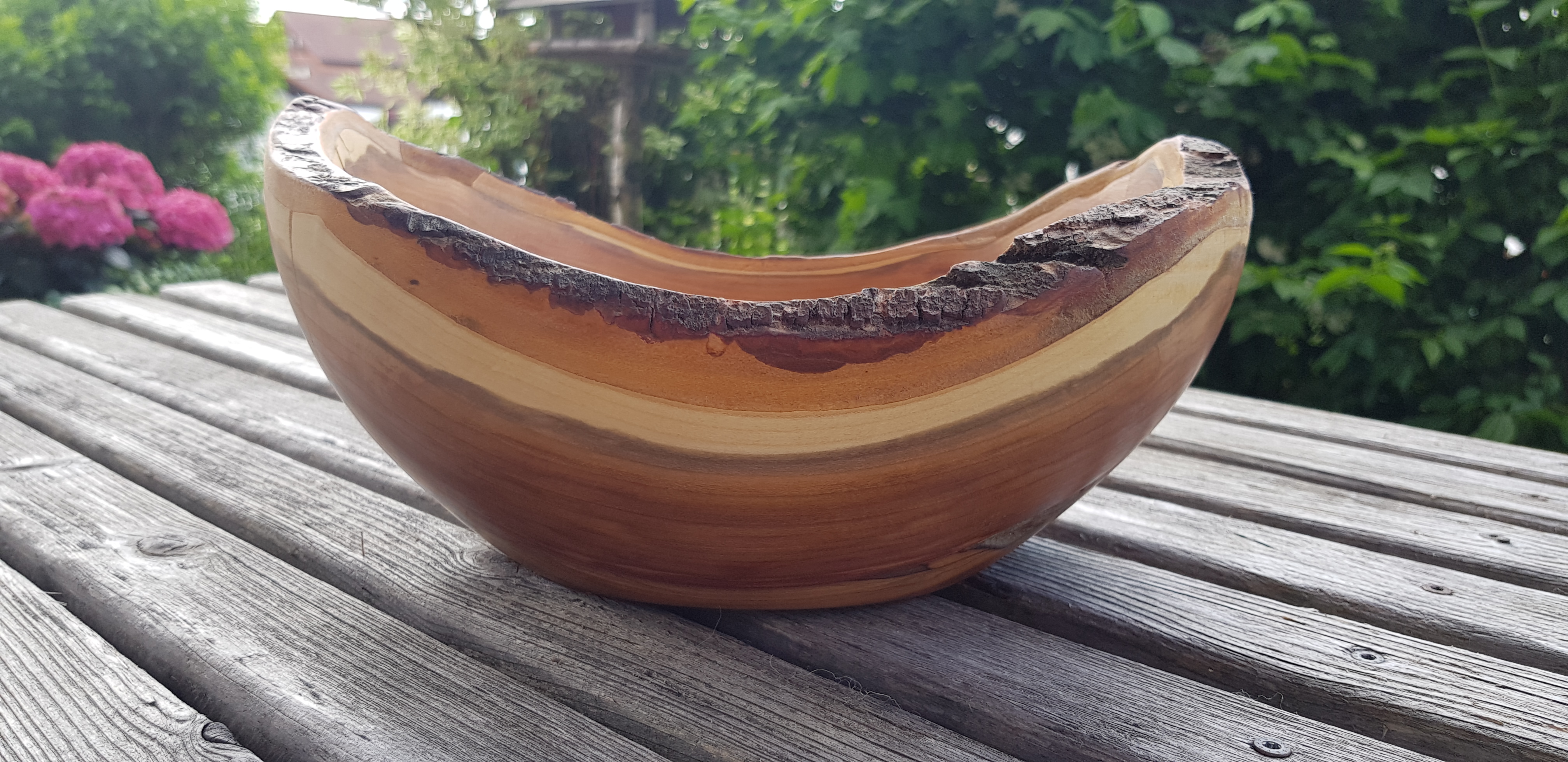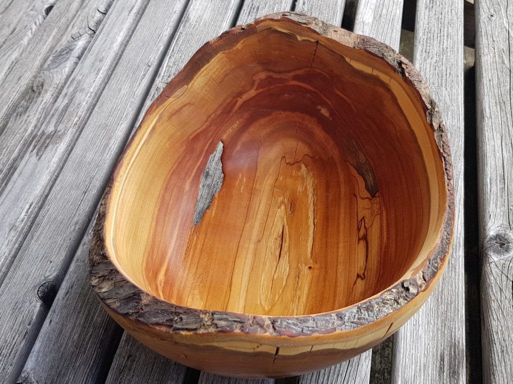 Holz von einem Zwetschgenbaum aus unserem Garten, der leider weichen musste. Die Schale ist absichtlich sehr Rustikal gehalten. Das „fehlende Stück“ ist kein Fehler, dort war das Holz schon sehr morsch und ich habe es daher mit einer Drahtbürste entfernt. Das Holz wurde Nass gedrechselt und anschließend geölt.