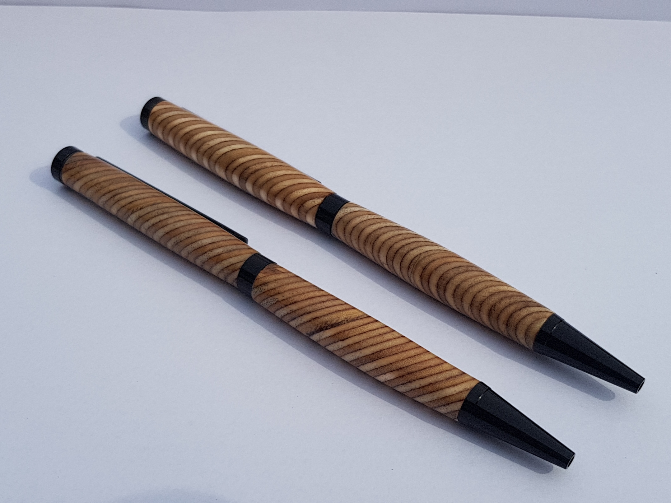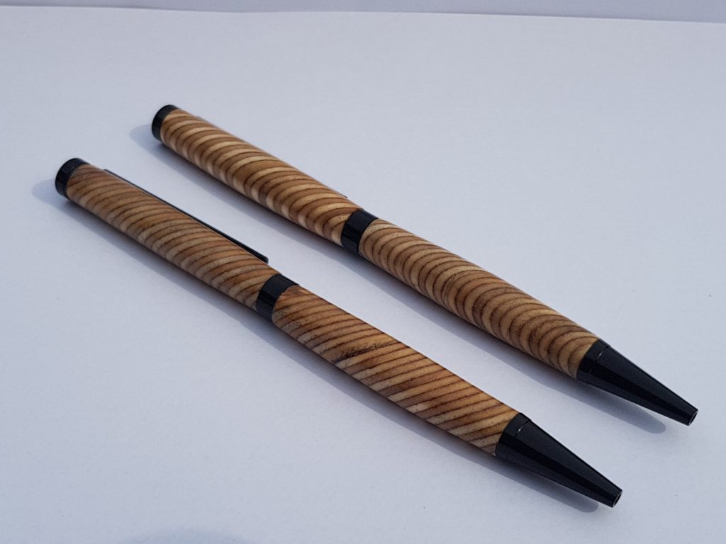 Kugelschreiber Paar aus Multiplex. Es wurden mehrere Mulitplexplatten verleimt und schräg geschnitten, so sieht man nirgends eine „ganze Platte“ sondern immer die einzelnen Schichten. Die Oberfläche ist mehrfach lackiert und auf Hochglanz poliert, was man aber auf dem Bild leider nur schlecht erkennt.