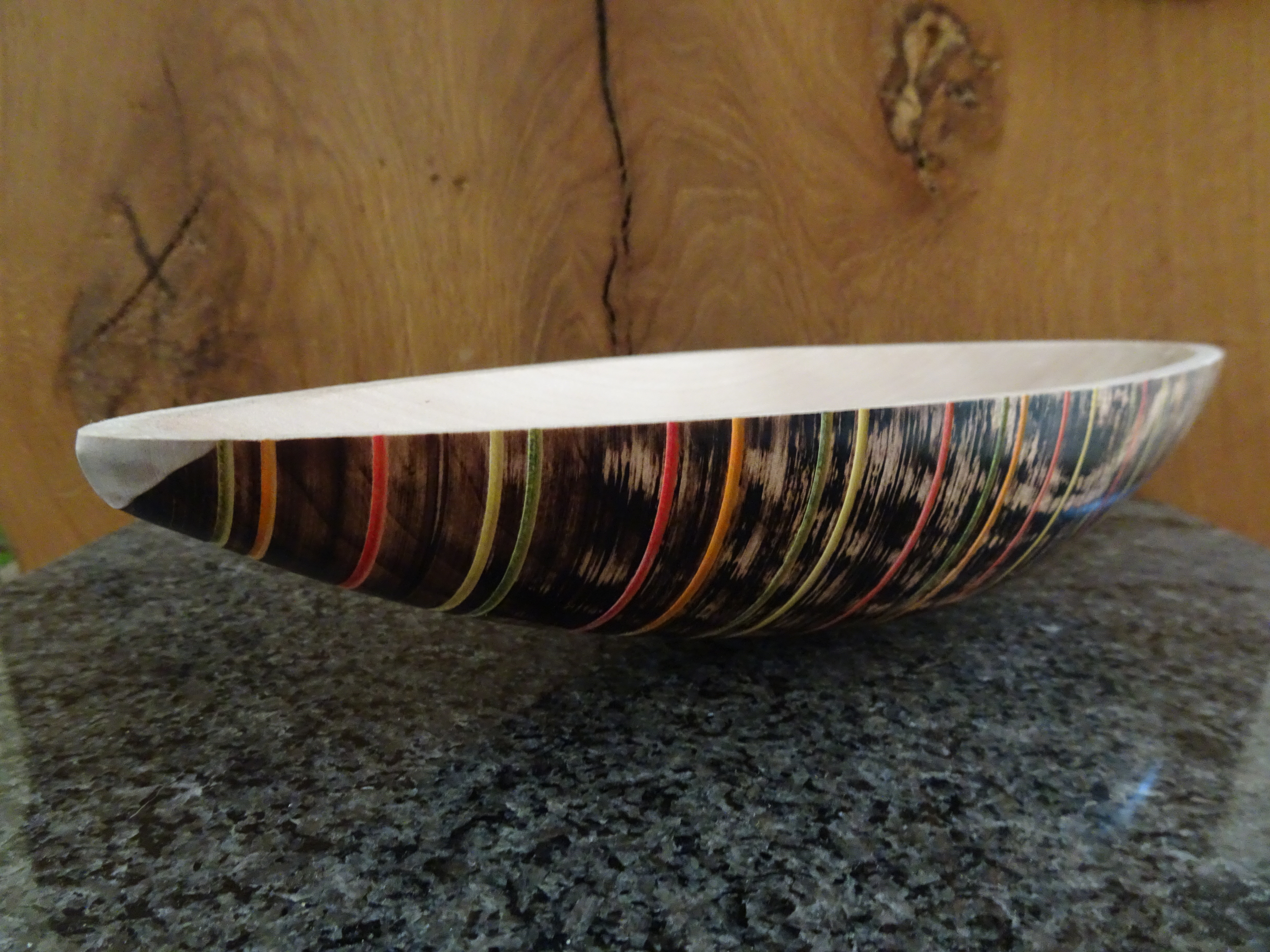 Anschließend die Rillen eingebracht und mit Aquarellstiften nach eigenem Geschmack gefärbt. Eine abschließende Behandlung mit Wachs schützt die Oberfläche. Nach diesem Vorgang kann die Kantel dann an der Papierverleimung wieder gespalten werden, so dass zwei gleiche Schalen entstehen.