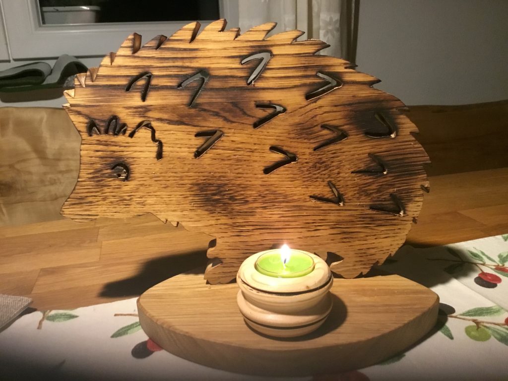 Der Fuß ist aus Buche, das Gestell aus Esche, der Zeiger aus geräucherter Eiche und der Keil aus Nußbaum hergestellt. Der Holzstreifen ist aus Nadelholz mit stark tangentialer Maserung gefertigt, um ein maximales Schwinden und Quellen zu erreichen.