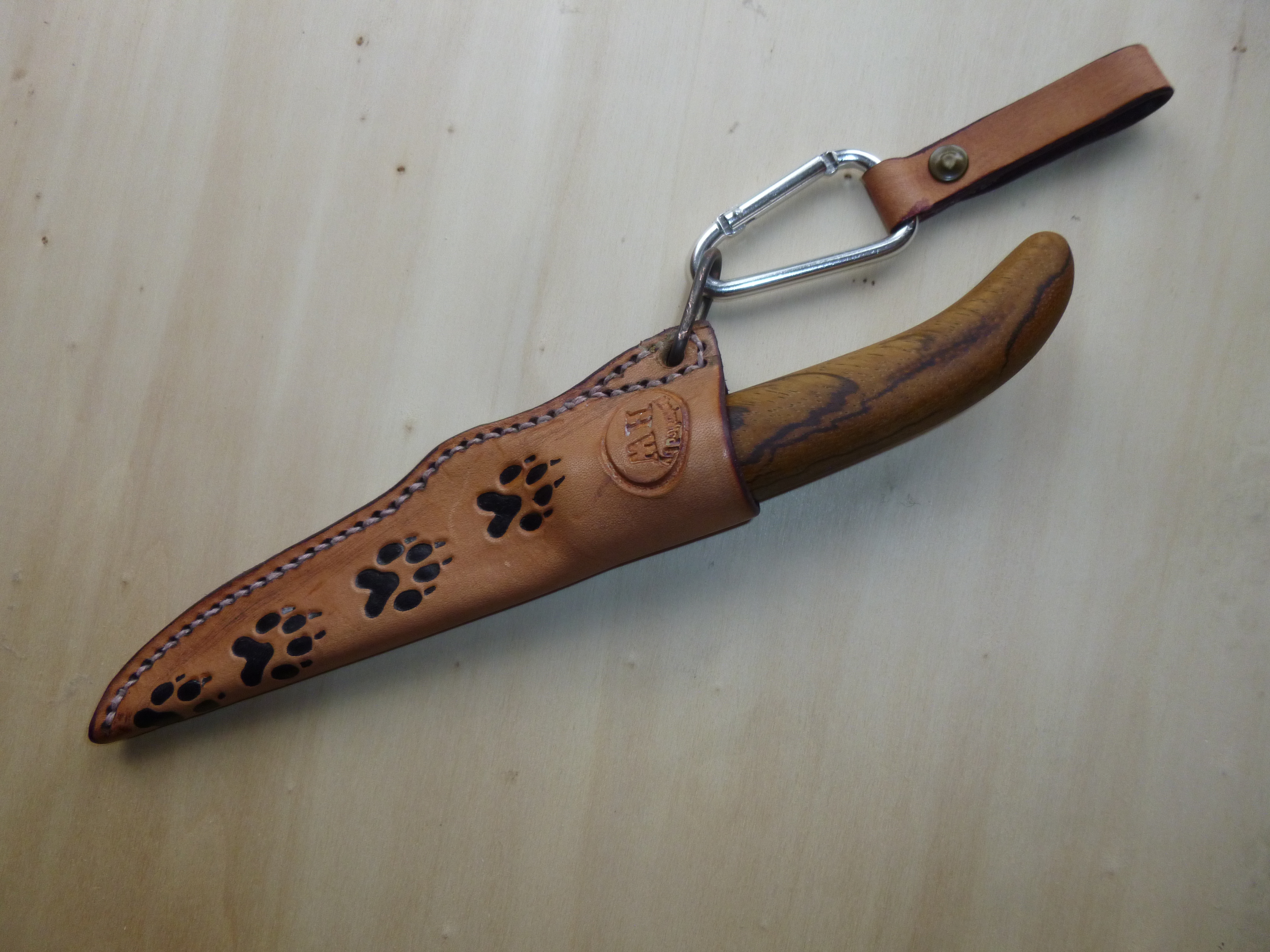 Habe einer Laurin Kohlenstoffstahl-Klinge, Klingenlänge 125 mm von DICTUM einen Griff aus Zebrano Holz angepasst und in eine nass angepasste Rindsleder-Scheide verpackt.