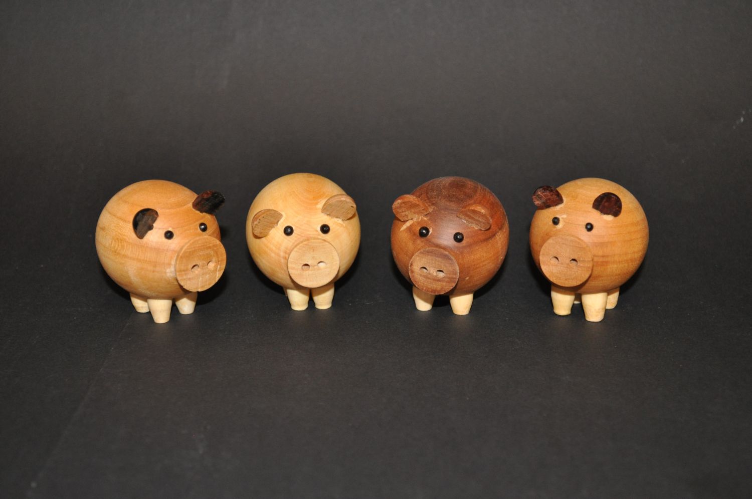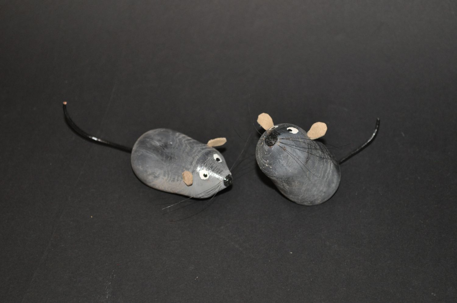 Mäuse (Länge 6 cm) aus Goldregen gedrechselt, mit Wasserfarben bemalt und lackiert.