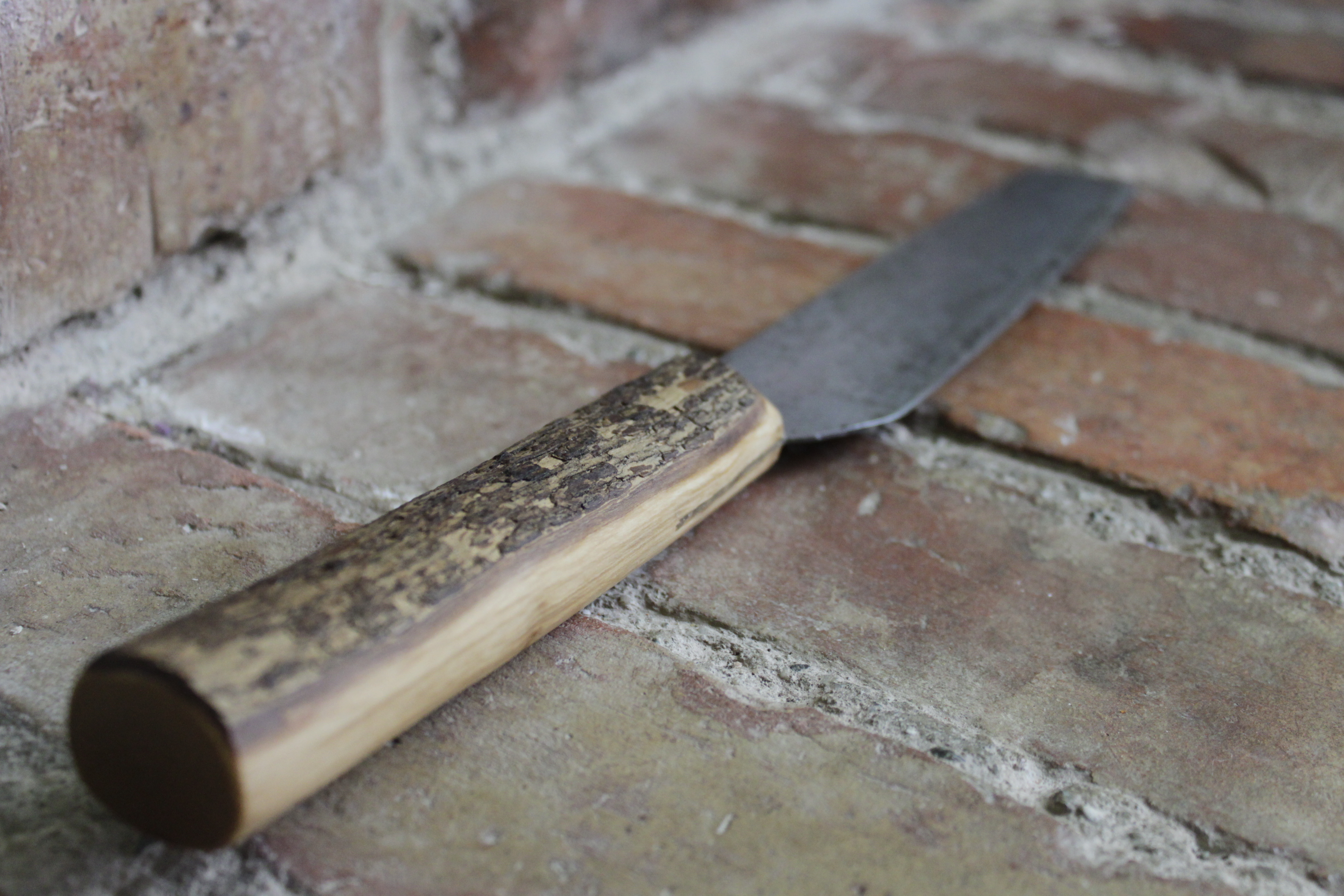 Klinge von einen Asiatischem Messer, gefertigt aus alten Sägeblättern. Griff aus heimischem Buschbaum. „Nieten“ aus Eiche. Holz drei Tage in Tungöl eingelegt.