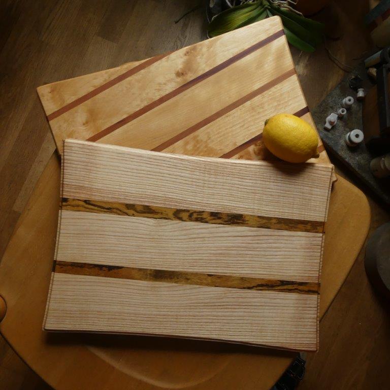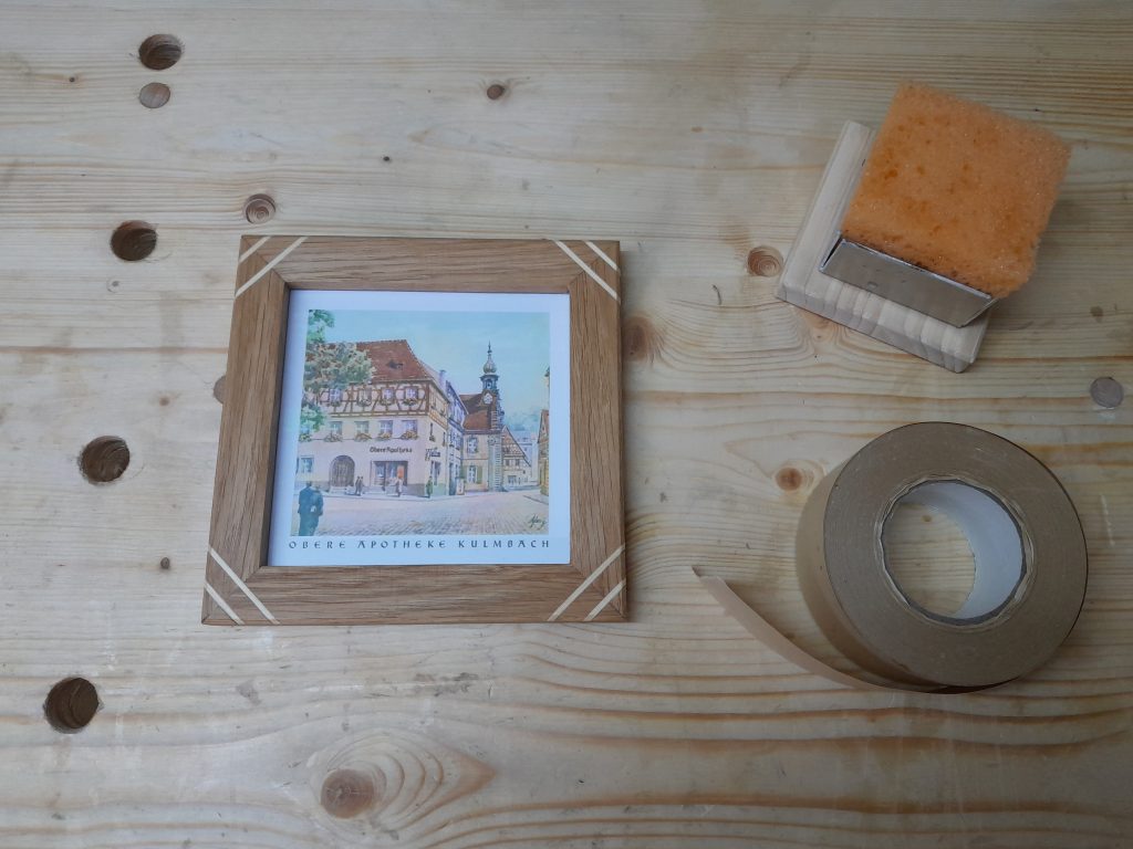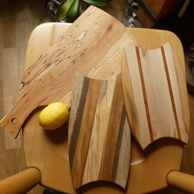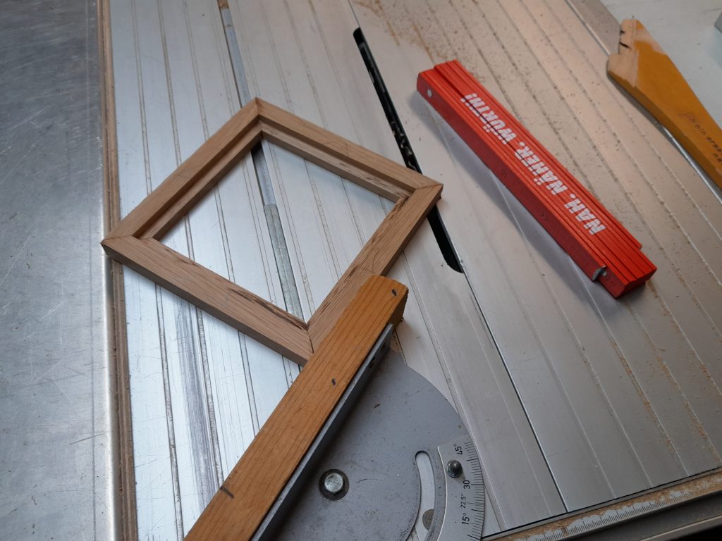 Als Trägermaterial für das Schachbrett diente eine dünne Sperrholzplatte. An die Kanten wurde ein Anleimer aus Buche geleimt. Das Karo auf der Vorderseite besteht aus zusammengesetzten Nussbaum- und Ahornfurnier, reine Handarbeit mit Furniersäge und Furniermesser. Rückseite aus Ahornfurnier. Oberflächenbehandlung erfolgte mit mehreren Schichten Leinöl.