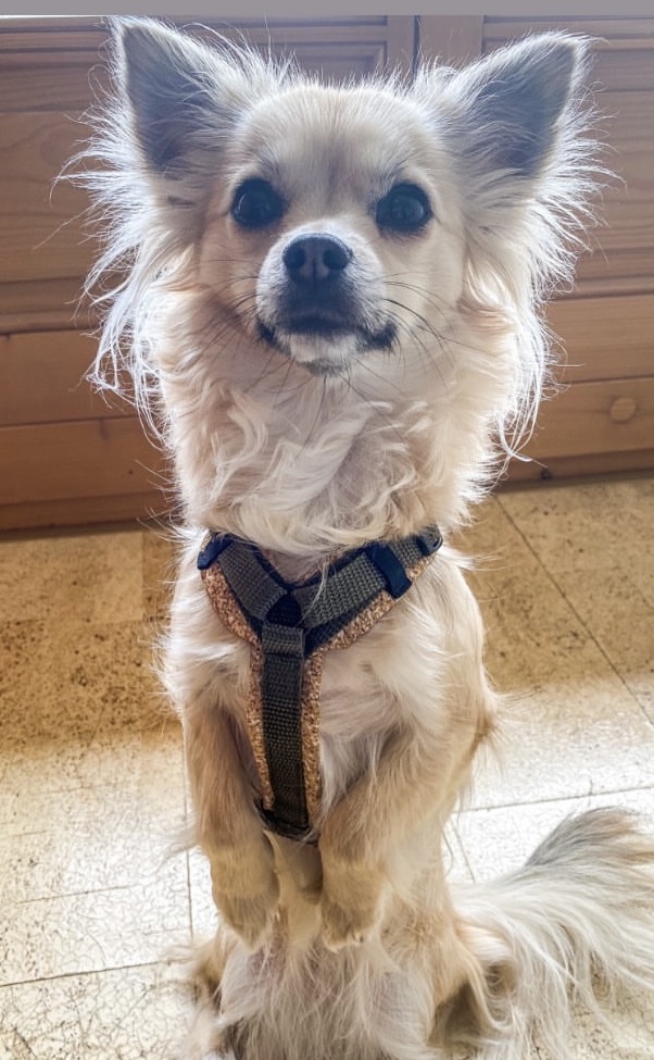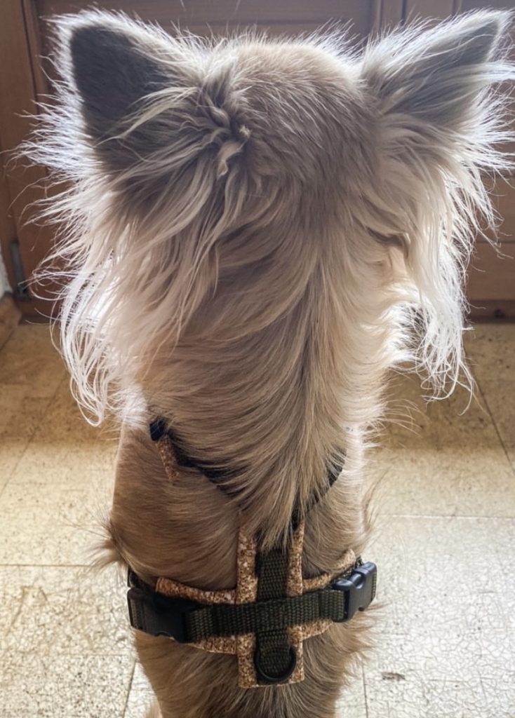 Selbstgenähtes Hundegeschirr. Verwendete Materialien: Softshell als Polsterung, Gurtband zur Stabilisierung und um das Geschirr größentechnisch zu verstellen, Metallringe und Plastikschnallen.
