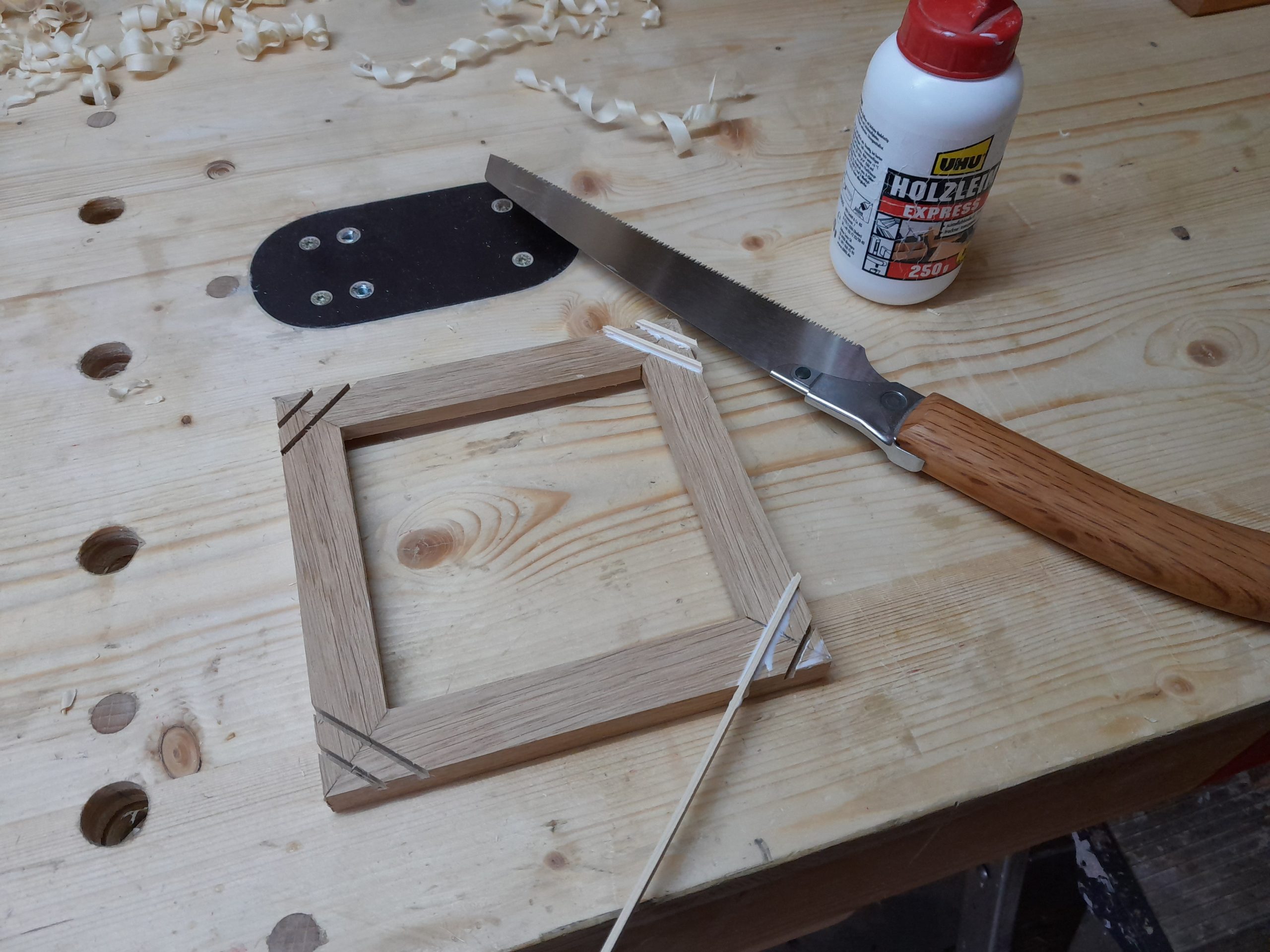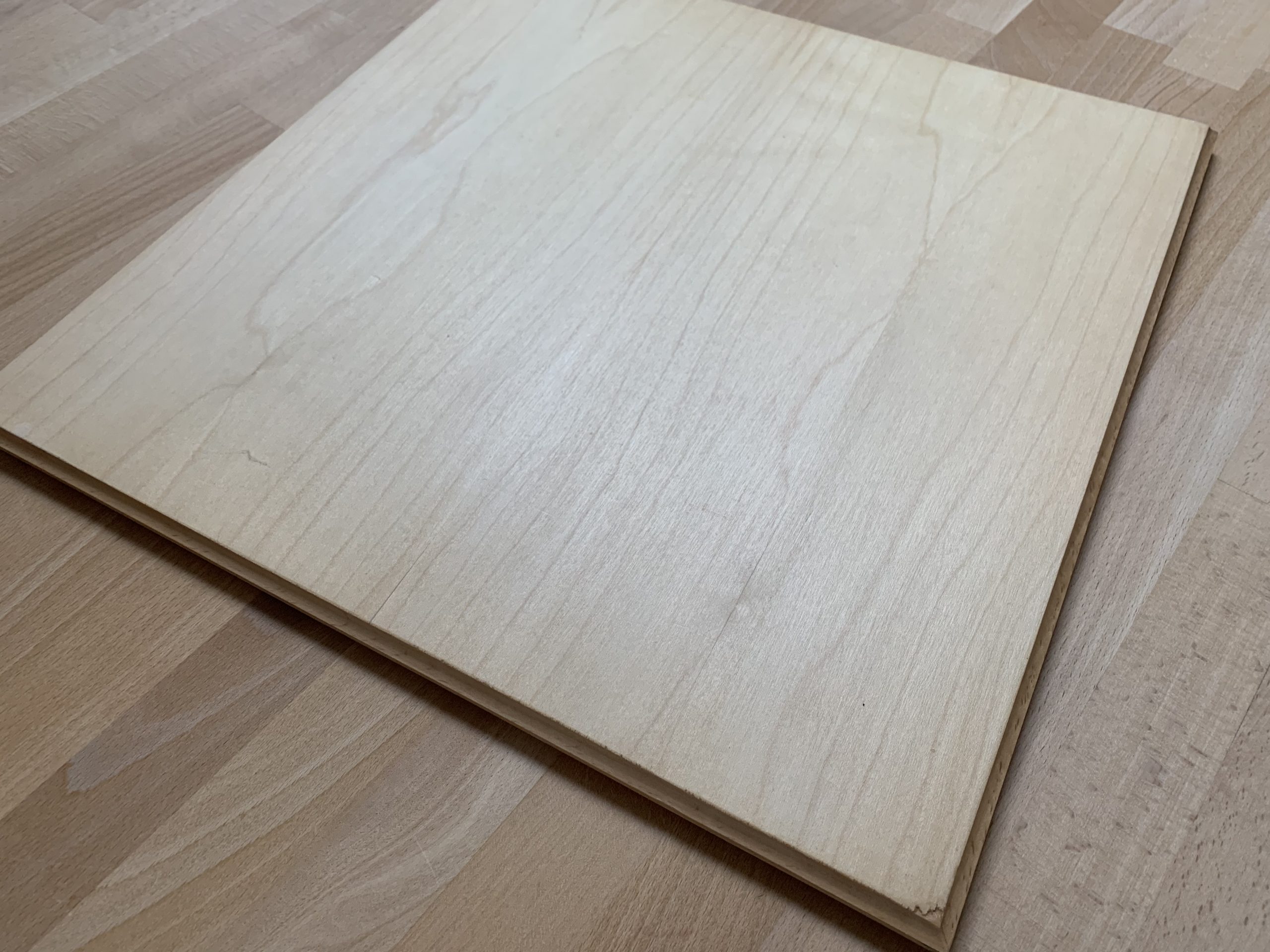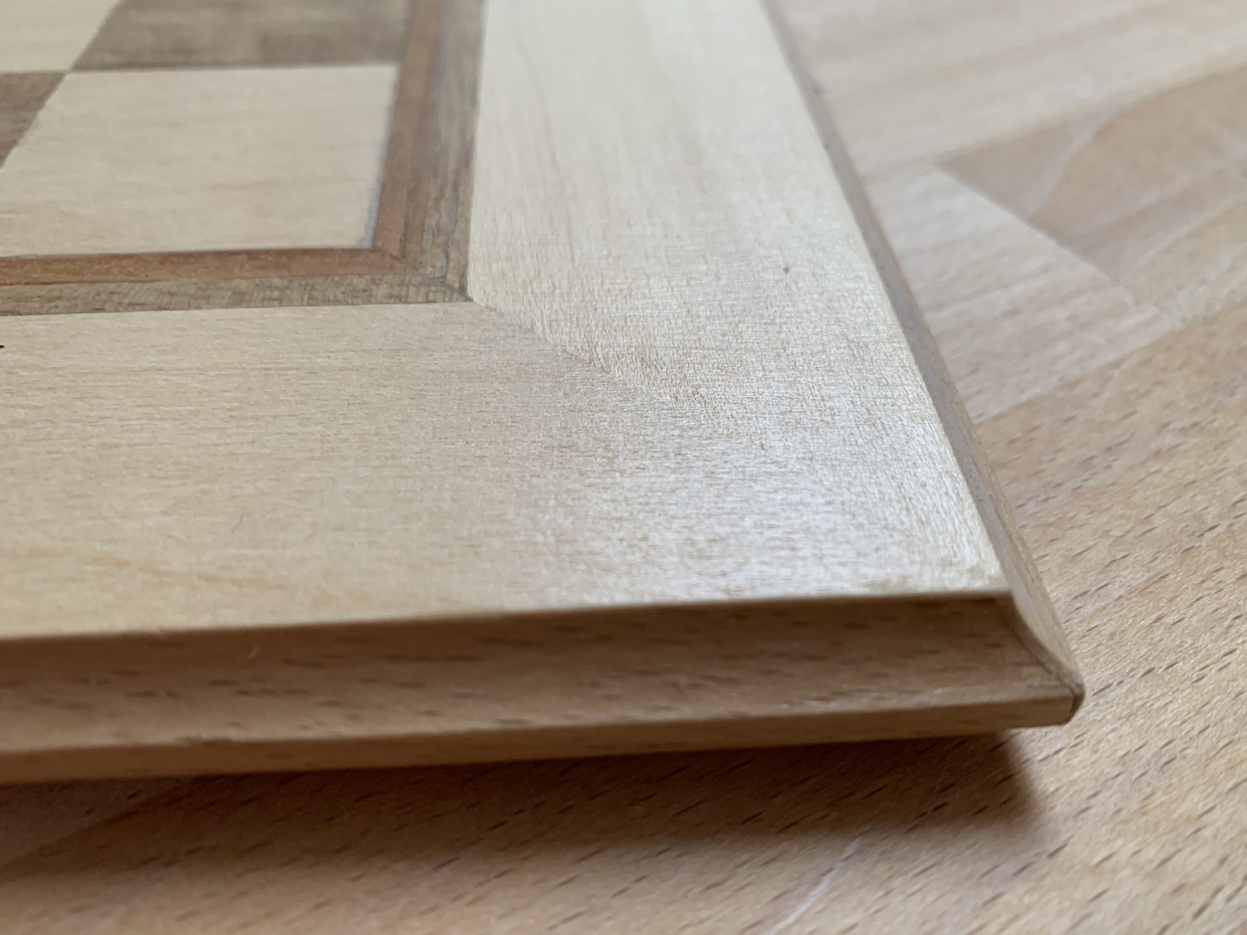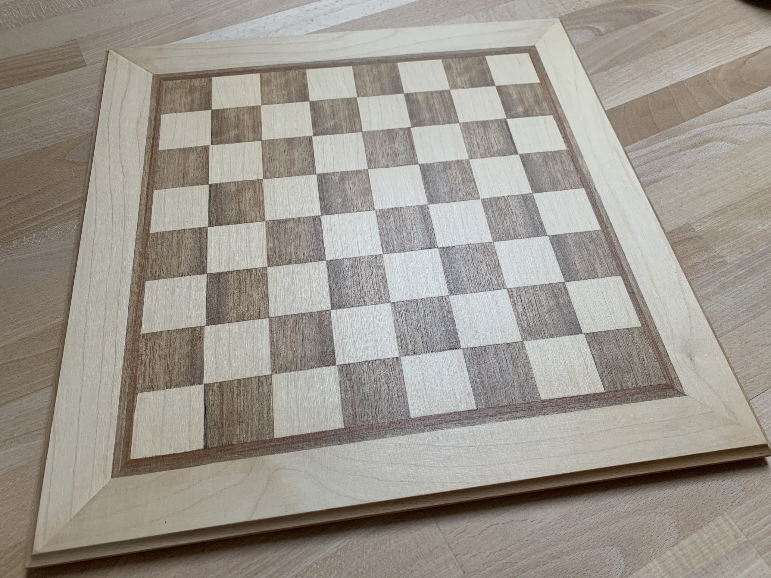 Als Trägermaterial für das Schachbrett diente eine dünne Sperrholzplatte. An die Kanten wurde ein Anleimer aus Buche geleimt. Das Karo auf der Vorderseite besteht aus zusammengesetzten Nussbaum- und Ahornfurnier, reine Handarbeit mit Furniersäge und Furniermesser. Rückseite aus Ahornfurnier. Oberflächenbehandlung erfolgte mit mehreren Schichten Leinöl.