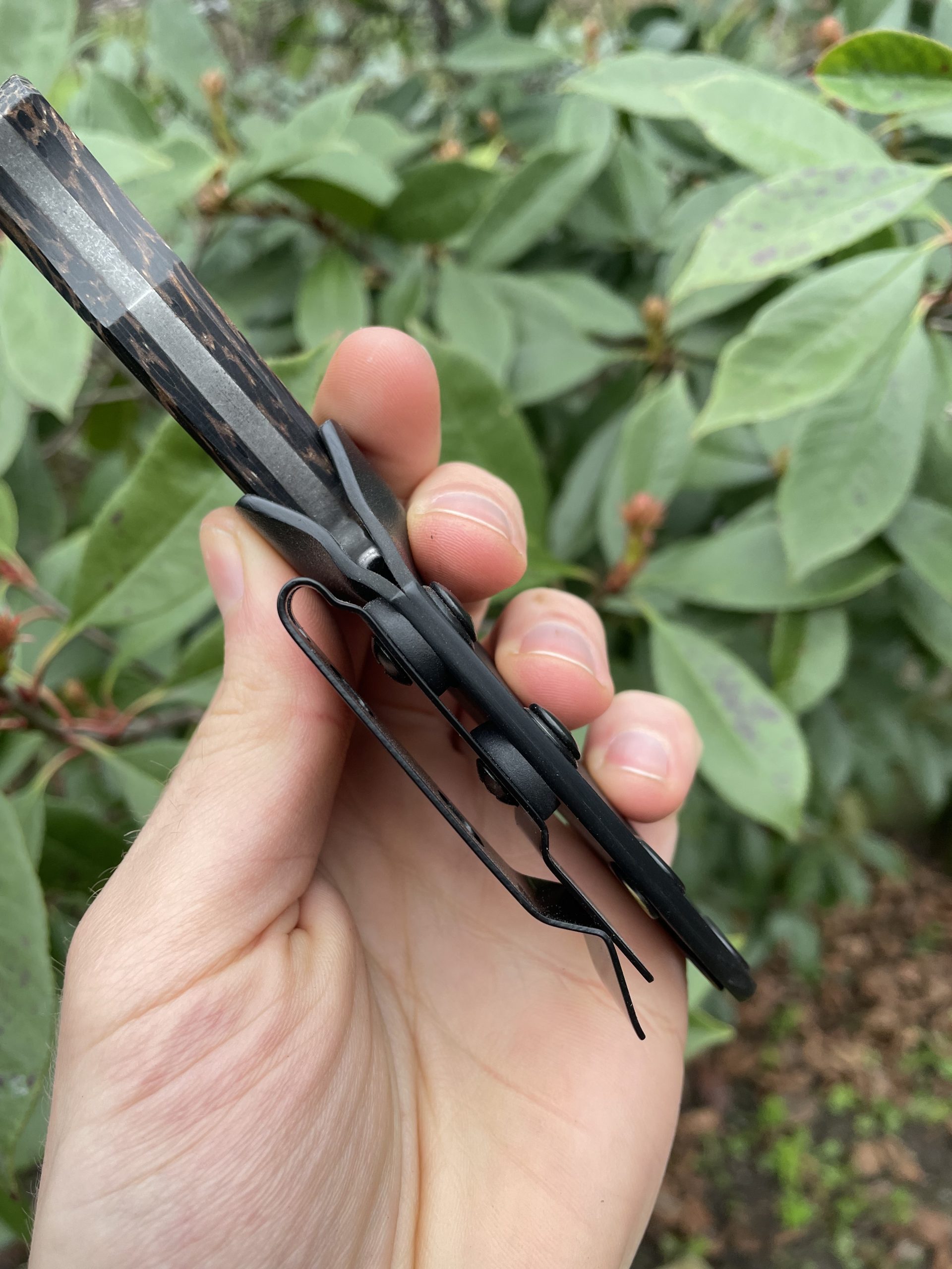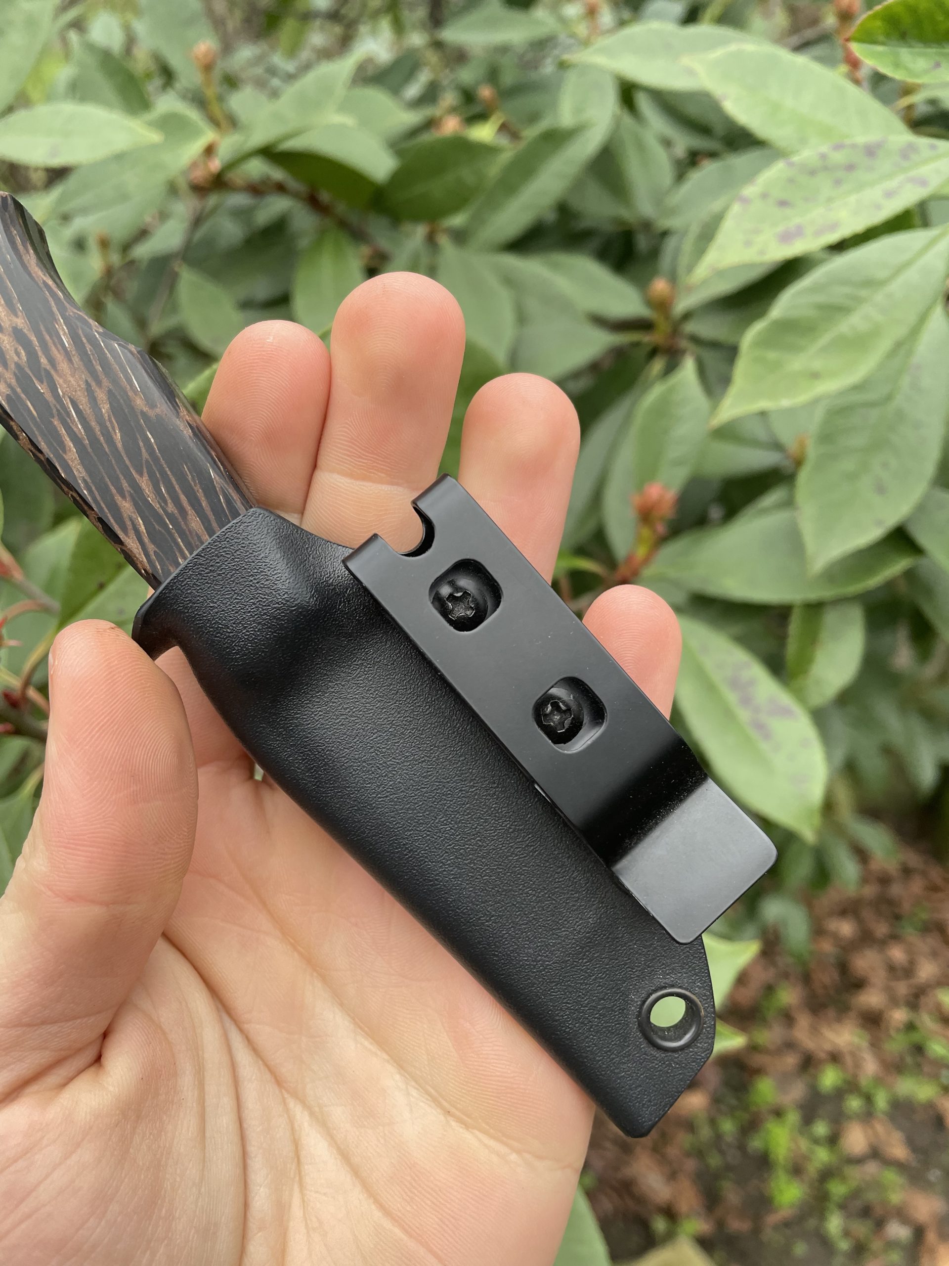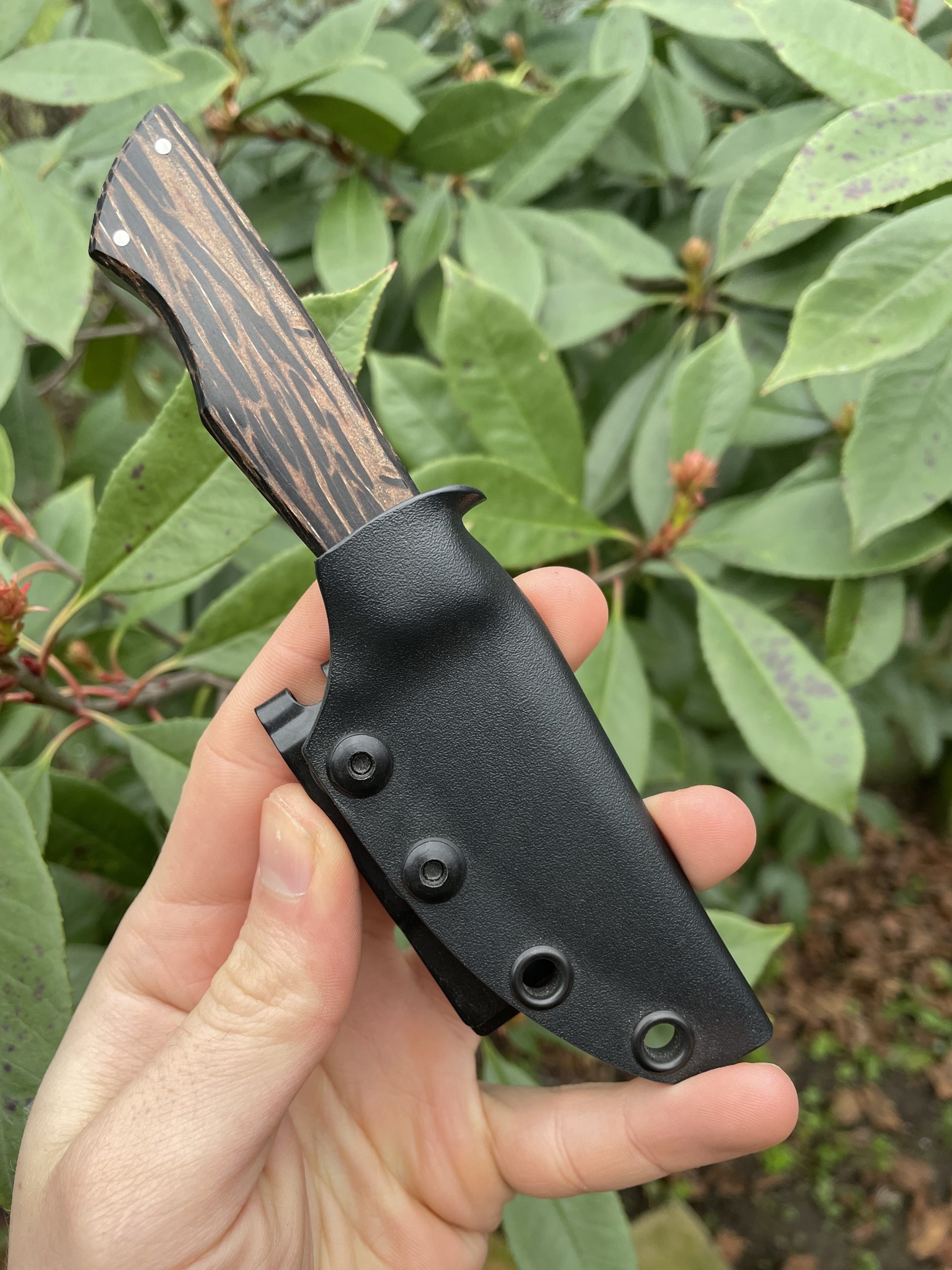 Um auch bei kleinen EDCs schöne Details im Kydex zu bekommen nehme ich 1,5 mm dicke Platten zum pressen. Die erwärme ich mit der Heißluftpistole und verpresse sie zwischen festen Schaummatten, die ich auf MDF geklebt habe, im Schraubstock. Ich nehme eine Platte und lege das Messer mit dem Rücken zur Mittellinie rein, sodass beim Umfalten eine geschlossene Kante an einer Seite der Hülle entsteht. Dadurch bildet sich direkt schon ein kleines Loch am unteren Ende, über das eingedrungenes Wasser ablaufen kann. Außerdem spart es Ösen – und viel wichtiger: Platz. Um das Messer angenehm mit einer Hand rausnehmen zu können, erwärme ich das Kydex am Griffende und stülpe es um.