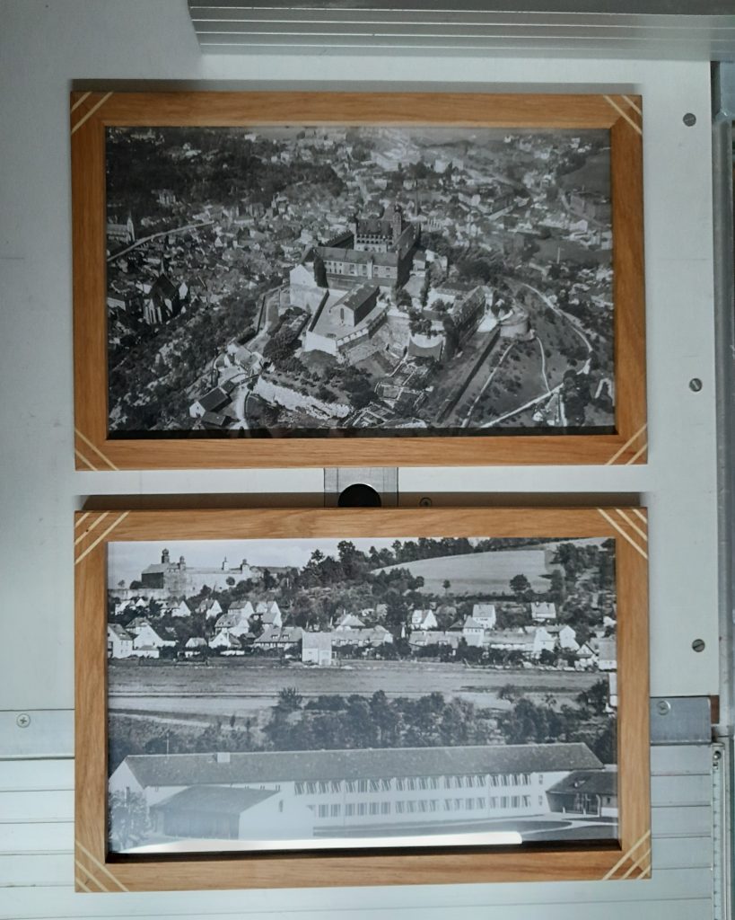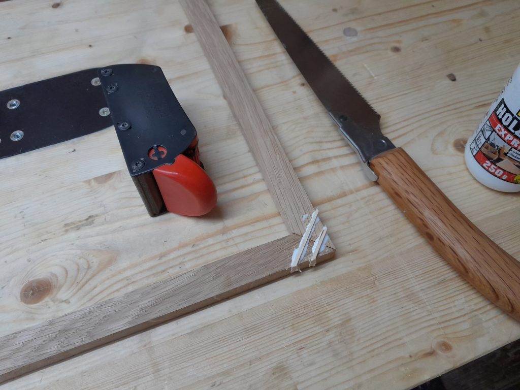 Zwei alte Heimatfotos sollten eingerahmt werden. Die Rahmen habe ich aus Eicheleisten gefertigt, welche zunächst gehobelt, gefälzt und dann auf Gehrung gesägt wurden. Die eingesetzte Scheibe besteht aus Acrylglas, die Rückwand aus Sperrholz und ist mit Klammern aus Schweißdraht befestigt. Als Rahmeneckverbindung wurden pro Gehrung zwei bzw. drei Eschestreifen eingesetzt.