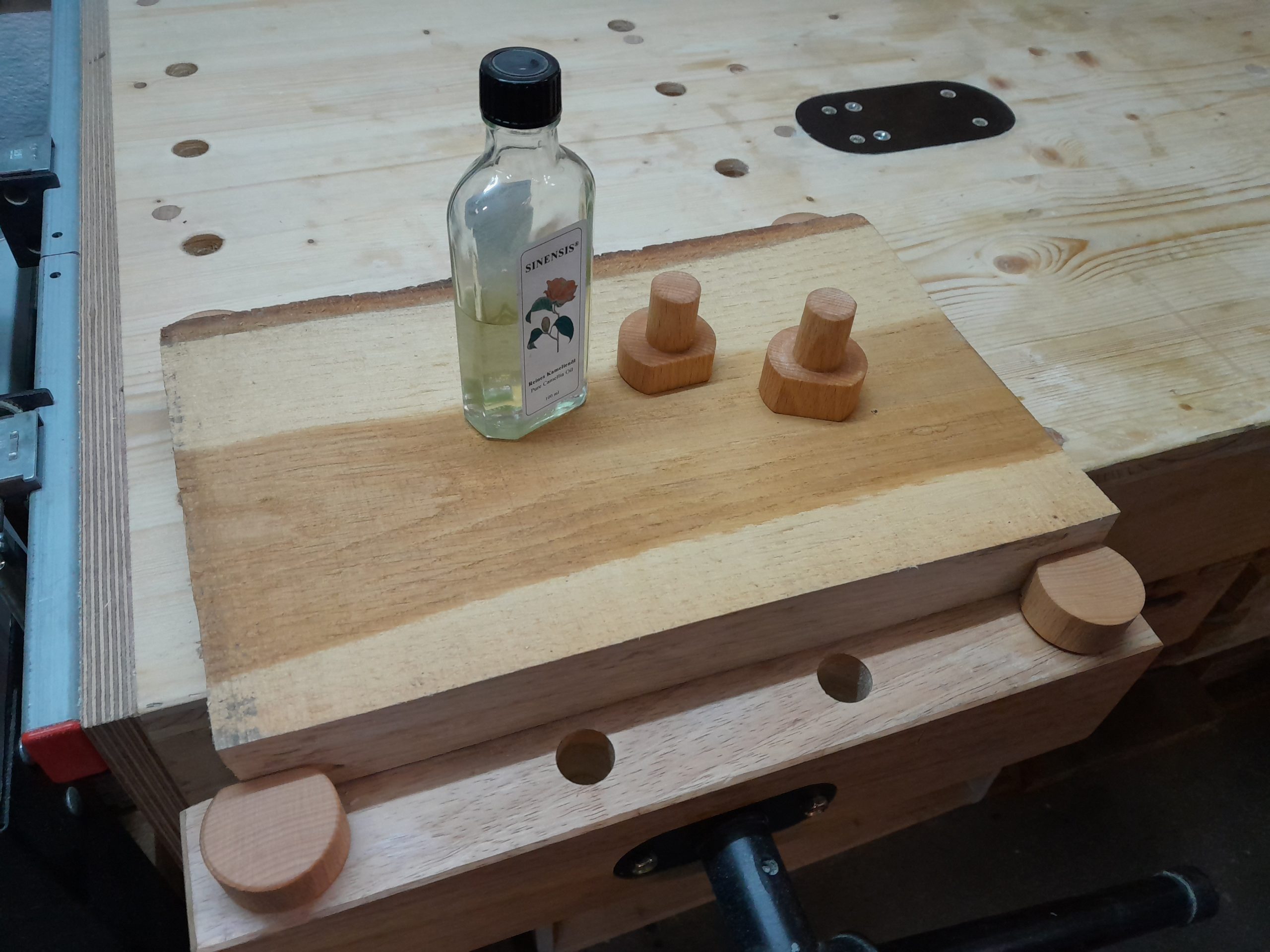 Möchte man beim Einspannen von weichen Hölzern Druckstellen vermeiden, so sollten Bankhaken aus Holz verwendet werden. Diese Bankhaken sind auf der Drechselbank aus Buchenholz entstanden; die abgeflachten Stellen wurden auf dem Tellerschleifer ausgearbeitet.