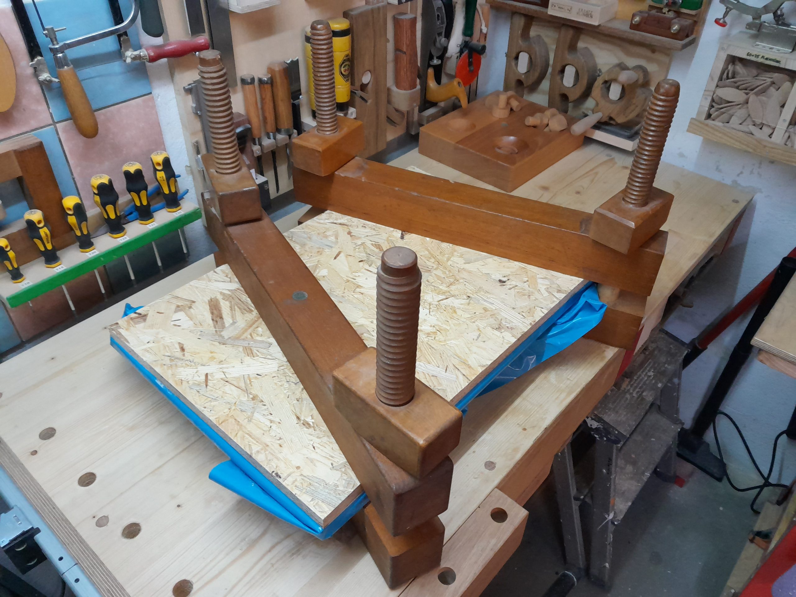 Zwei alte Heimatfotos sollten eingerahmt werden. Die Rahmen habe ich aus Eicheleisten gefertigt, welche zunächst gehobelt, gefälzt und dann auf Gehrung gesägt wurden. Die eingesetzte Scheibe besteht aus Acrylglas, die Rückwand aus Sperrholz und ist mit Klammern aus Schweißdraht befestigt. Als Rahmeneckverbindung wurden pro Gehrung zwei bzw. drei Eschestreifen eingesetzt.