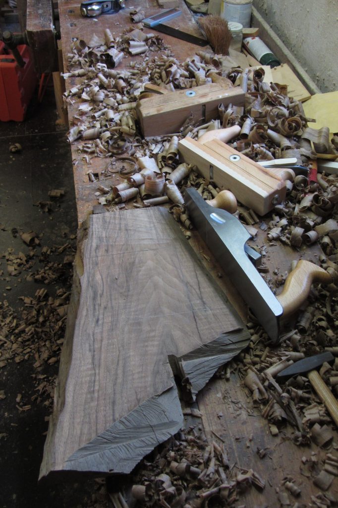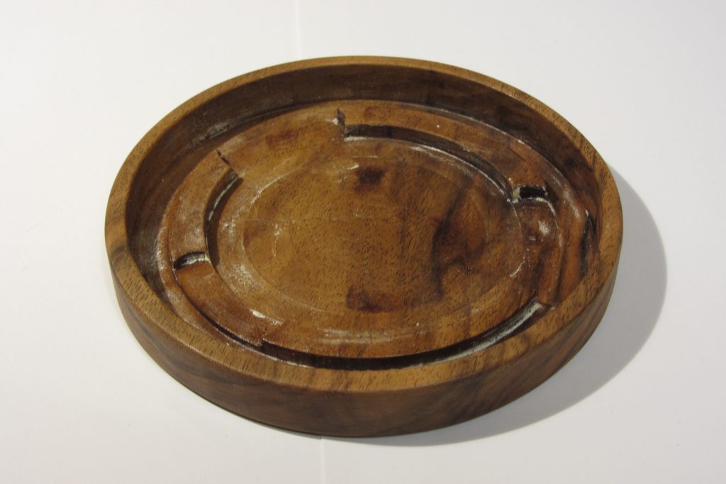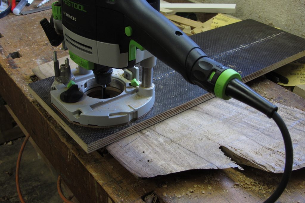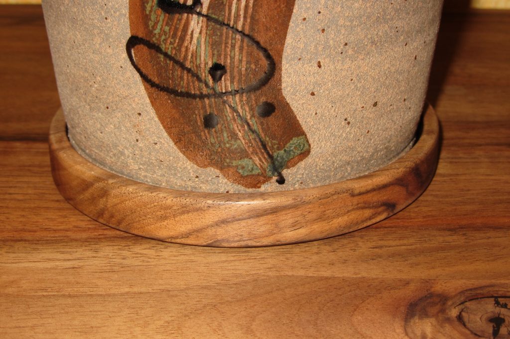 Die Zimmerpflanze, welche auf meinem Nussbaumschränkchen steht, hat vom örtlichen Töpfer einen neuen Übertopf bekommen. Da ich der Wasserdichtheit des Übertopfes nicht 100%-ig getraut habe und Wasserflecken auf meinem Schränkchen vermeiden wollte, habe ich aus Resten des Schrankbaus einen Untersetzer gefertigt. Der Abschnitt wurde händisch ausgehobelt und anschließend wurde mit Fräszirkel und Oberfräse die Form ausgefräst. In der Mitte wurden drei Erhöhungen stehen gelassen, auf welchen der Topf steht. Die Oberflächenbehandlung erfolgte zum Anfeuern der Maserung mit Hartwachsöl. Die Innenseite wurde dann nochmals mit einer dicken Schicht weiches Wachs behandelt, davon stammen auch die weißen Rückstände, welche jedoch durch den Topf verdeckt werden.