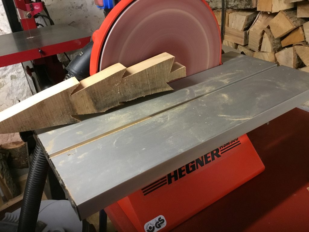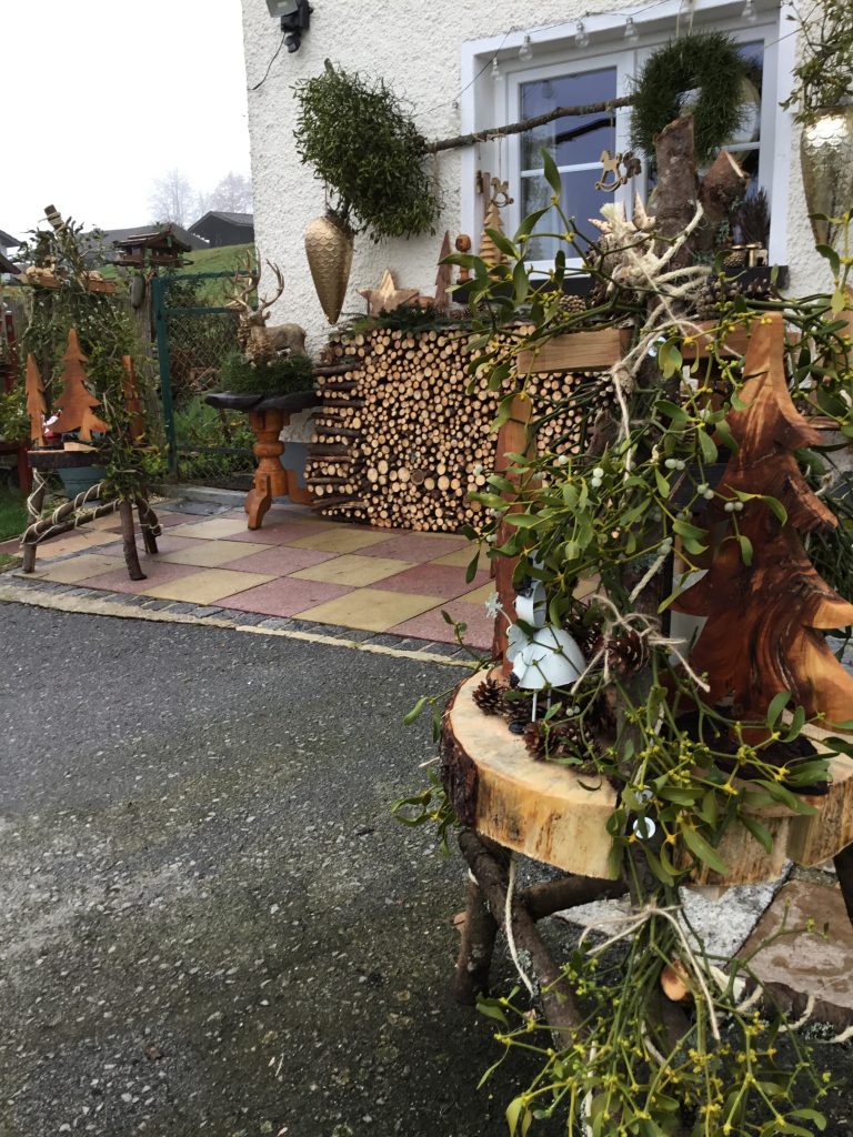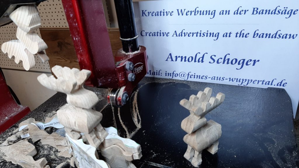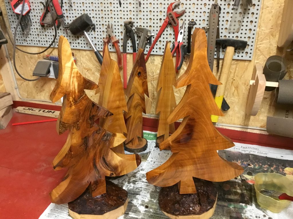 Die Weihnachtsdeko wurde zu großen Teilen aus Produkten aus dem Wald gefertigt. Die Bäume wurden aus Kirschholz ausgeschnitten; und die Oberfläche der ausgeschnittenen Objekte wurde mit dem Tellerschleifer von Hegner bearbeitet.