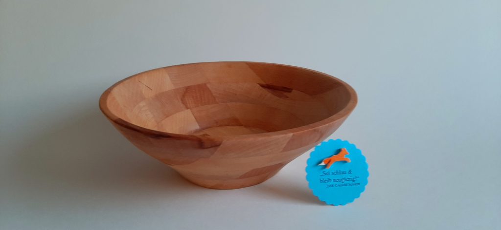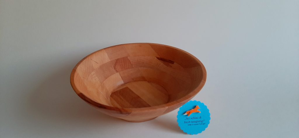 Solche Holzschalen säge ich als Geschenke für meine Freunde an der Dekupiersäge,- nach eigenem Entwurf, bzw eigener Sägevorlage. Diese Holzschale wurde nach der Verleimung der einzelnen „Kreissegmente“ geschliffen und lebensmittelecht geölt.