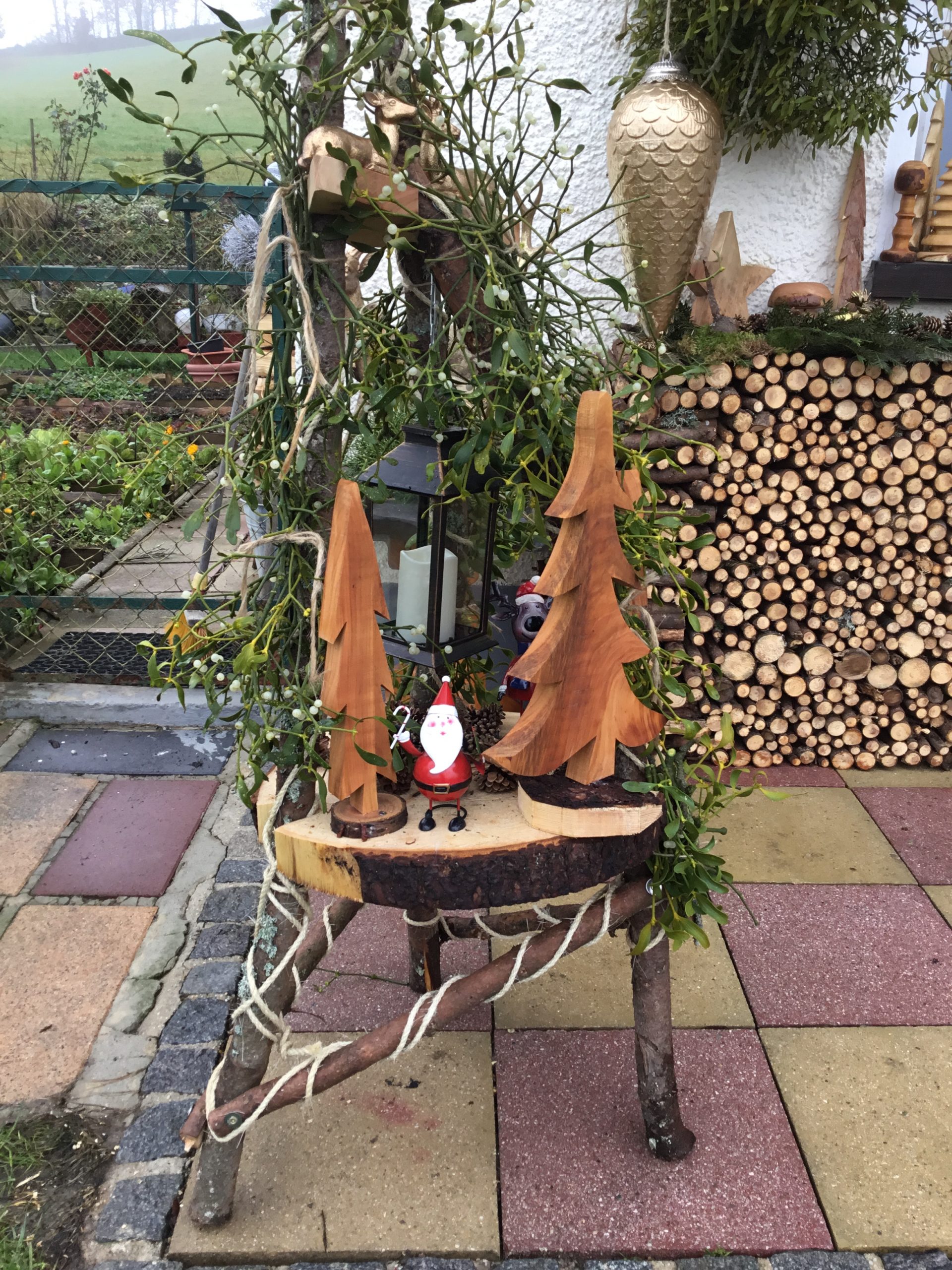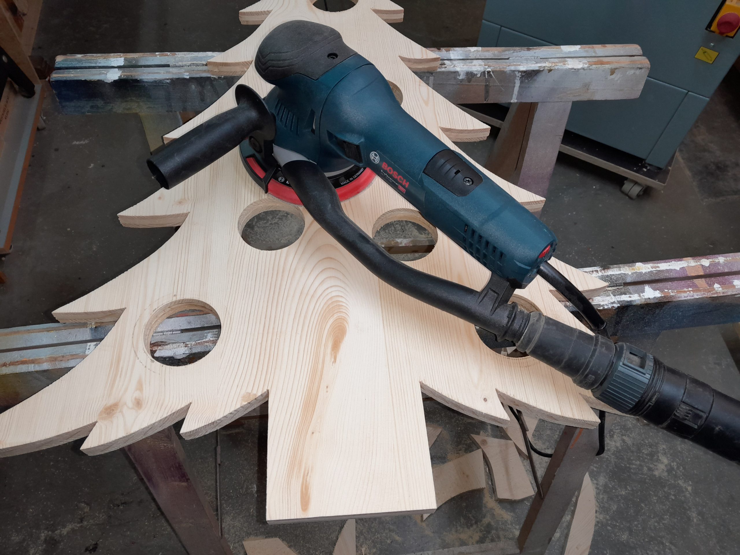 Die Weihnachtsdeko wurde zu großen Teilen aus Produkten aus dem Wald gefertigt. Die Bäume wurden aus Kirschholz ausgeschnitten; und die Oberfläche der ausgeschnittenen Objekte wurde mit dem Tellerschleifer von Hegner bearbeitet.
