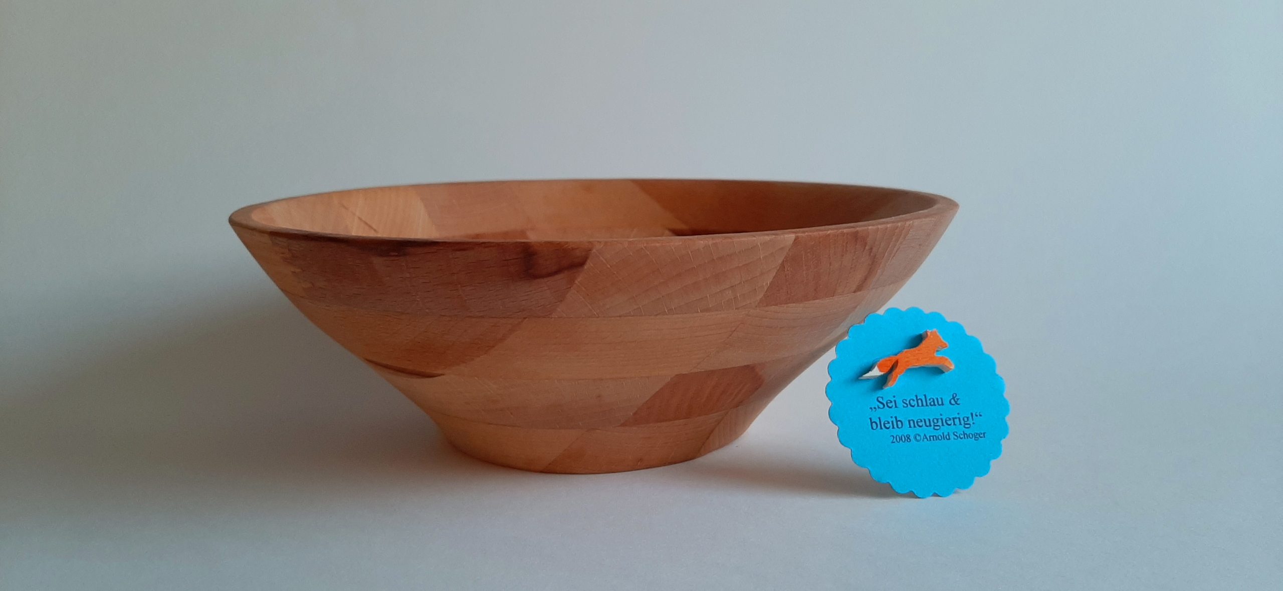Solche Holzschalen säge ich als Geschenke für meine Freunde an der Dekupiersäge,- nach eigenem Entwurf, bzw eigener Sägevorlage. Diese Holzschale wurde nach der Verleimung der einzelnen „Kreissegmente“ geschliffen und lebensmittelecht geölt.
