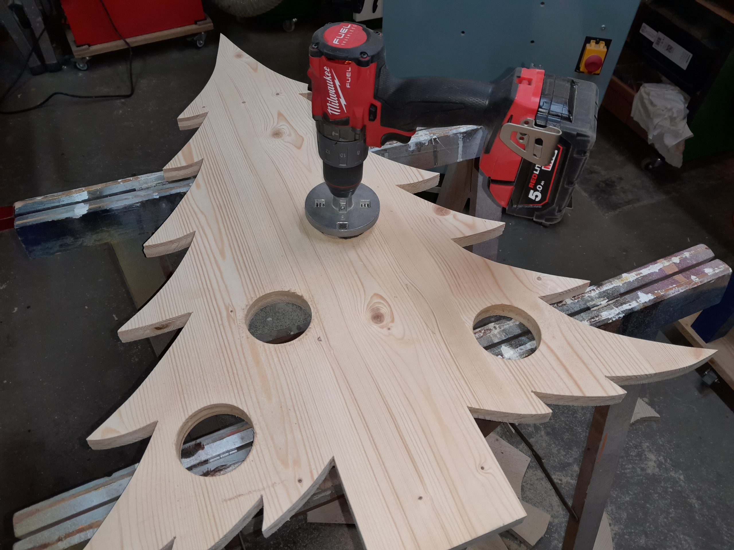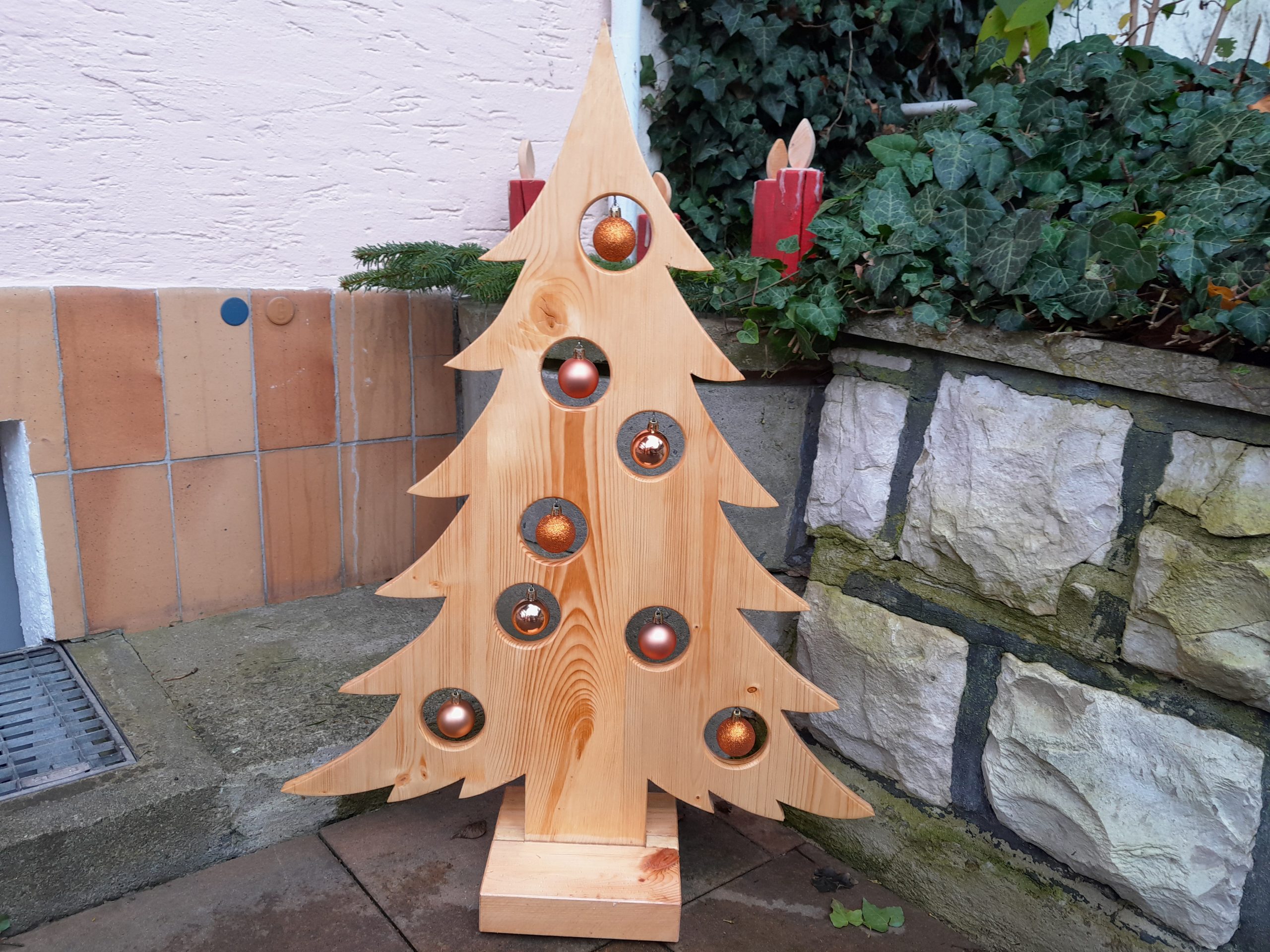Den Dekobaum habe ich aus einer Dreischichtplatte mit der Stichsäge ausgesägt. Anschließend wurden mit der Lochsäge die Bohrungen, in denen die Glaskugeln hängen, ausgearbeitet. Nachdem alles mit einem Exzenterschleifer geschliffen und der Standfuß befestigt wurde, konnte der Baum, welcher im Außenbereich steht, mit Wetterschutzlasur eingelassen werden.