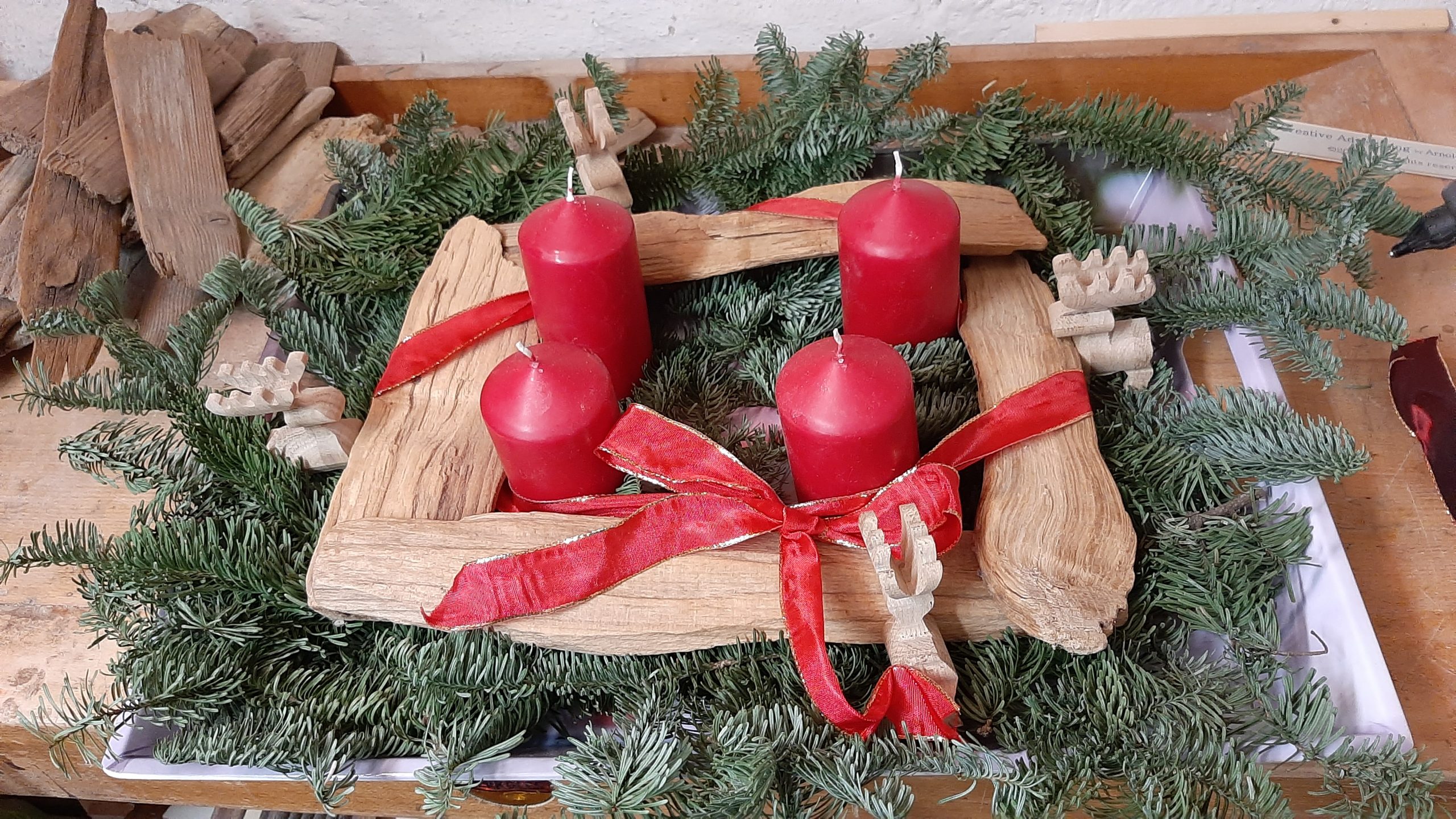 Diesen Adventskranz aus Holzscheiten & Tannengrün habe ich auf einem Serviertablett angerichtet, so dass er mitsamt dem Tablett leichter an den gewünschten Platz abgestellt werden kann. Zusätzlich zu den roten Stumpenkerzen, platzierte ich 4 meiner an der Bandsäge selbst gesägten 3D Rentiere, welche als Wächter der Kerzenflammen dienen sollen 😉 Die sauber gebürsteten Holzscheite habe ich mit Heißkleber zusammengefügt/zusammengeklebt.