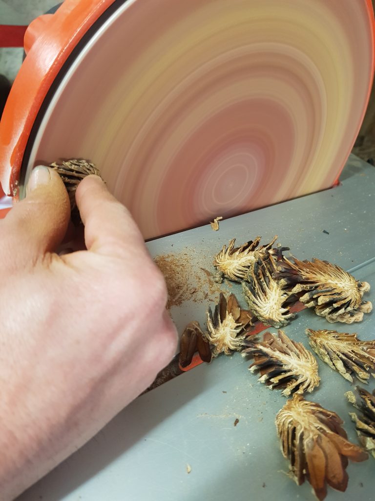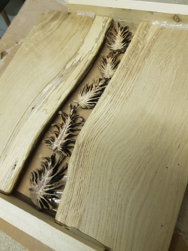 Schöne Wanduhr aus Epoxidharz. In das Epoxidharz wurden Kiefernzapfen und Marmorkies gelegt. Für eine tolle Optik. Die Kieferzapfen wurden mit einer Pégas Feinschnitt-Bandsäge geschnitten und anschließend auf einer Hegner Tellerschleifmaschine geschliffen. Das Quartzuhrwerk ist lautlos tickend. Die Größe der Uhr beträgt ca.30x30cm