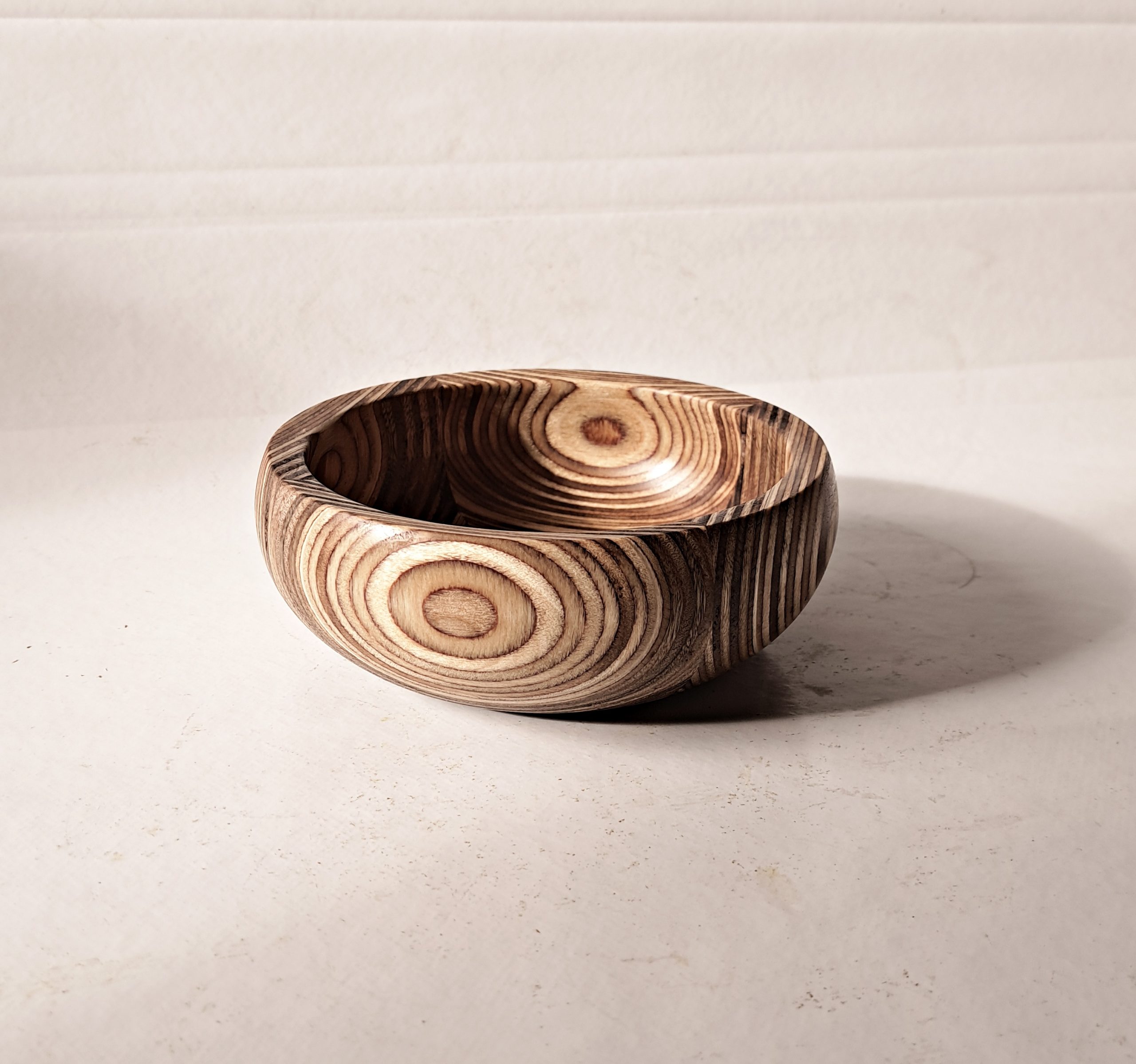 Kleine Schale aus Multiplex verleimt, 14 x 5cm geschliffen bis Körnung 500 und 3x mit Tungöl von DICTUM eingelassen.