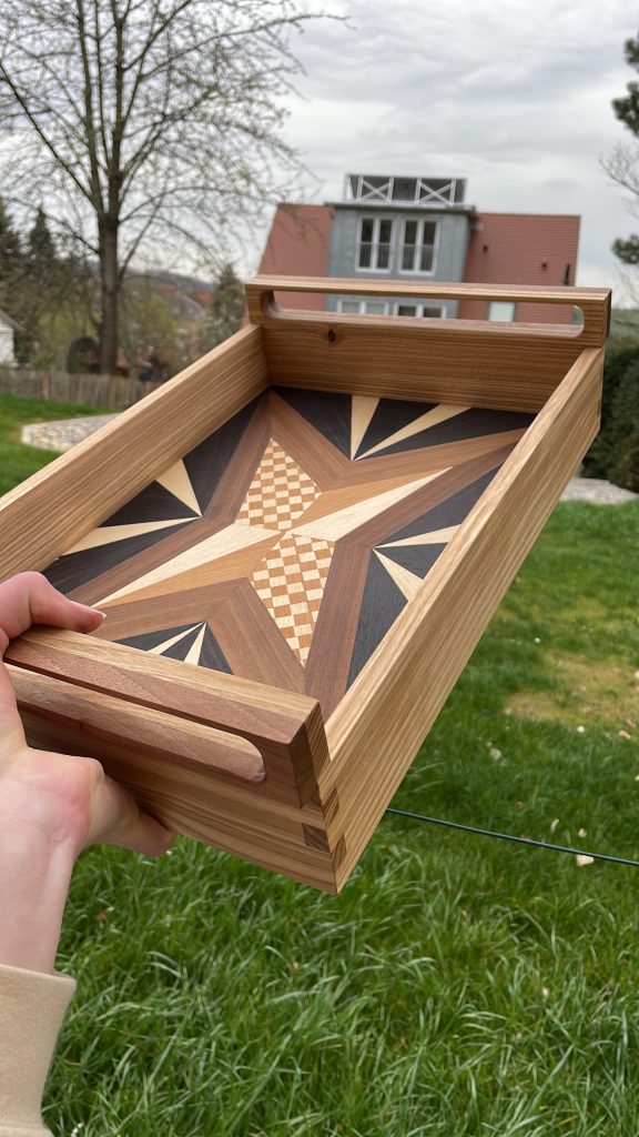 Ich möchte euch heute mein Serviertablett vorstellen, welches ich in der ein jährigen Berufsschule angefertigt habe. Am schwierigsten war wirklich die technische Zeichnung des Funierbildes mit Bemaßung der einzelnen Ecken und den ganzen Winkel. Das Funierbild habe ich aus heimischen und tropischen Funier hergestellt. Nach ca. einer Woche war es dann so weit und ich konnte mit den Stemmarbeiten anfangen. Heimische Esche und Nuss, die ich für das anfertigen der Griffe und des Rahmens, welcher auf Gehrung mit Nut für den Boden und Fingerverzinkung hergestellt habe. Hier das fertige Ergebnis:
