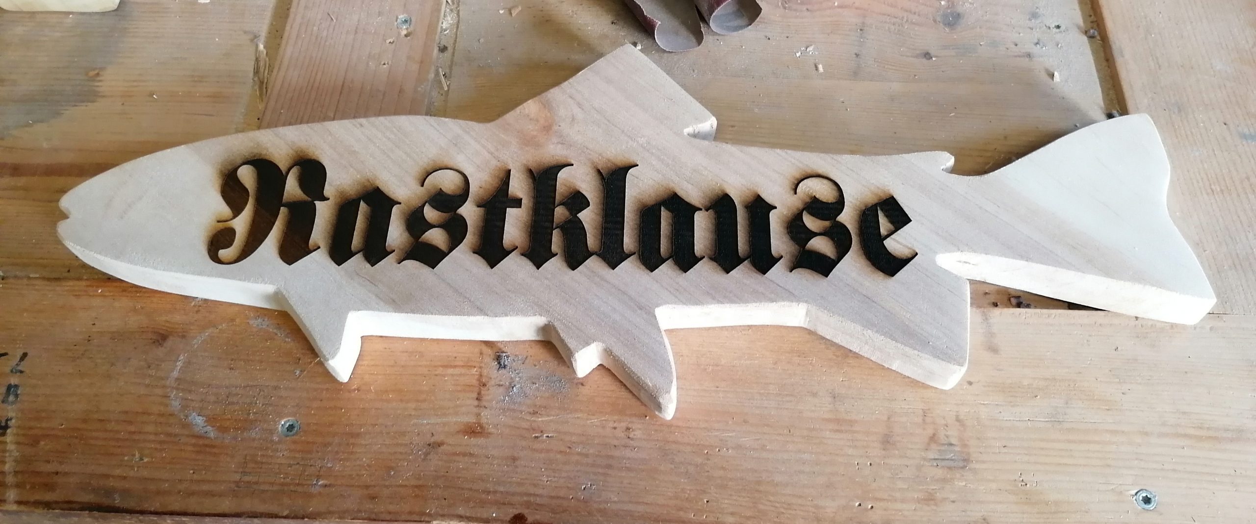 Für einen Kollegen habe ich aus einem Buchenbrett mit der Bandsäge eine Forelle ausgeschnitten und den Namen seines neuen Fischweihers aufgebrannt. Das Schild ziert nun den Mönch seines neuen Weihers.