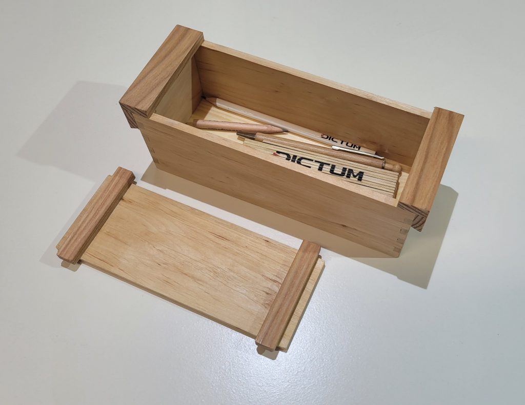 Griffelschachtel in der Bauart einer japanischen Werkzeugkiste, hergestellt aus Holzresten einer alten Palette. Verwendetes Werkzeug Handhobel, Nut- und Grundhobel, Streichmaß, Stemmeisten, Laubsäge uvm.